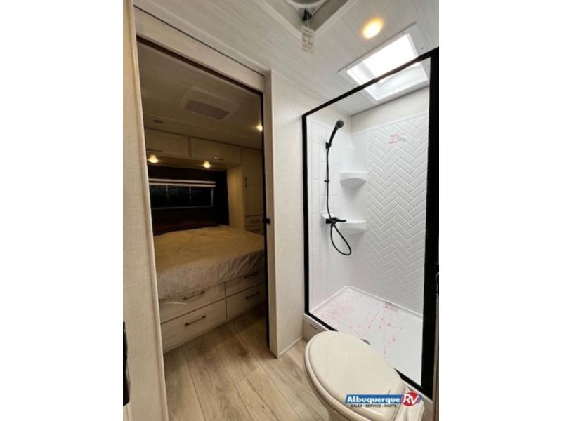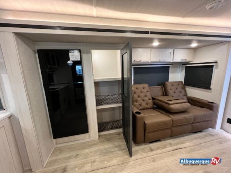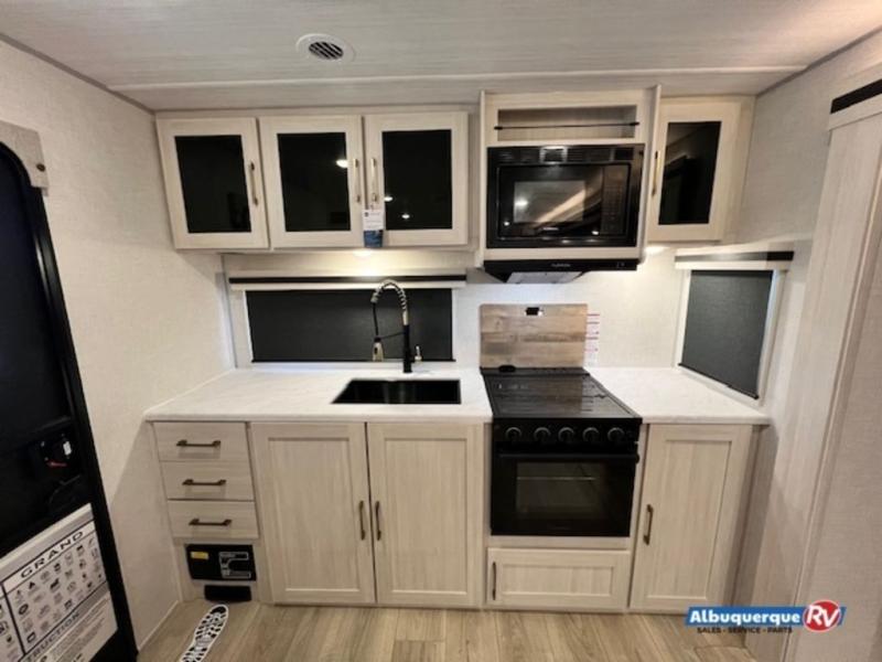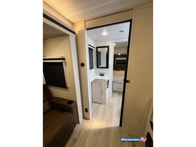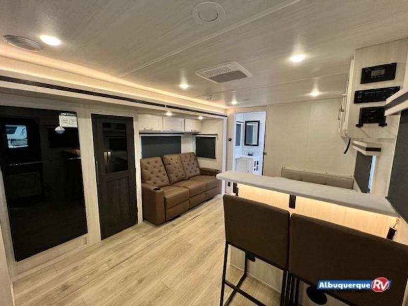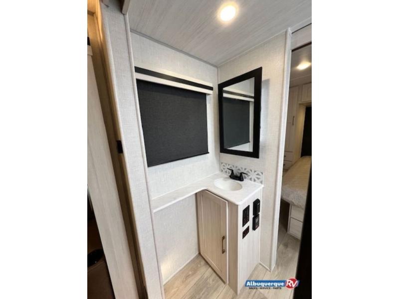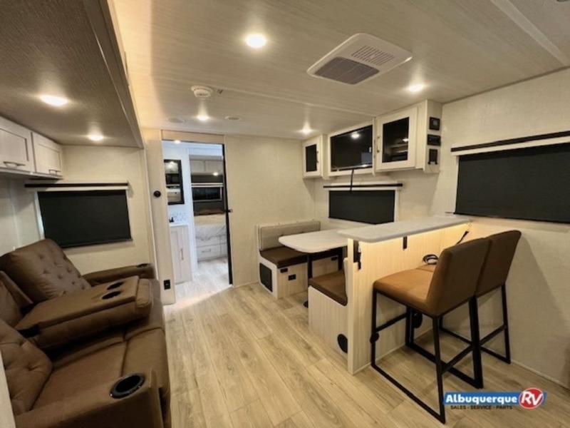 You'll love every minute spent in this cozy and convenient travel trailer. Since there are dual entry doors, you can enter in through the front master bedroom with a queen bed or the rear kitchen with ample counter space! A walk-thru bath will be easily accessible for everyone to use, and there is a night light here so you don't wake your crew up in the middle of the night. The tri-fold sofa slide in the main living area will provide a cozy seating space, as well as sleeping space for guests. And you can dine each day at the booth dinette or at the bartop with two seats that overlook the dinette!