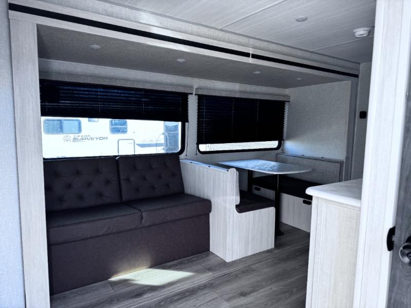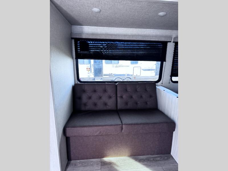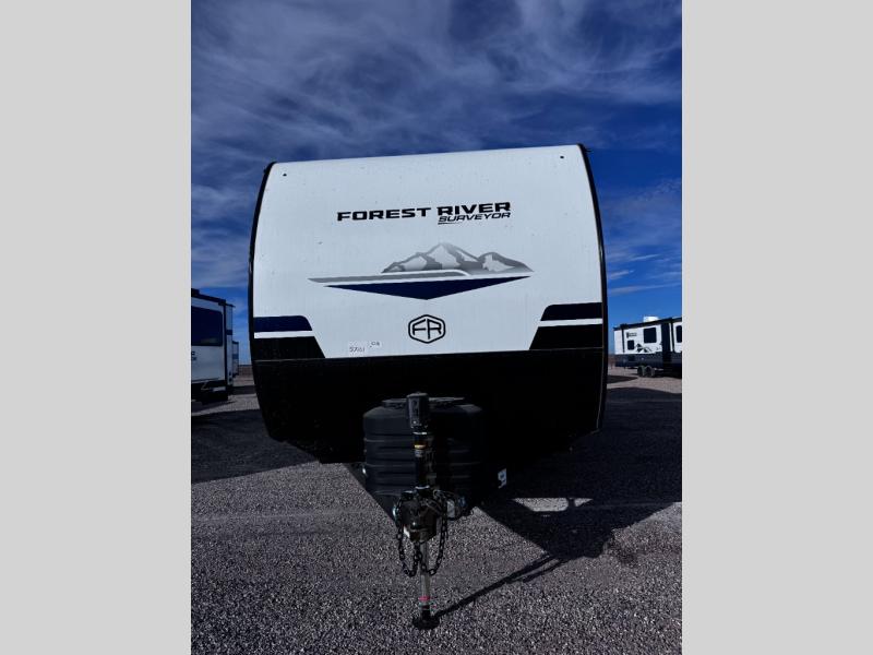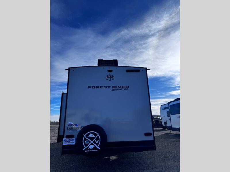 Value and versatility go hand-in-hand with the Surveyor Legend X travel trailers by Forest River. The solid construction includes a 2" aluminum framed floor with block foam insulation and a sealed underbelly with forced heat and radiant foil insulation. A 100-watt roof mounted solar panel will provide some off-grid power, and the power tongue jack will let you easily hitch up and go whenever you're ready. Additional stand-out features include Surf(X) seamless countertops throughout, two A/C units, an electric awning with LED light strip, black glass friction hinge entry door(s), and so much more!