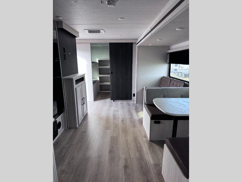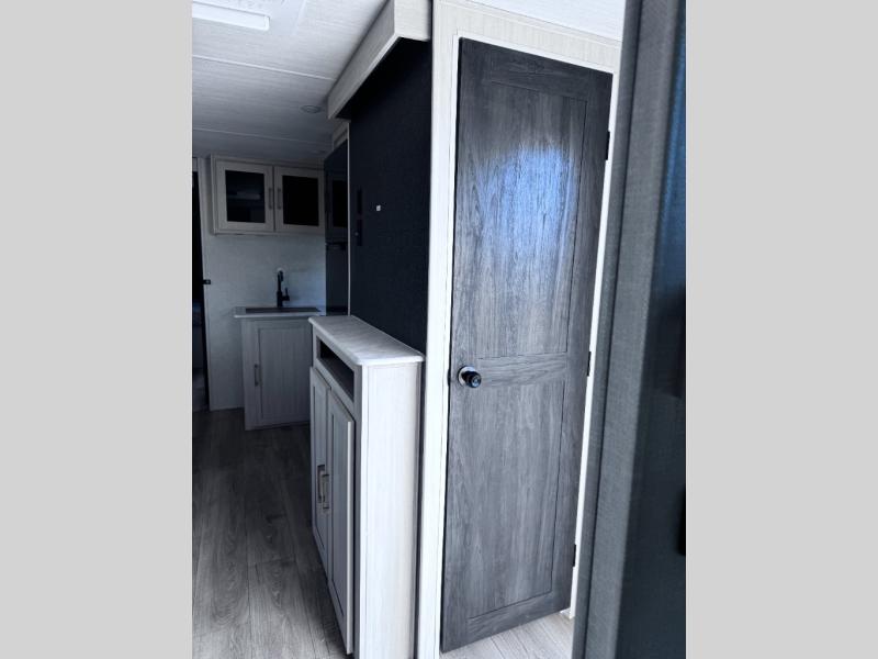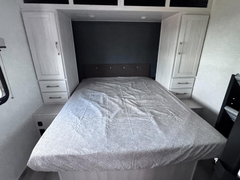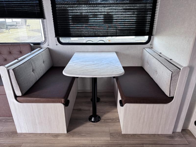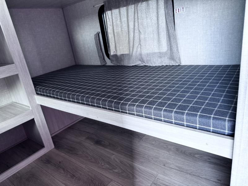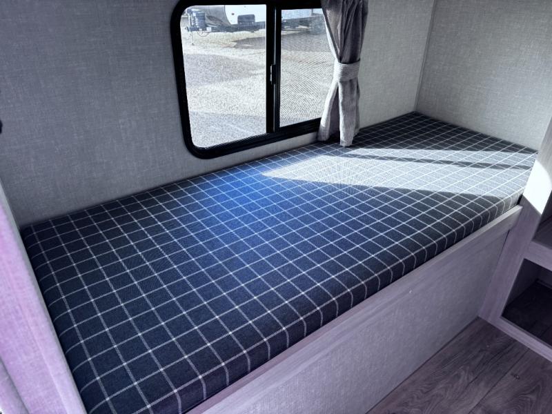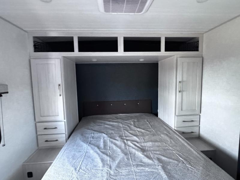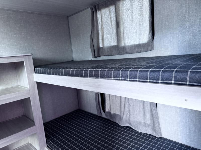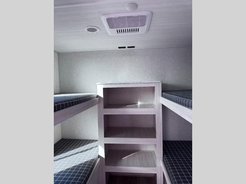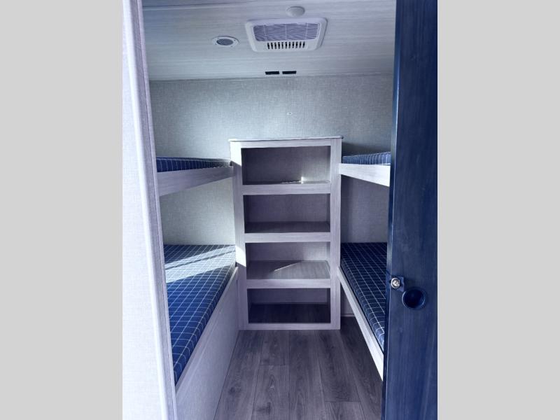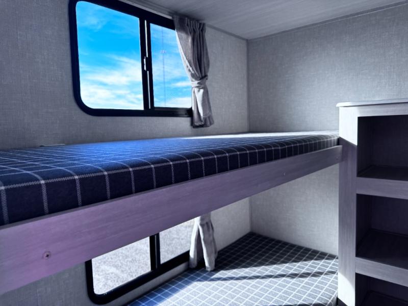 Head to your favorite camping spot with your favorite people in this spacious, dual entry travel trailer! The large slide out houses the booth dinette and sofa where you can relax in the evenings and even let guests sleep over who haven't claimed the quad bunks in the rear bunkhouse. A walk-thru bath is convenient for all, and the full kitchen lets you whip up your best meals in the microwave with an air fryer. And a walk-in pantry with washer and dryer prep makes it easier to go full-time if you choose! When it's time to call it a night, the front master bedroom with a queen bed will provide you with your own space to retreat to, and there are dual bedside wardrobes to keep your clothes organized.