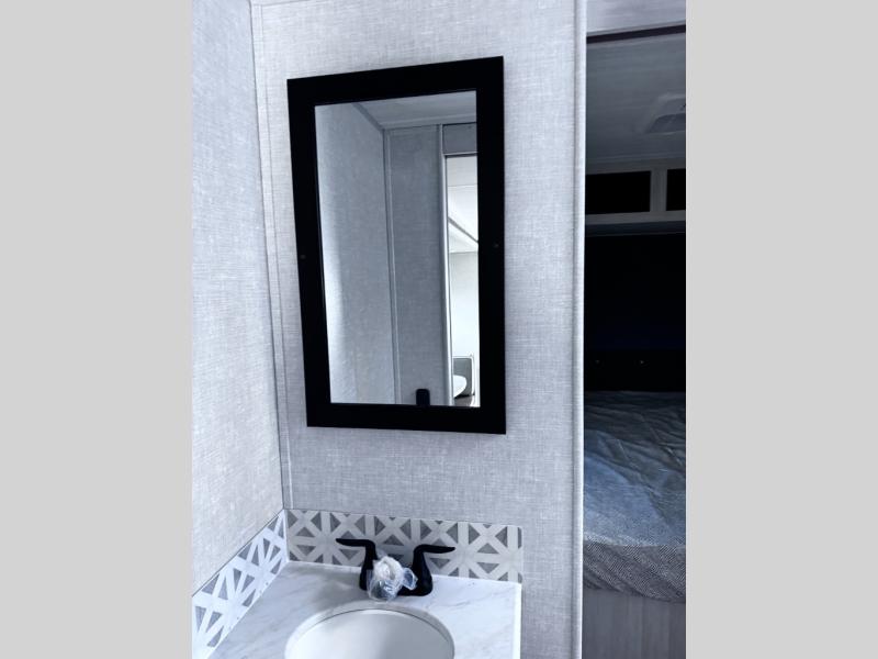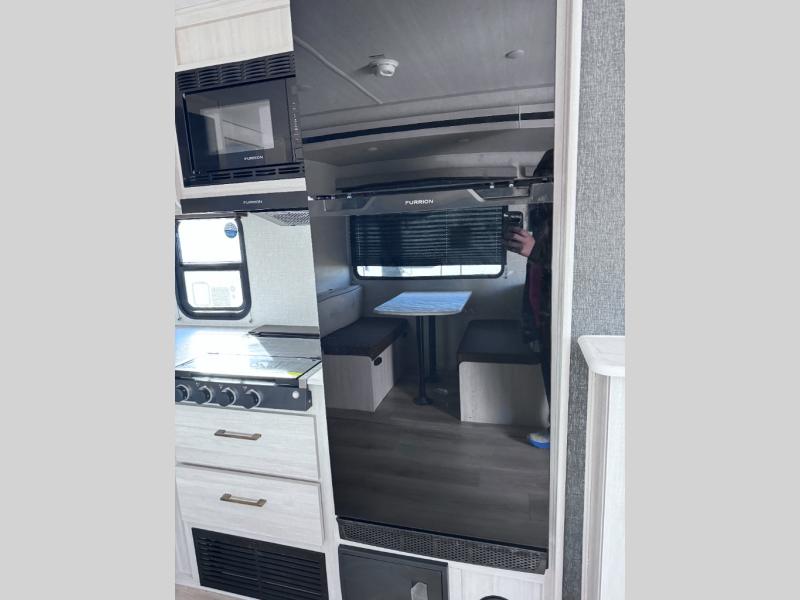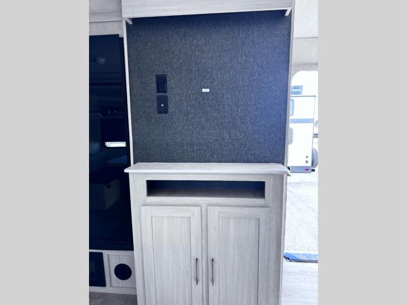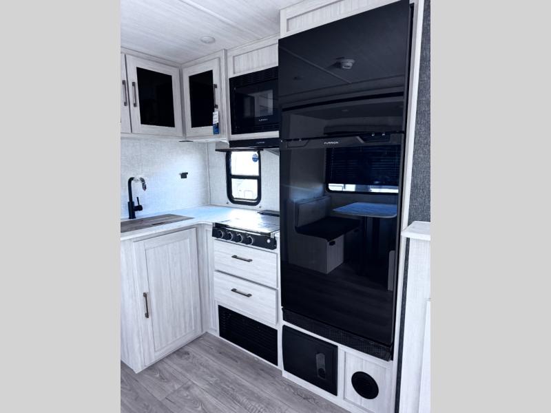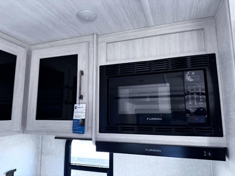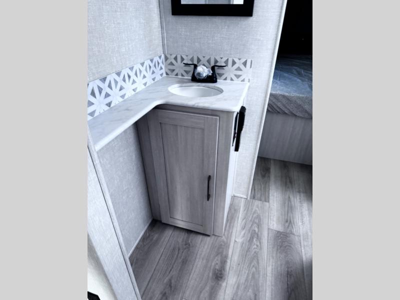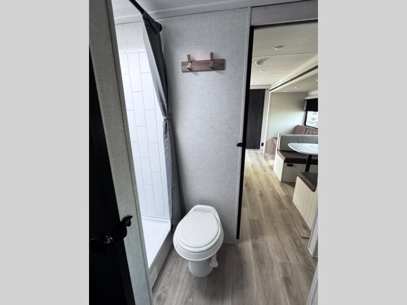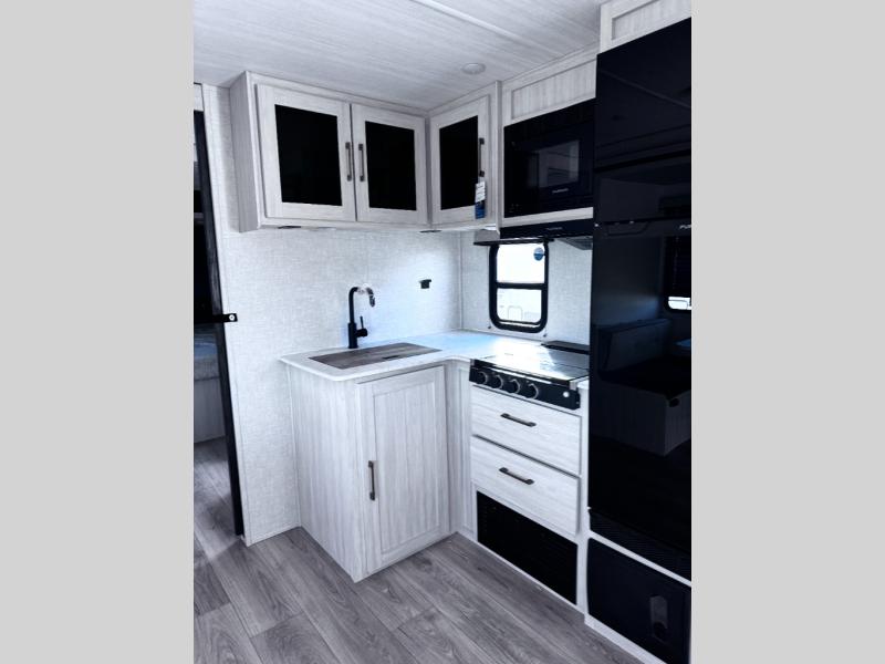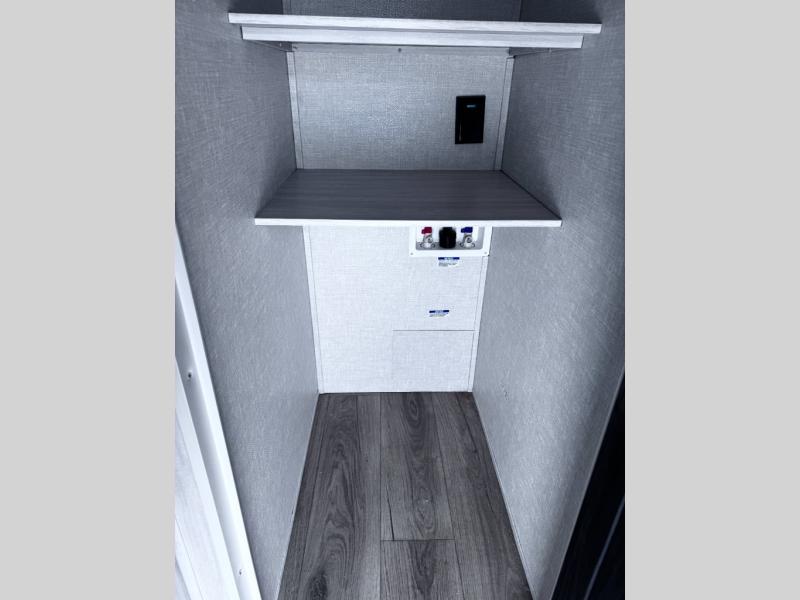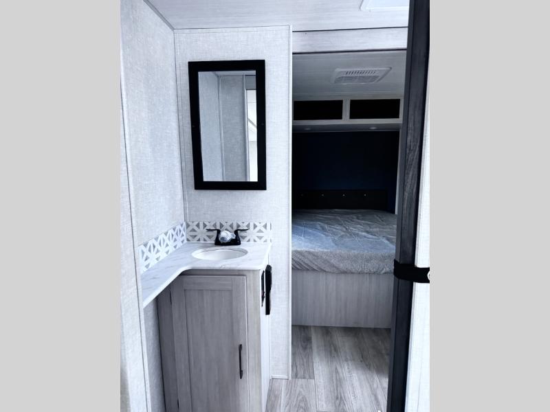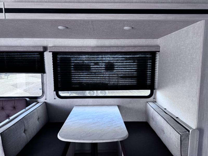 Head to your favorite camping spot with your favorite people in this spacious, dual entry travel trailer! The large slide out houses the booth dinette and sofa where you can relax in the evenings and even let guests sleep over who haven't claimed the quad bunks in the rear bunkhouse. A walk-thru bath is convenient for all, and the full kitchen lets you whip up your best meals in the microwave with an air fryer. And a walk-in pantry with washer and dryer prep makes it easier to go full-time if you choose! When it's time to call it a night, the front master bedroom with a queen bed will provide you with your own space to retreat to, and there are dual bedside wardrobes to keep your clothes organized.