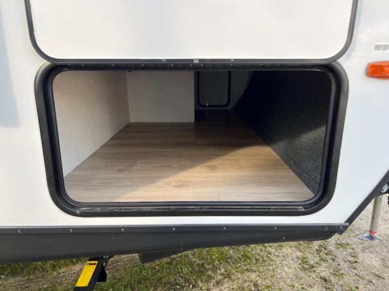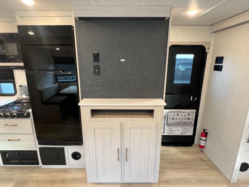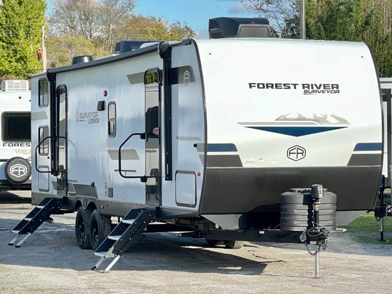 Value and versatility go hand-in-hand with the Surveyor Legend X travel trailers by Forest River. The solid construction includes a 2" aluminum framed floor with block foam insulation and a sealed underbelly with forced heat and radiant foil insulation. A 100-watt roof mounted solar panel will provide some off-grid power, and the power tongue jack will let you easily hitch up and go whenever you're ready. Additional stand-out features include Surf(X) seamless countertops throughout, two A/C units, an electric awning with LED light strip, black glass friction hinge entry door(s), and so much more!
