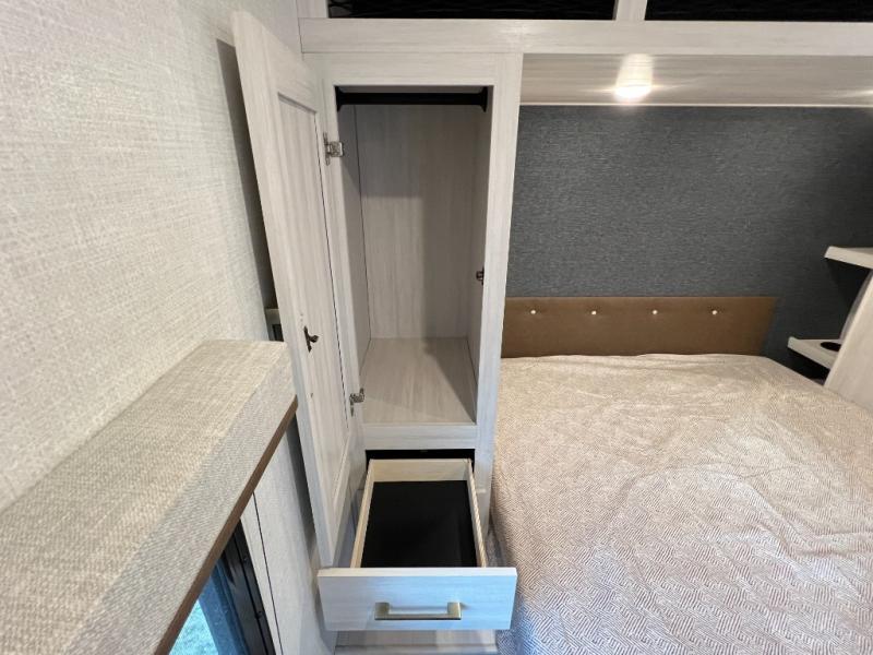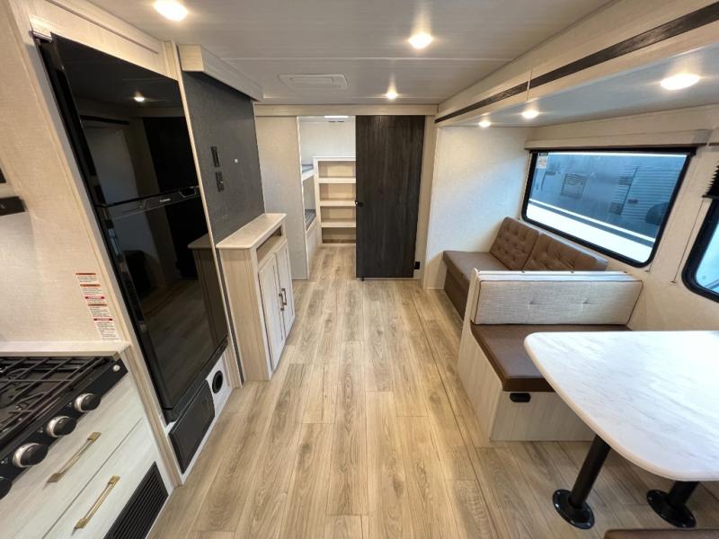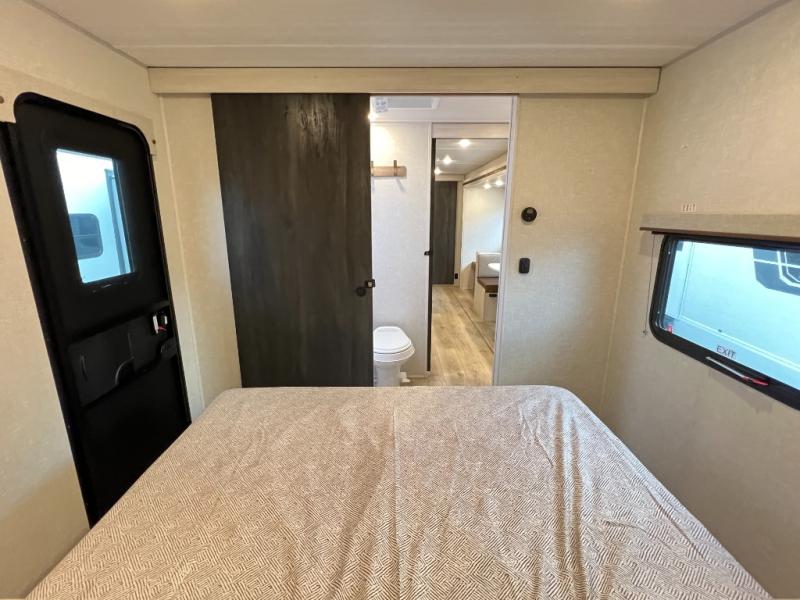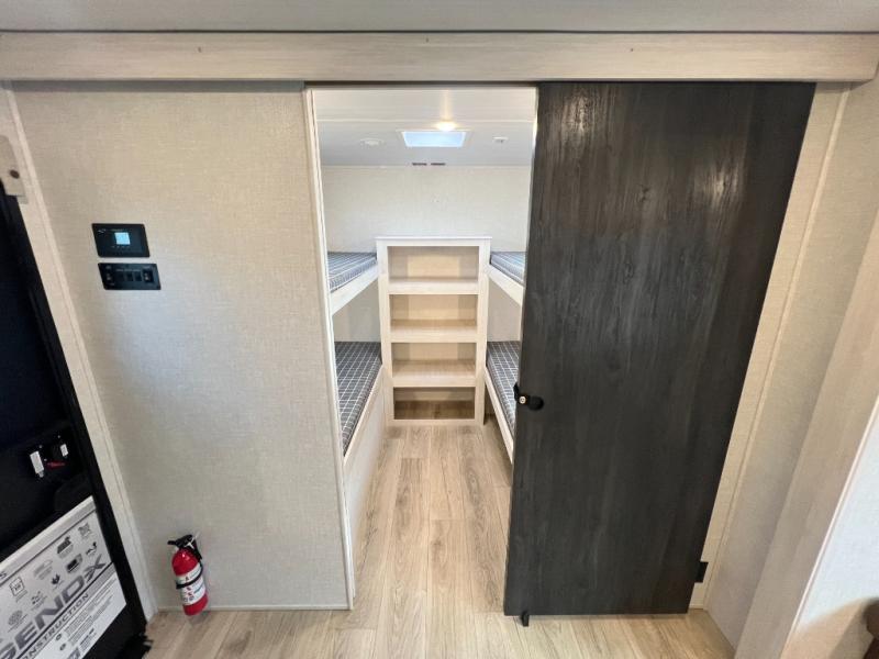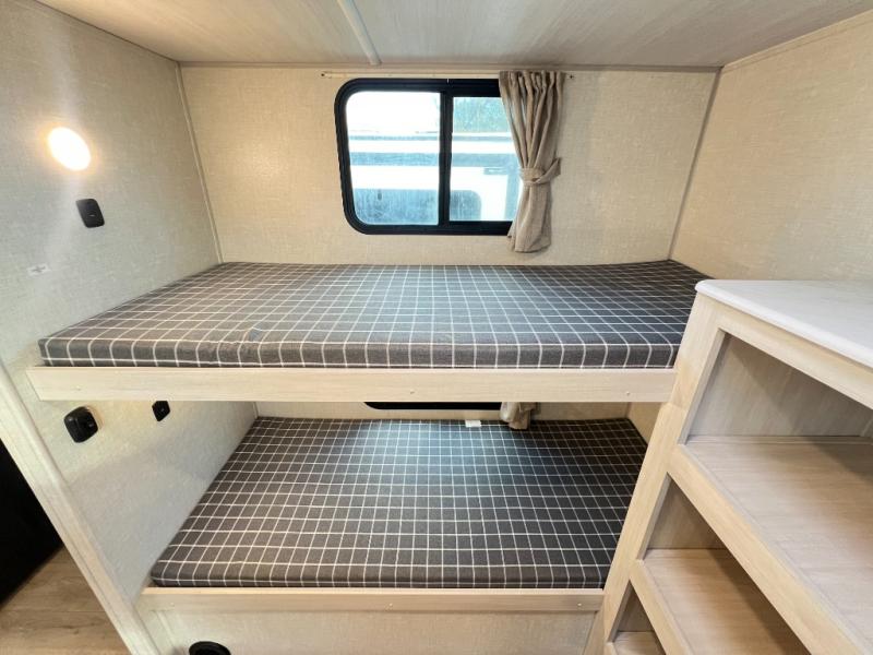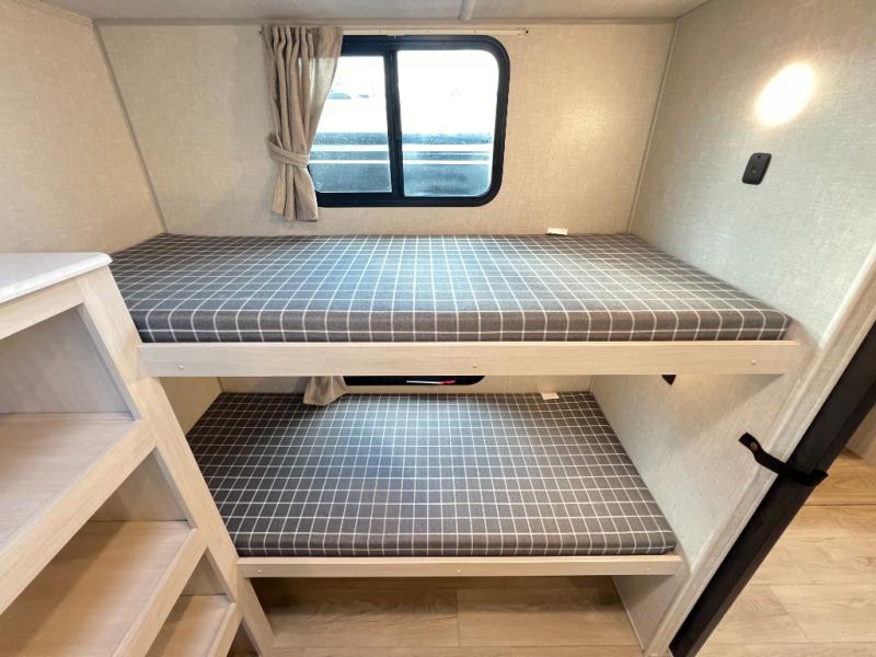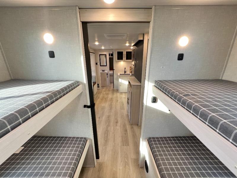 Head to your favorite camping spot with your favorite people in this spacious, dual entry travel trailer! The large slide out houses the booth dinette and sofa where you can relax in the evenings and even let guests sleep over who haven't claimed the quad bunks in the rear bunkhouse. A walk-thru bath is convenient for all, and the full kitchen lets you whip up your best meals in the microwave with an air fryer. And a walk-in pantry with washer and dryer prep makes it easier to go full-time if you choose! When it's time to call it a night, the front master bedroom with a queen bed will provide you with your own space to retreat to, and there are dual bedside wardrobes to keep your clothes organized.