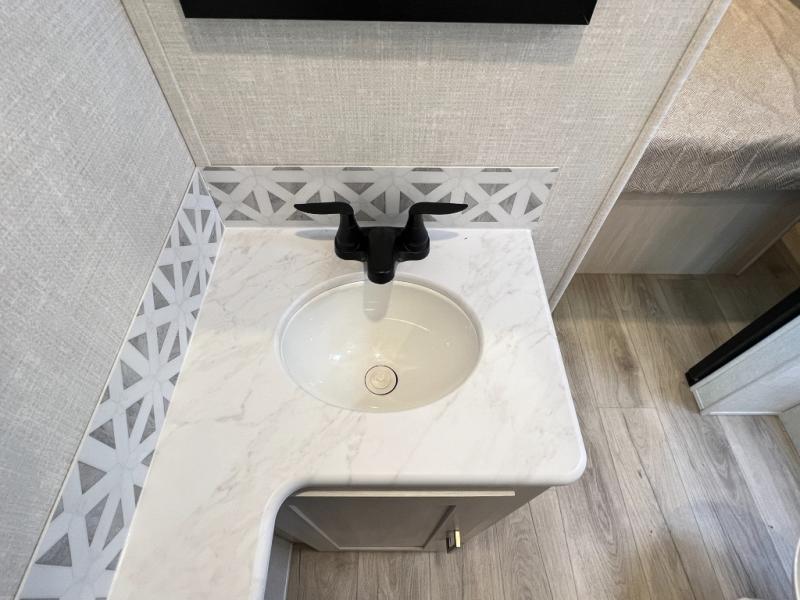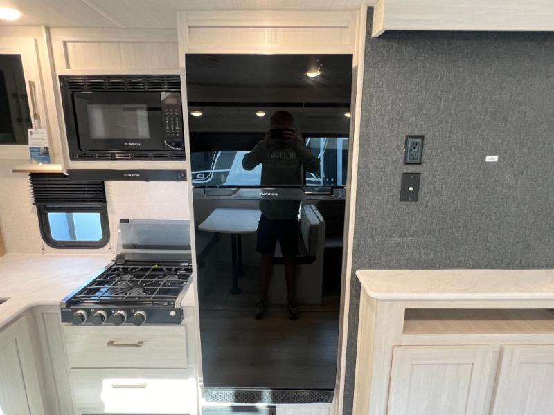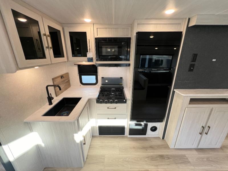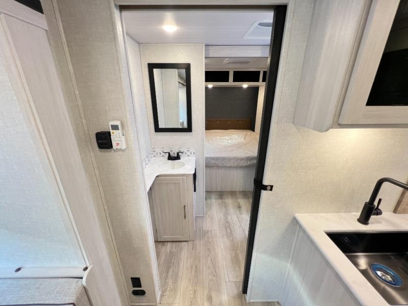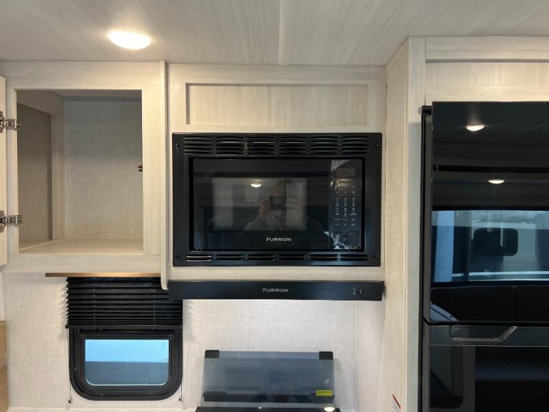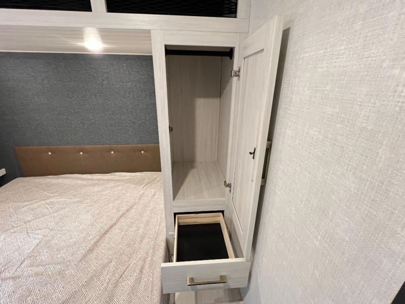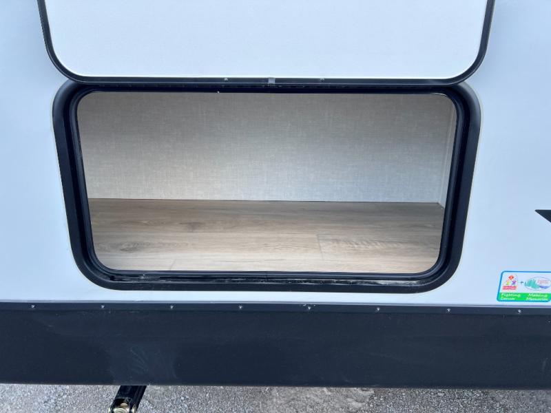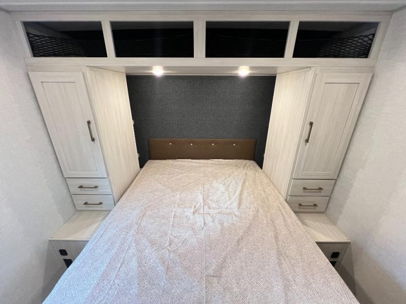 Head to your favorite camping spot with your favorite people in this spacious, dual entry travel trailer! The large slide out houses the booth dinette and sofa where you can relax in the evenings and even let guests sleep over who haven't claimed the quad bunks in the rear bunkhouse. A walk-thru bath is convenient for all, and the full kitchen lets you whip up your best meals in the microwave with an air fryer. And a walk-in pantry with washer and dryer prep makes it easier to go full-time if you choose! When it's time to call it a night, the front master bedroom with a queen bed will provide you with your own space to retreat to, and there are dual bedside wardrobes to keep your clothes organized.