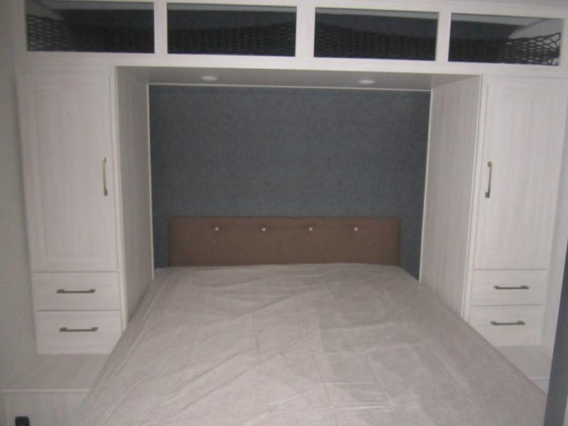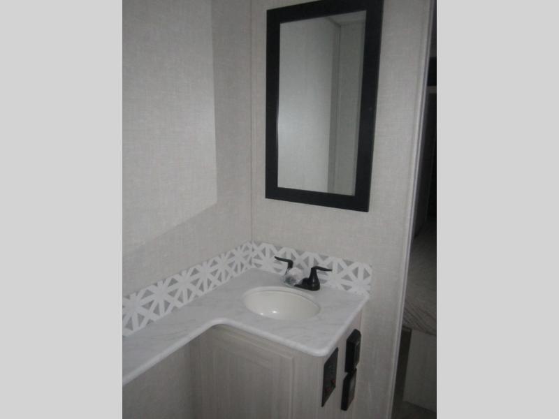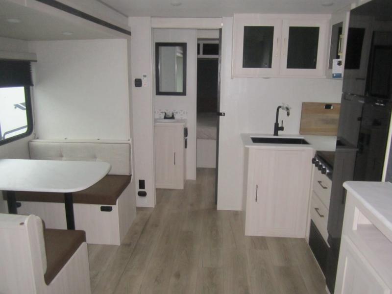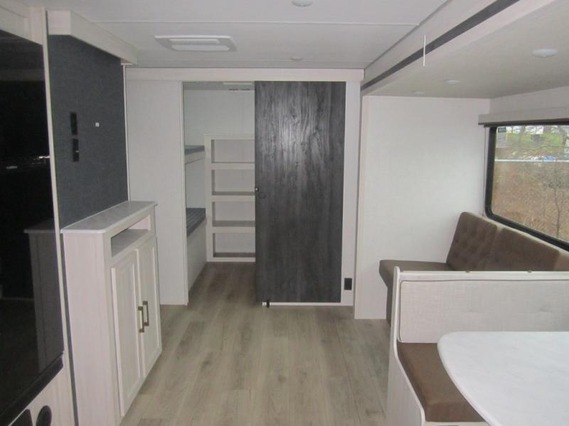 Head to your favorite camping spot with your favorite people in this spacious, dual entry travel trailer! The large slide out houses the booth dinette and sofa where you can relax in the evenings and even let guests sleep over who haven't claimed the quad bunks in the rear bunkhouse. A walk-thru bath is convenient for all, and the full kitchen lets you whip up your best meals in the microwave with an air fryer. And a walk-in pantry with washer and dryer prep makes it easier to go full-time if you choose! When it's time to call it a night, the front master bedroom with a queen bed will provide you with your own space to retreat to, and there are dual bedside wardrobes to keep your clothes organized.