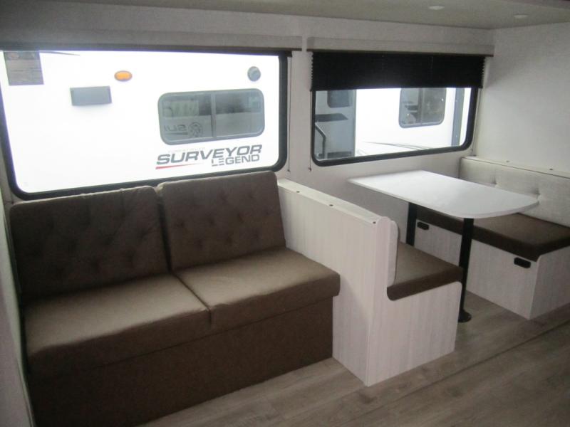 Value and versatility go hand-in-hand with the Surveyor Legend X travel trailers by Forest River. The solid construction includes a 2" aluminum framed floor with block foam insulation and a sealed underbelly with forced heat and radiant foil insulation. A 100-watt roof mounted solar panel will provide some off-grid power, and the power tongue jack will let you easily hitch up and go whenever you're ready. Additional stand-out features include Surf(X) seamless countertops throughout, two A/C units, an electric awning with LED light strip, black glass friction hinge entry door(s), and so much more!