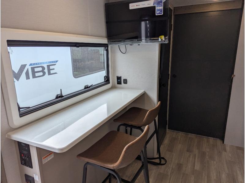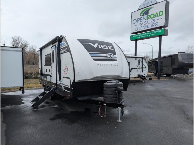 Each Vibe travel trailer by Forest River includes Hyper Lyte construction and a durable laminated "Aluma Frame" for years of use. The heated and enclosed underbelly allows you to extend your camping season, and the walk-on truss roof with XTRM PVC roofing will be easy to keep clean. Inside, you'll enjoy the custom built cabinetry, solid surface thermofoil wrapped kitchen countertops, and ultra bright LED lighting throughout. These models also include cable and satellite prep and a digital TV antenna with a booster so you can stay connected to the outside world if you choose. Make the easy choice and choose a Vibe travel trailer today!