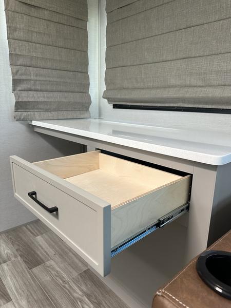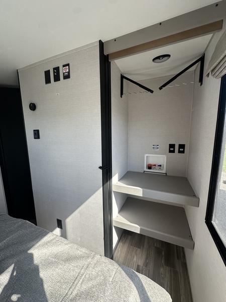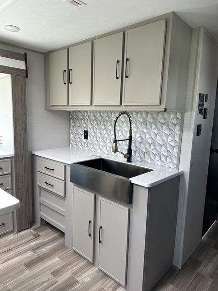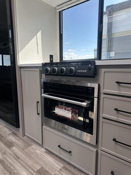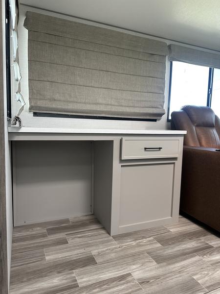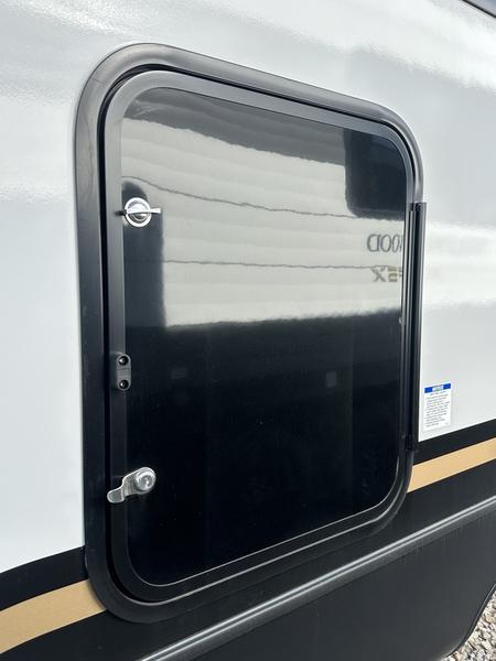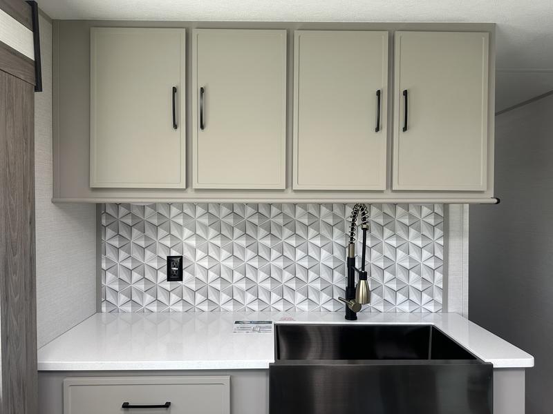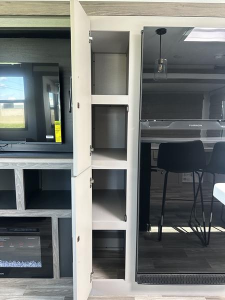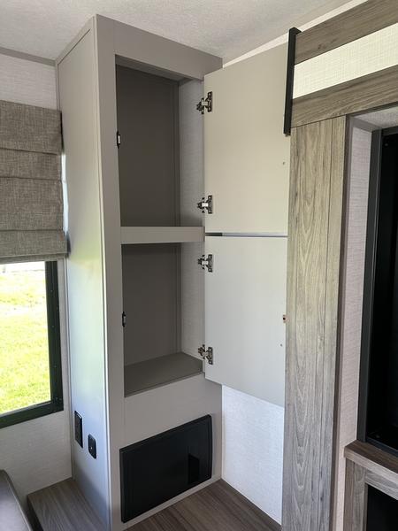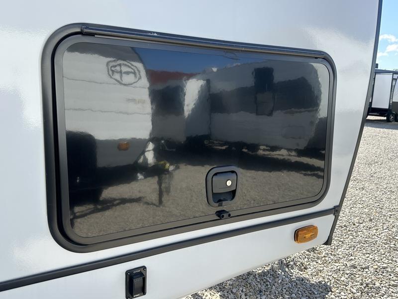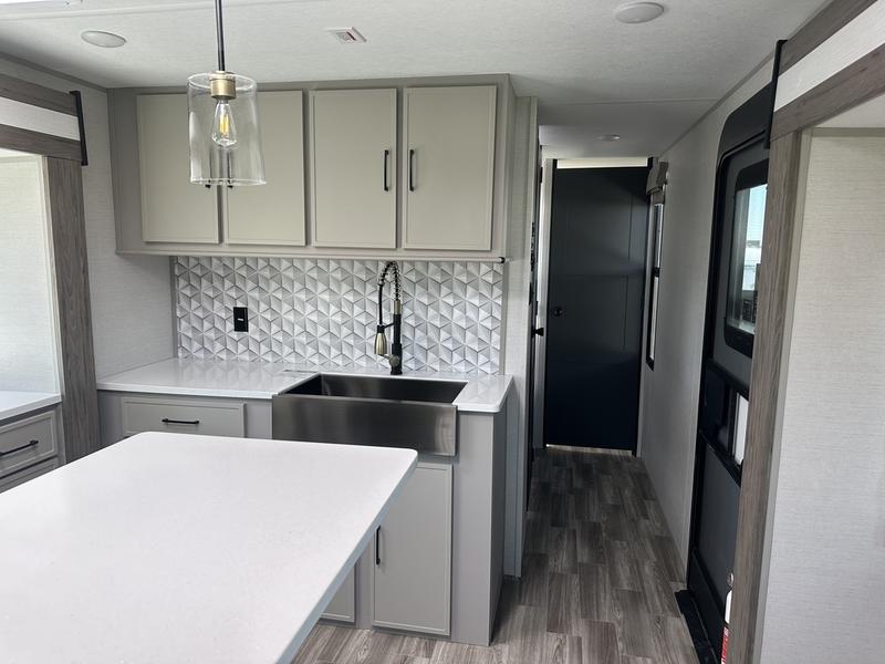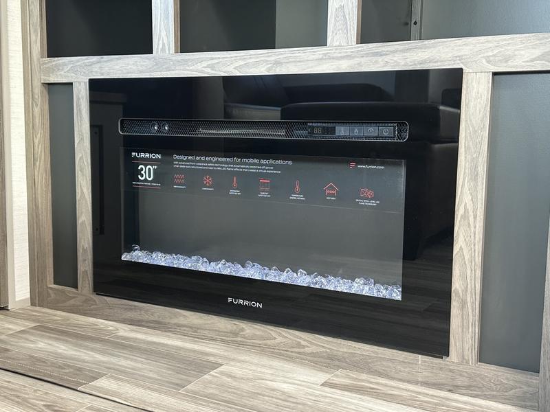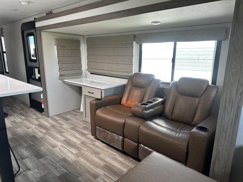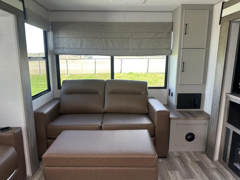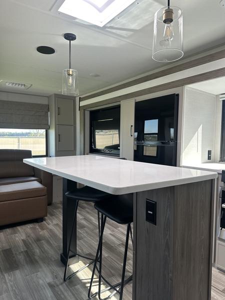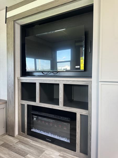 This travel trailer allows you to enjoy the great outdoors without having to give up your creature comforts. The dual opposing slides provide the chef space to work around the kitchen island, and there is plenty of seating space for your guests on the theater seating or the sleeper sofa, plus there's a desk area with chair so you can work on the go. The fireplace with a TV above will be perfect for those rainy days, and there is even a large skylight to let natural light into the living room. This model also includes Sure-Step entry steps, pass-through storage, plus two power awnings with LED lights so you can spend more time outdoors with friends and family!