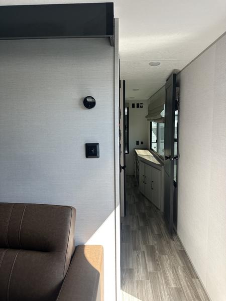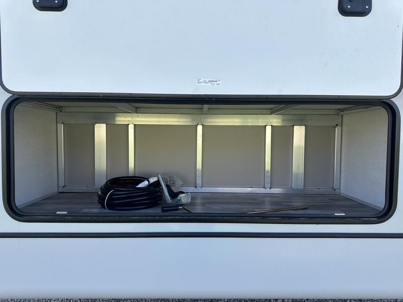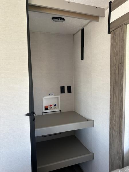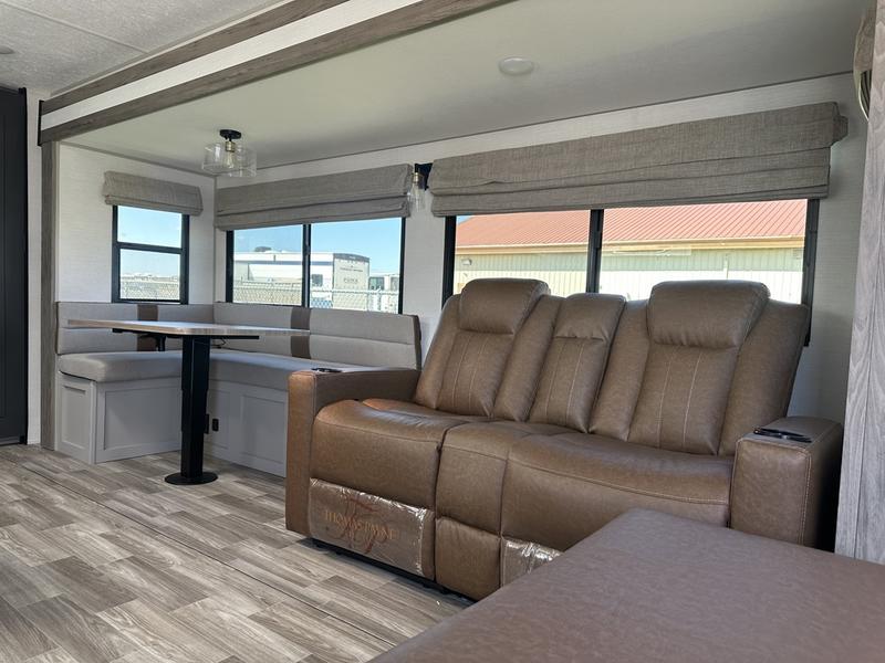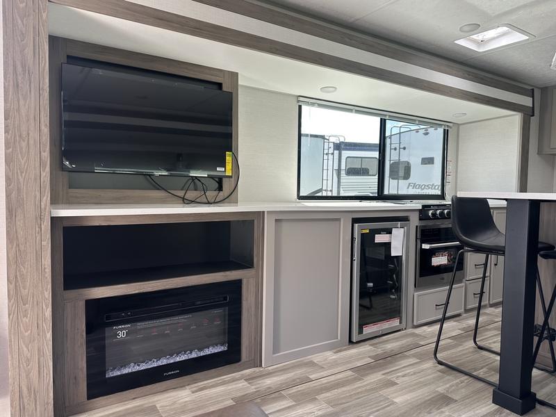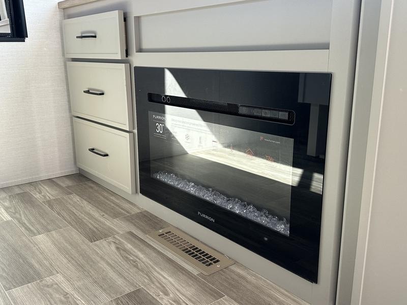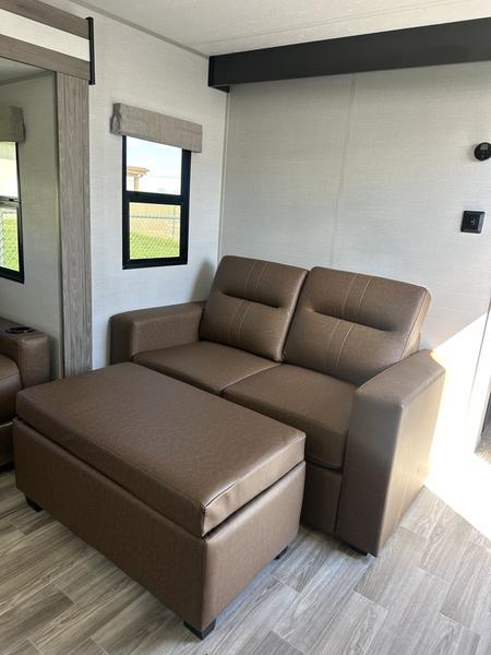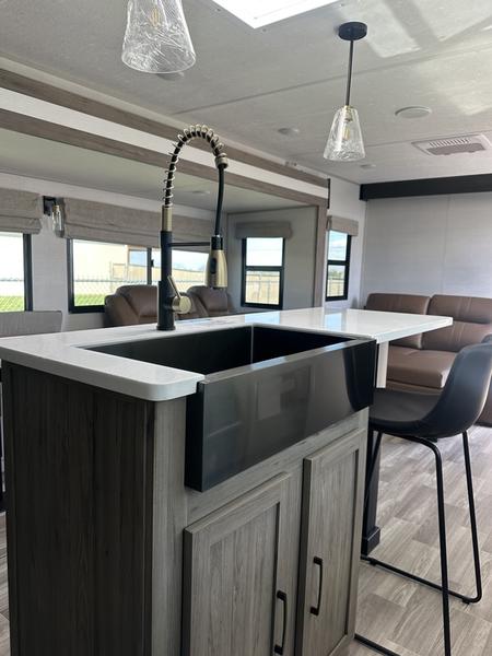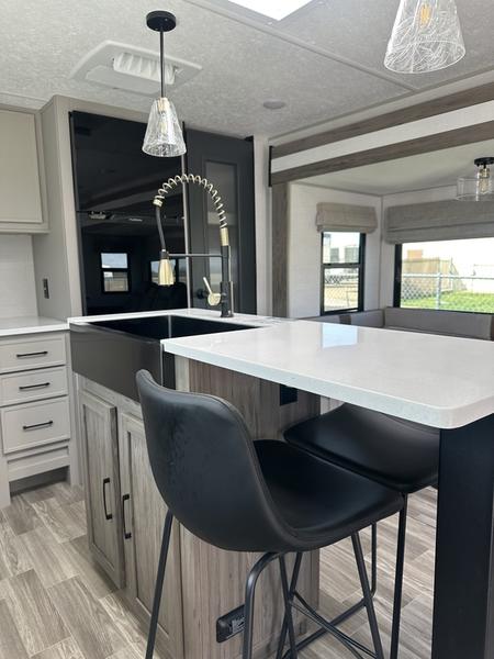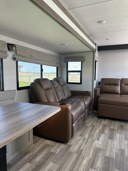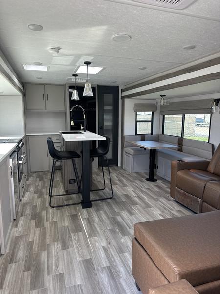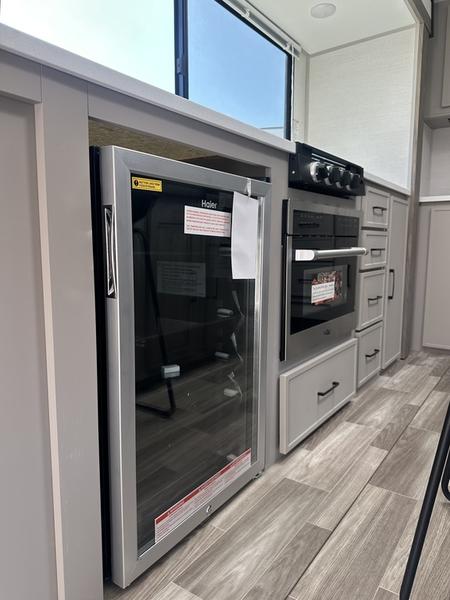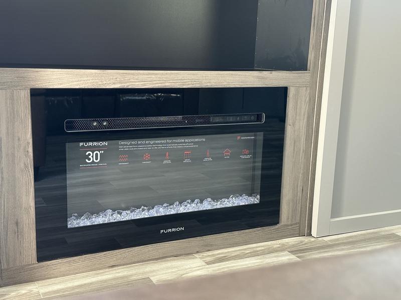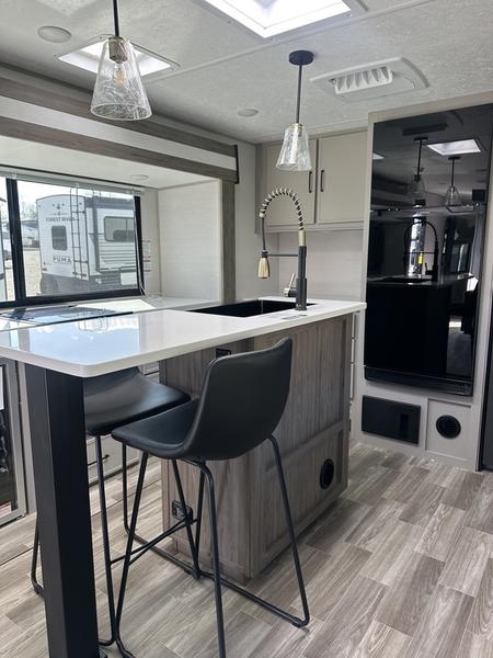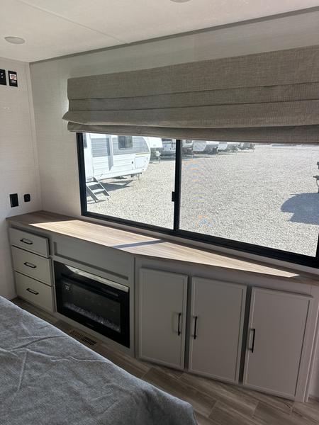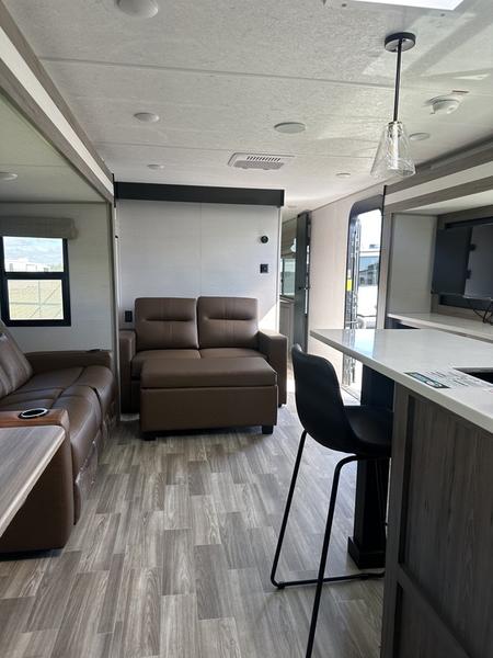 You won't believe all that this travel trailer has to offer! The rear kitchen includes a spacious pantry and a coffee bar/hutch for additional storage space. The kitchen island makes meal prepping easier, and the beverage cooler helps save space in your refrigerator for perishables. The kitchen skylight brings in natural lighting. Relax each night on either the tri-fold sofa or theater seating across from the entertainment center with a fireplace, or you can play some games at the 5-person dinette. As you enter the bathroom, you will notice the washer and dryer prep that will give you the ability to add these appliances. The front private bedroom has a custom king bed slide with nightstands on either side with power to charge your electronics while you recharge. The exterior not only has pass-through storage and a power awning, but also a 64" x 20" baggage door!