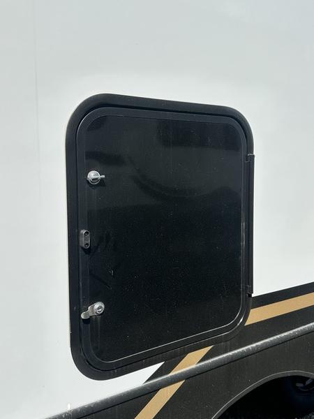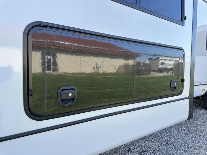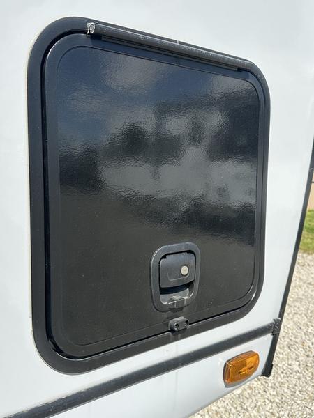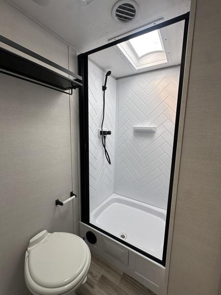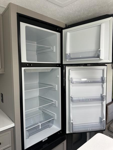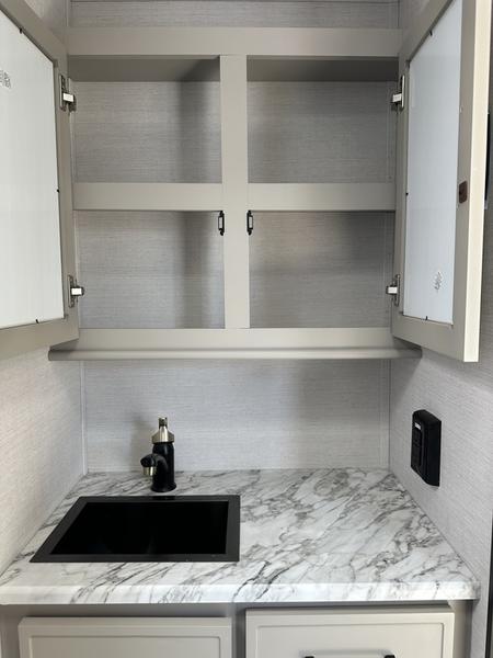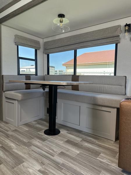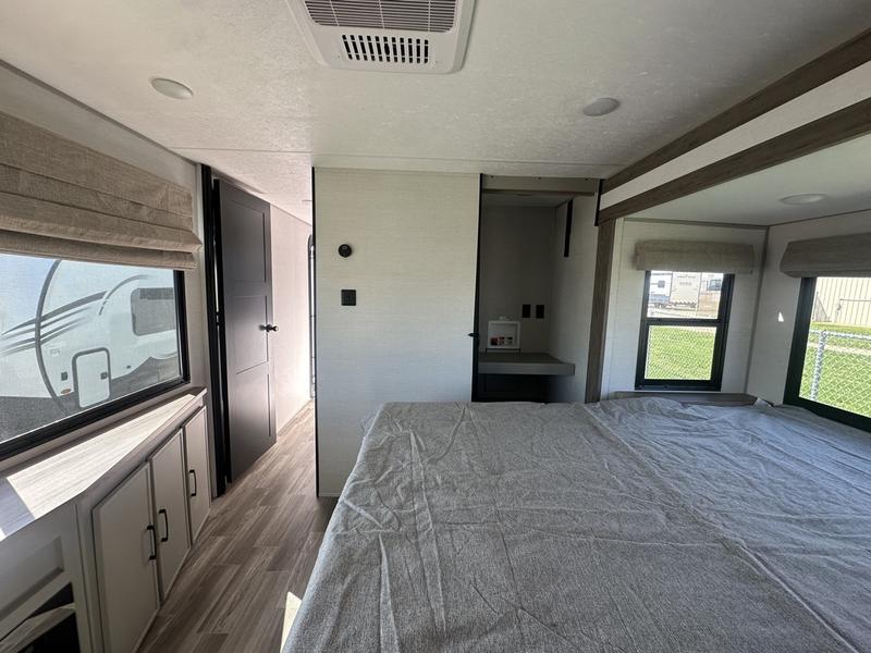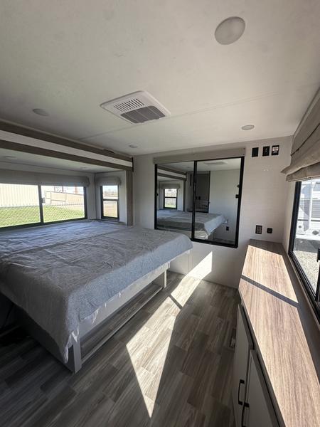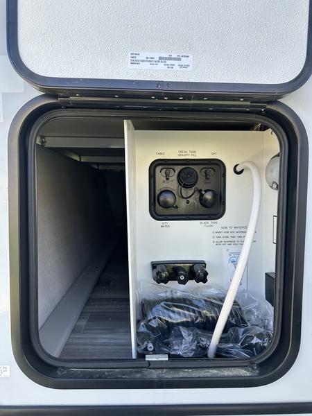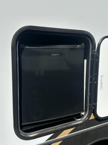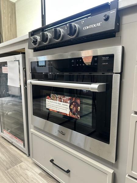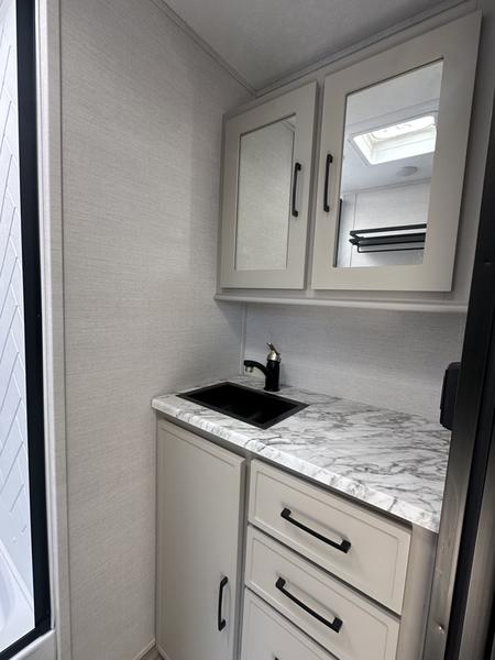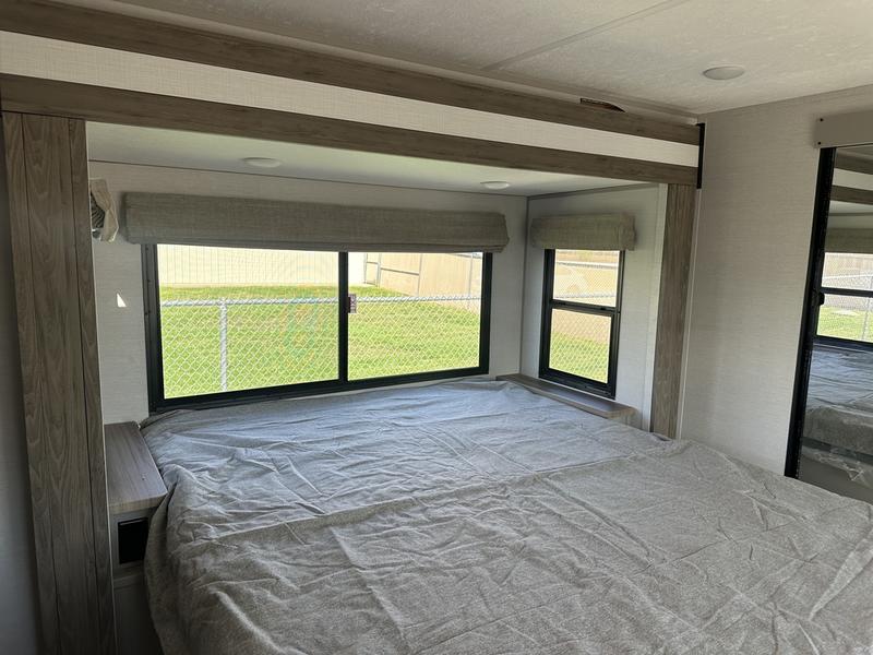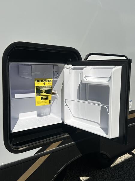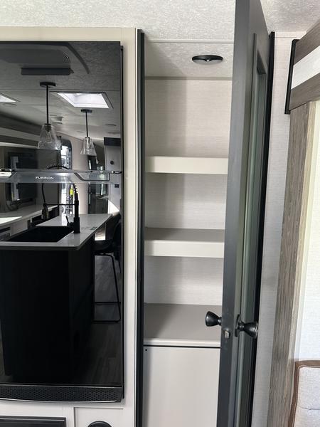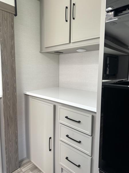 You won't believe all that this travel trailer has to offer! The rear kitchen includes a spacious pantry and a coffee bar/hutch for additional storage space. The kitchen island makes meal prepping easier, and the beverage cooler helps save space in your refrigerator for perishables. The kitchen skylight brings in natural lighting. Relax each night on either the tri-fold sofa or theater seating across from the entertainment center with a fireplace, or you can play some games at the 5-person dinette. As you enter the bathroom, you will notice the washer and dryer prep that will give you the ability to add these appliances. The front private bedroom has a custom king bed slide with nightstands on either side with power to charge your electronics while you recharge. The exterior not only has pass-through storage and a power awning, but also a 64" x 20" baggage door!