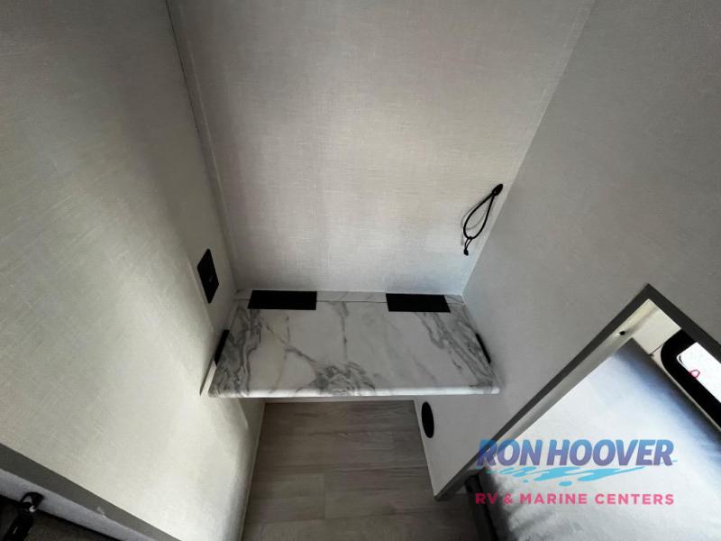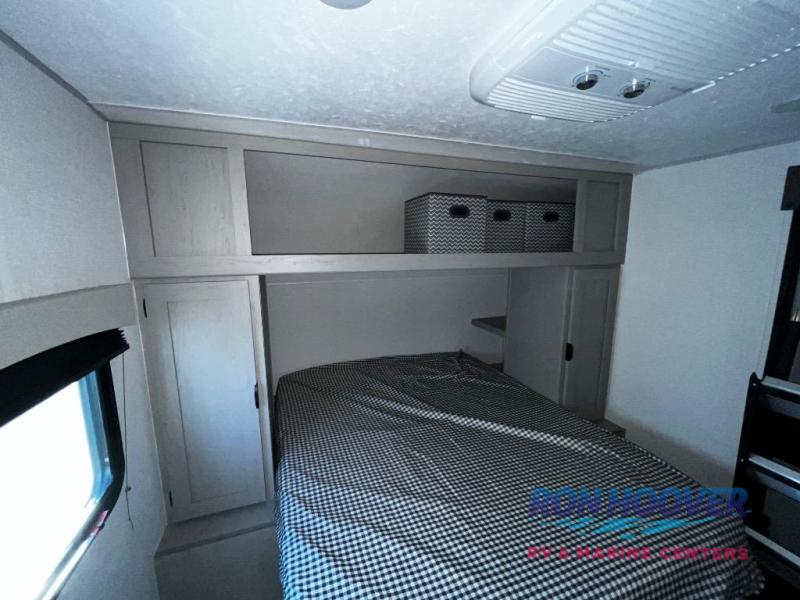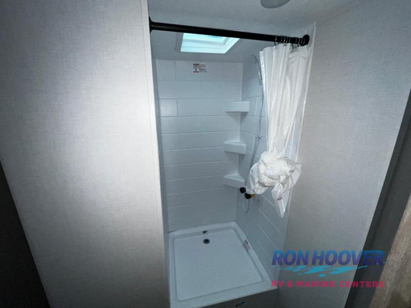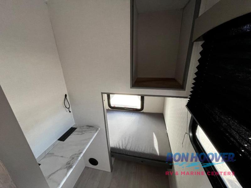 At the front of the trailer, a private bedroom welcomes you with a comfortable 60" x 80" queen bed for a restful night’s sleep, along with wardrobes on each side and an overhead shelf for organized storage. A convenient entry door provides direct access to this cozy space. Moving through the pass-through full bathroom, you’ll find storage beneath the countertop for toiletries and a 32" x 32" shower with a glass door, perfect for unwinding after a full day of adventure. At the center of the trailer, the main living area and kitchen create a spacious and functional hub, featuring a sofa and U-shaped dinette housed in a slide-out for plenty of seating space, while the fully equipped kitchen includes a sink with drying rack, a three-burner cooktop, and a 10 cu. ft. refrigerator so you can cook like a chef. Next to the second entry door, a walk-in pantry offers abundant space for dry goods and supplies. At the rear, two private bunk rooms each include a 38" x 72" bunk, dedicated storage, and a flip-up desk, ideal for work, study, or quiet time.