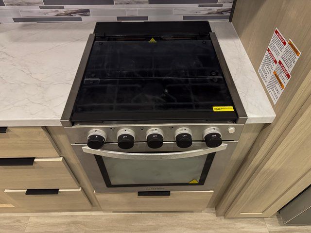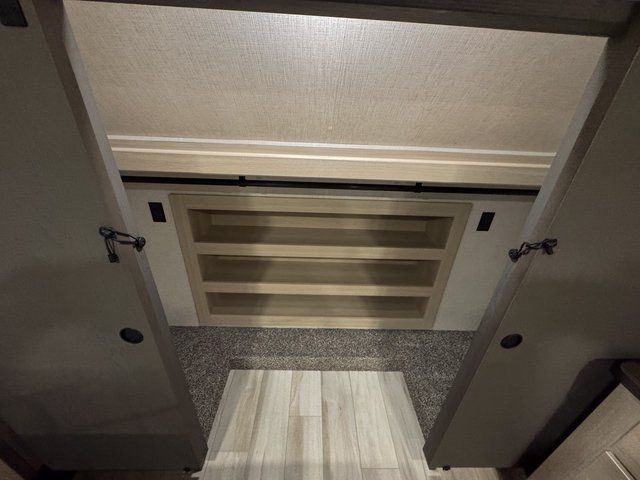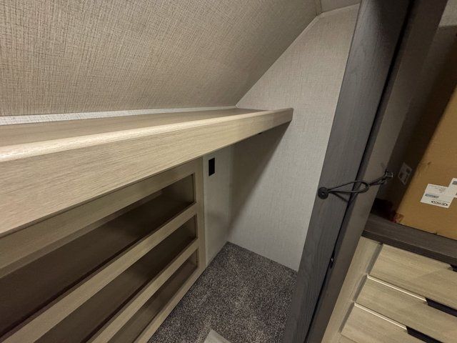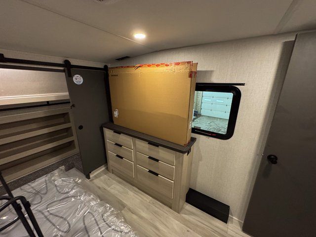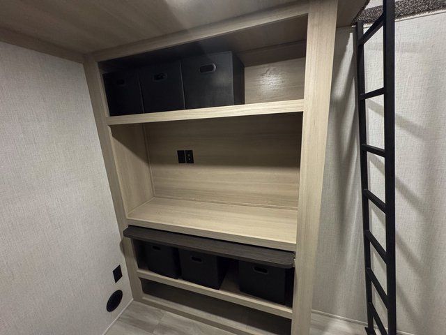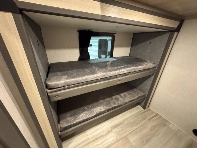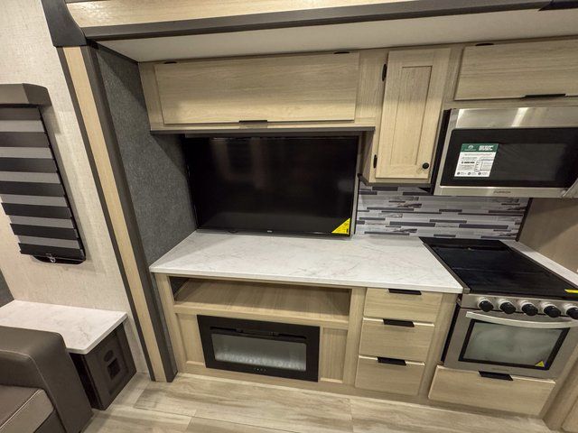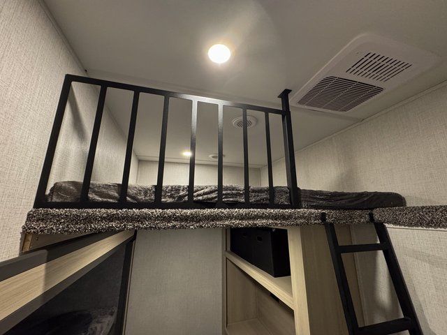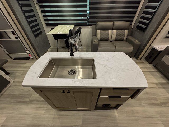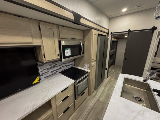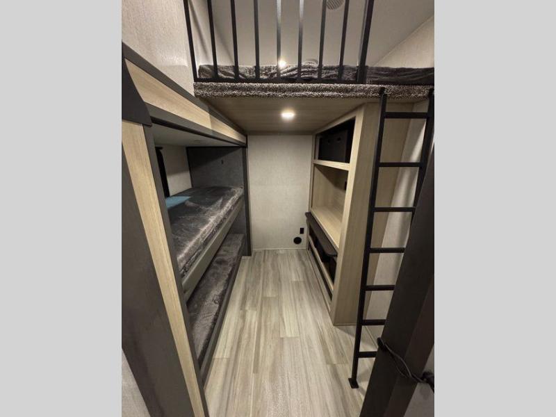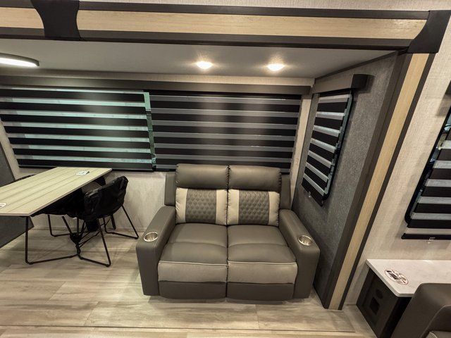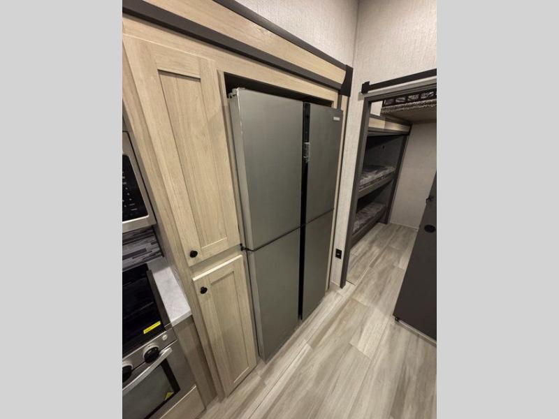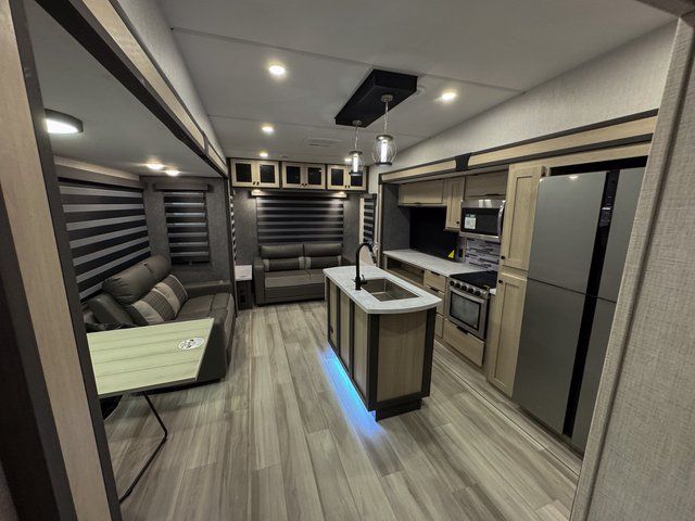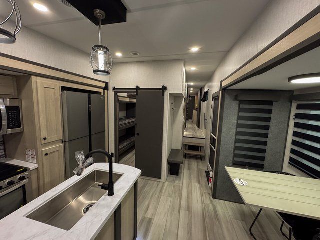 Wow! You won't believe the features found in this luxury fifth wheel that can sleep up to nine each night! Your guests or the kids will absolutely love the middle bunkroom with triple bunks and a loft above for even more sleeping or storage space. There is also a pull-out desk here, which will allow you to utilize this space as an office as well! You'll have your own space in the front private bedroom on the king bed slide out, and there is a walk-in wardrobe to keep your clothes tidy. There is even washer and dryer prep for the option to keep those clothes clean! The chef of your group will have everything they need to prepare meals, including a 21" 2-in-1 oven range, an over-the-range microwave, a 16 cu. ft. 12V refrigerator, plus a kitchen island for more counter space. In the evenings, your crew can get cozy on the rear sofa and theater seats across from the entertainment center and fireplace, or you might just play a game at the hi-top table and chairs!