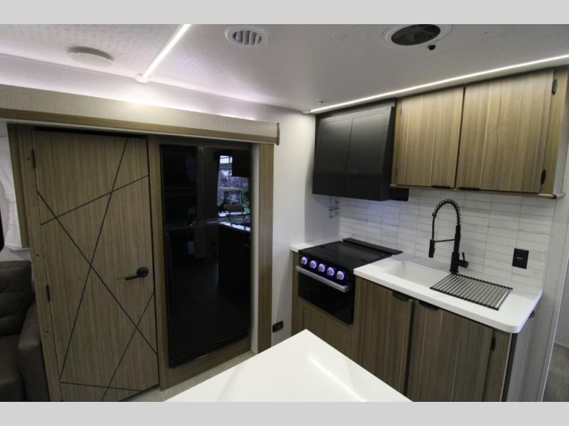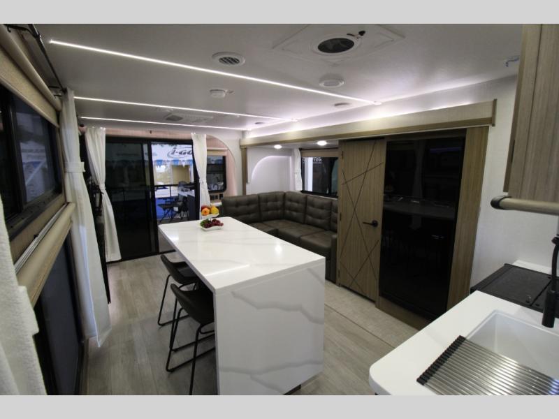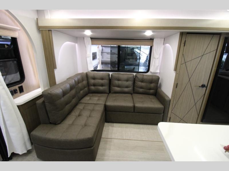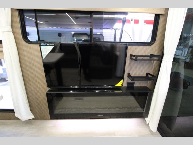 This travel trailer will feel more like home with its rear veranda/porch, dual entry doors, and front private bedroom! There is an outdoor kitchen on the back porch so you can make lunch in the fresh air, and the patio doors lead right into the main living area. Your crew can relax on the L-shaped sofa across from the fireplace, which will make your space more cozy. A kitchen island with four chairs will provide a place to dine at, and there is a spacious pantry and refrigerator for food storage. You will love having your own space in the private bedroom, and the Versa-Tilt custom king bed will let you sit up in bed to read your book at night.