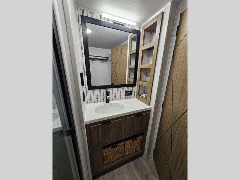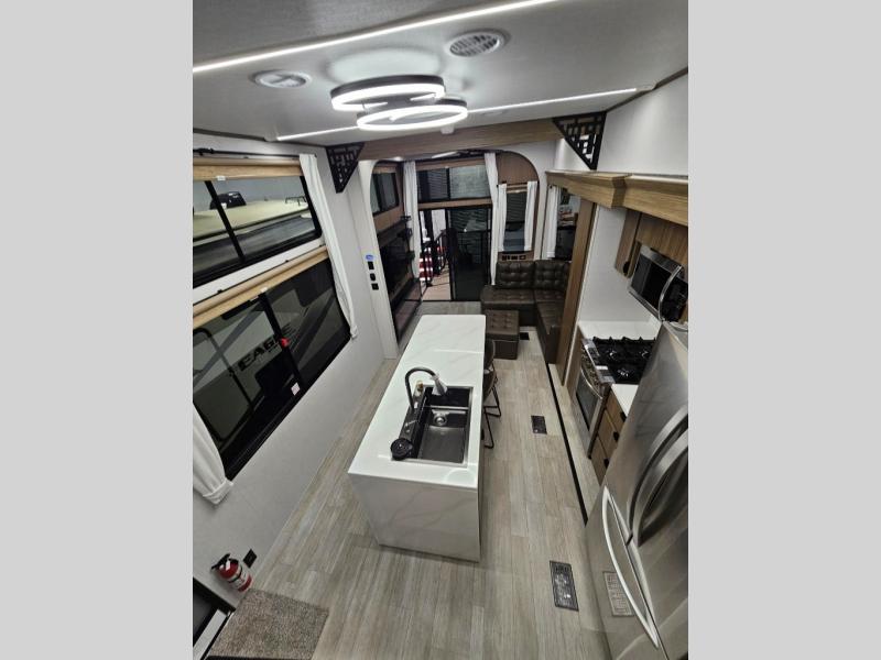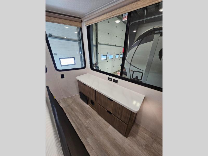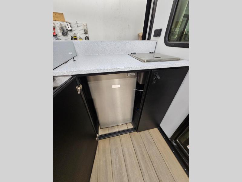 One look at this destination trailer and you'll be sold! The rear porch/veranda includes an outdoor kitchen with a cooktop and sink plus a ceiling fan so you can sit out back and visit with friends. The L-shaped sofa with an ottoman inside will provide cozy seating space, especially with the fireplace right across the room. Your crew can dine at the kitchen island with four chairs, and there is a large pantry where snacks can be kept for game night. When it's time to call it a night, the front private bedroom with a Versa-Tilt custom king bed is sure to bring comfort, and there is a dresser and wardrobe for your things. A third wardrobe includes washer and dryer prep if you choose to add those appliances. Any guests that aren't sleeping on the sofa can sleep in the loft with a queen bed, large front cabinet with shelves, and an additional cabinet for storage. You will also find a table with space below for your feet, so the kids can color, eat, and play games!