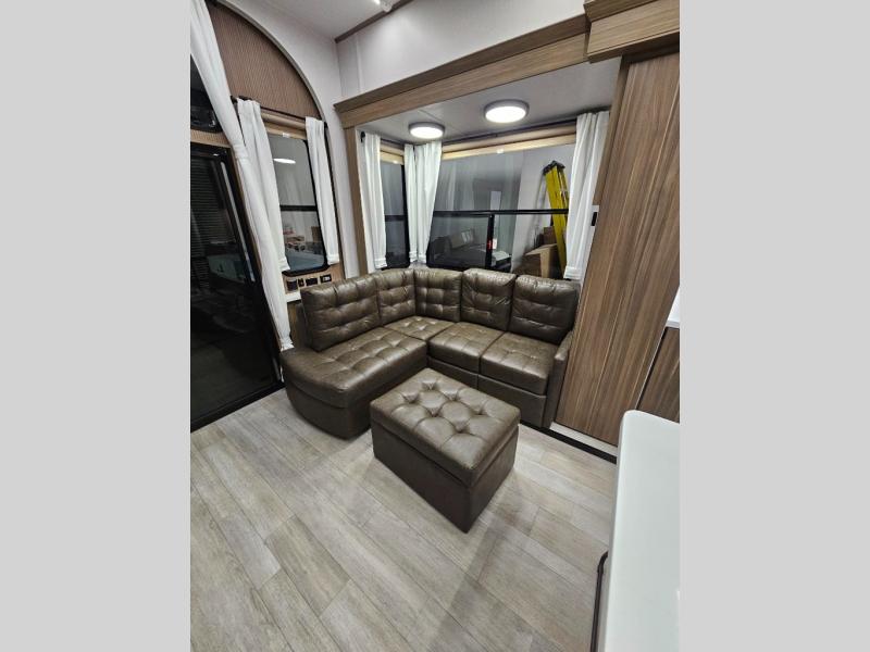 With any Wildwood Grand Lodge destination trailer by Forest River, you can enjoy extended stays wherever you go! There is 4K awning blade lighting outside, along with slide out awning toppers, plus a heated and enclosed Accessibelly for added protection. Inside, you'll love the stylish backsplash update, elegant curtain rods and curtains, TFL black walnut entertainment shelves, and stainless steel kitchen appliances. A Serta mattress in the bedroom(s) will provide comfort to each journey, and there is a tankless water heater for hot water when you need it.