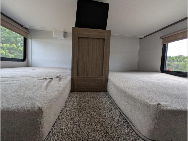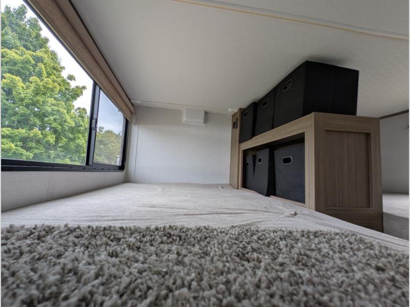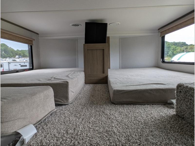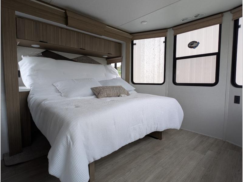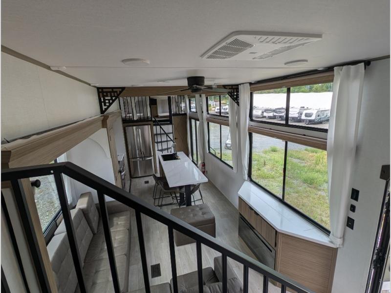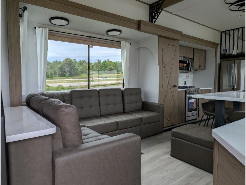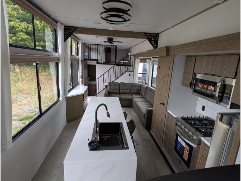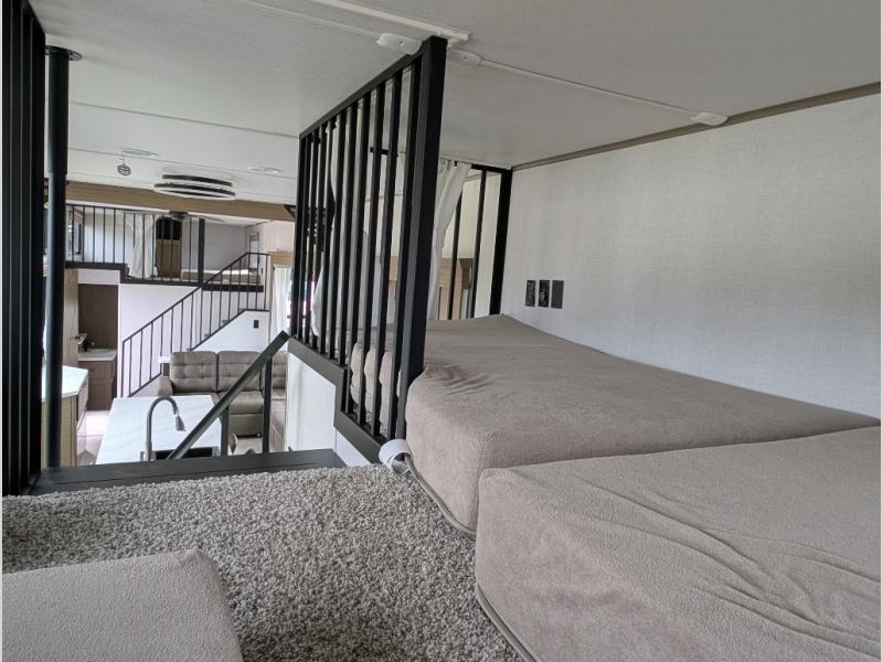 You will feel right at home in this destination trailer! It not only has one loft in the rear with two 42" x 74" bunk mats, but also a second loft in the front with spiral steps leading up to two bunk mats. The front private bedroom has a king bed slide with Versa-Tilt to lay your head on at night with front windows to let in lots of natural lighting and sunshine in the morning. Relax in true comfort at night on the L-shaped sectional sofa across from the entertainment center with a fireplace. The kitchen island provides extra space to prepare delicious meals and comes with four bar stools to enjoy your breakfast each morning. Everyone will stay fresh and clean with a walk-in shower in the rear private bedroom, plus there washer and dryer prep if you choose to add those appliances. Head outside through either the patio door or the second entry/exit door each day!