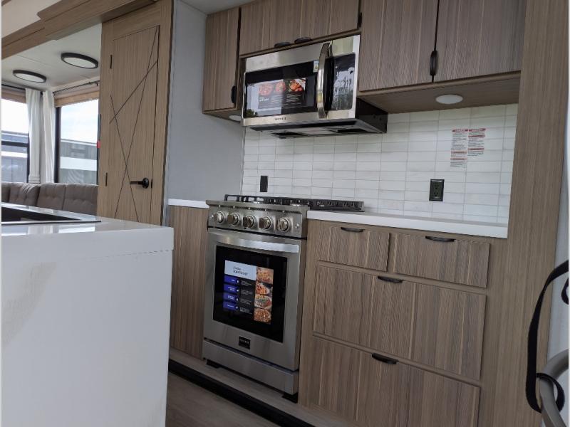 With any Wildwood Grand Lodge destination trailer by Forest River, you can enjoy extended stays wherever you go! There is 4K awning blade lighting outside, along with slide out awning toppers, plus a heated and enclosed Accessibelly for added protection. Inside, you'll love the stylish backsplash update, elegant curtain rods and curtains, TFL black walnut entertainment shelves, and stainless steel kitchen appliances. A Serta mattress in the bedroom(s) will provide comfort to each journey, and there is a tankless water heater for hot water when you need it.