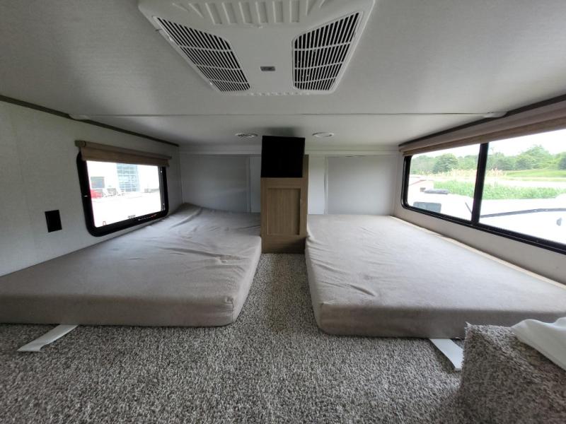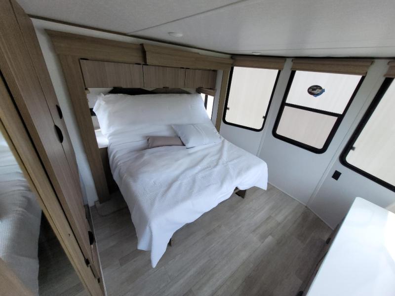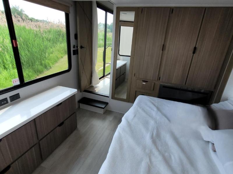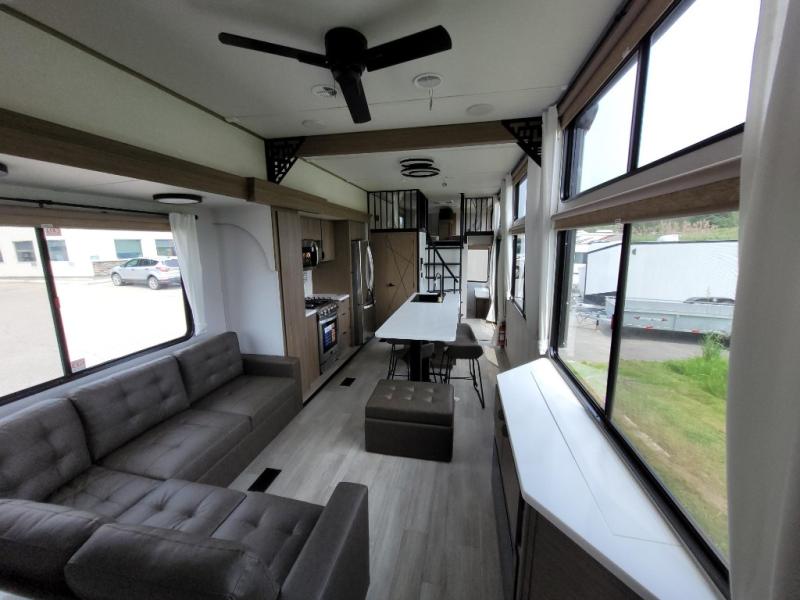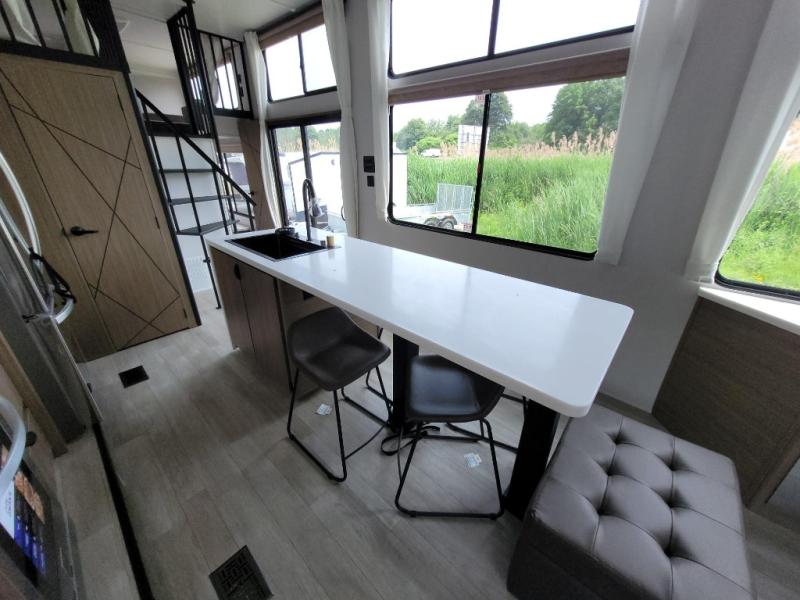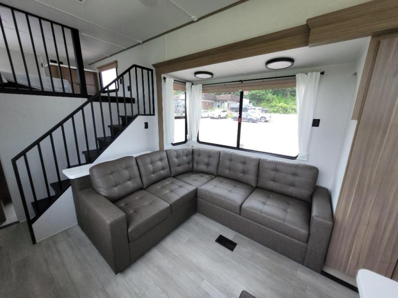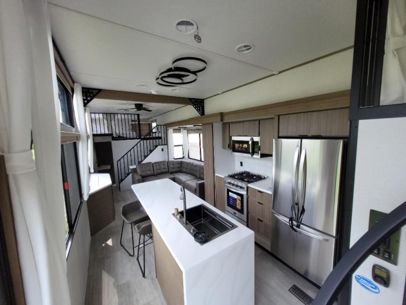 You will feel like you are home when you step inside! Not only will you be impressed with the super large slide in the main combined kitchen and living area, but check out the island with four counter height seats! The main entry closest to the front features a private bedroom with a custom king bed with Versa-Tilt within a slide, plus a fireplace and a dresser for your belongings. Just outside this door is a spiral staircase to the front loft with two 42" x 74" bunk mats above. The kitchen is fully equipped for you to provide the best home cooked meals with a pull-out pantry, range and microwave, plus side-by-side refrigerator. There is also a half bath off of the kitchen for added convenience! An L-shaped sectional sofa with an ottoman provides a cozy space to relax, and there is an entertainment center with a fireplace for a relaxing evenings indoors. A full rear bath features a spacious walk-in shower, a linen closet plus washer and dryer prep for the option to make laundry day easier. And the second loft with stairs is above the bath for even more sleeping space!