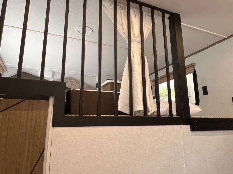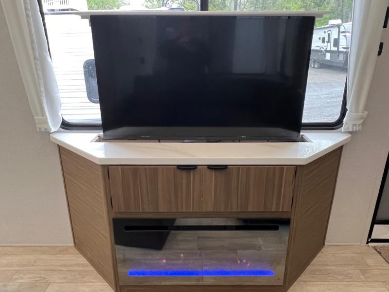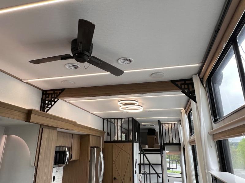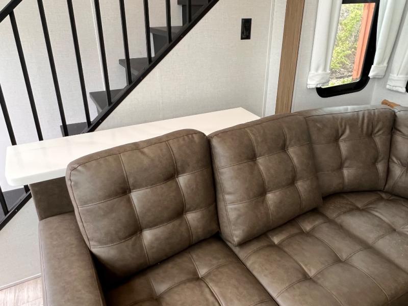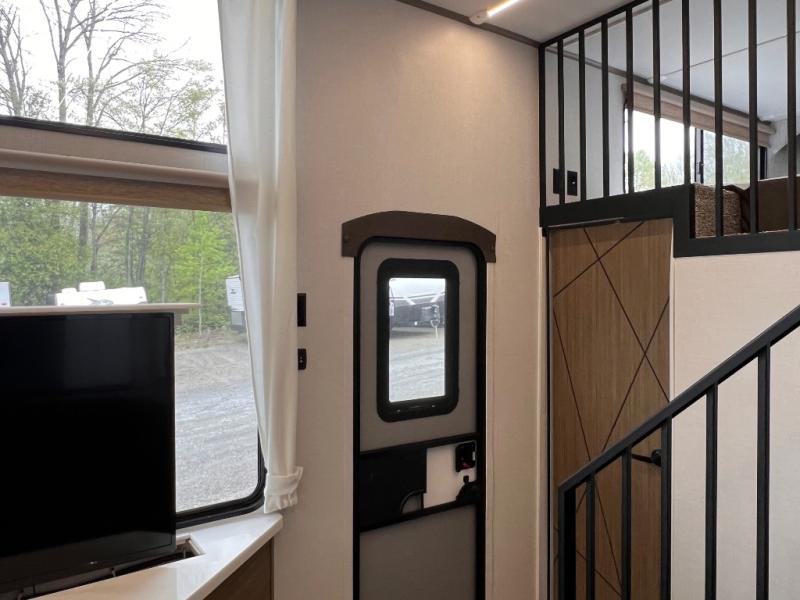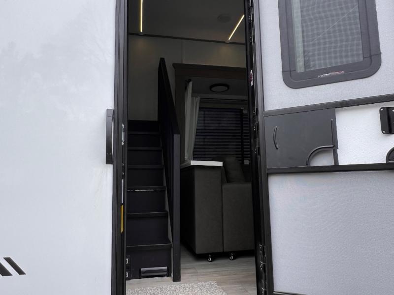 You will feel like you are home when you step inside! Not only will you be impressed with the super large slide in the main combined kitchen and living area, but check out the island with four counter height seats! The main entry closest to the front features a private bedroom with a custom king bed with Versa-Tilt within a slide, plus a fireplace and a dresser for your belongings. Just outside this door is a spiral staircase to the front loft with two 42" x 74" bunk mats above. The kitchen is fully equipped for you to provide the best home cooked meals with a pull-out pantry, range and microwave, plus side-by-side refrigerator. There is also a half bath off of the kitchen for added convenience! An L-shaped sectional sofa with an ottoman provides a cozy space to relax, and there is an entertainment center with a fireplace for a relaxing evenings indoors. A full rear bath features a spacious walk-in shower, a linen closet plus washer and dryer prep for the option to make laundry day easier. And the second loft with stairs is above the bath for even more sleeping space!