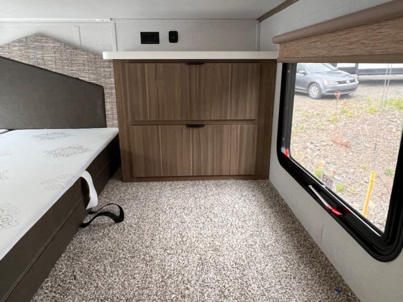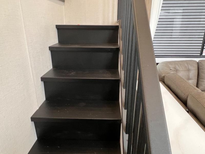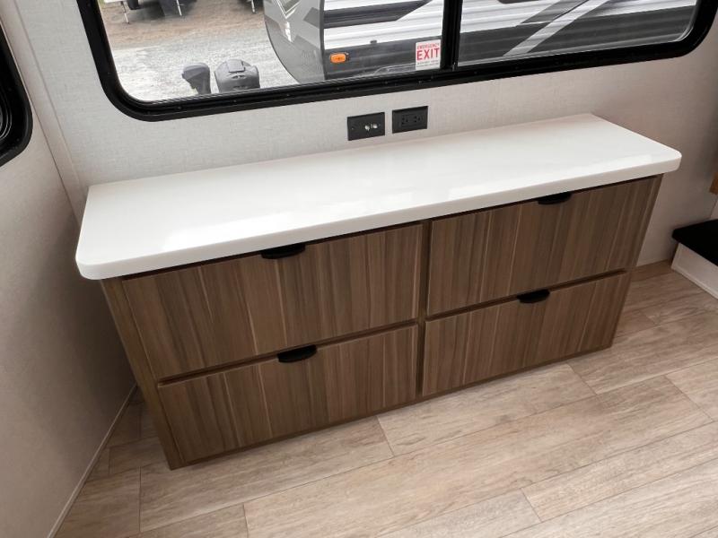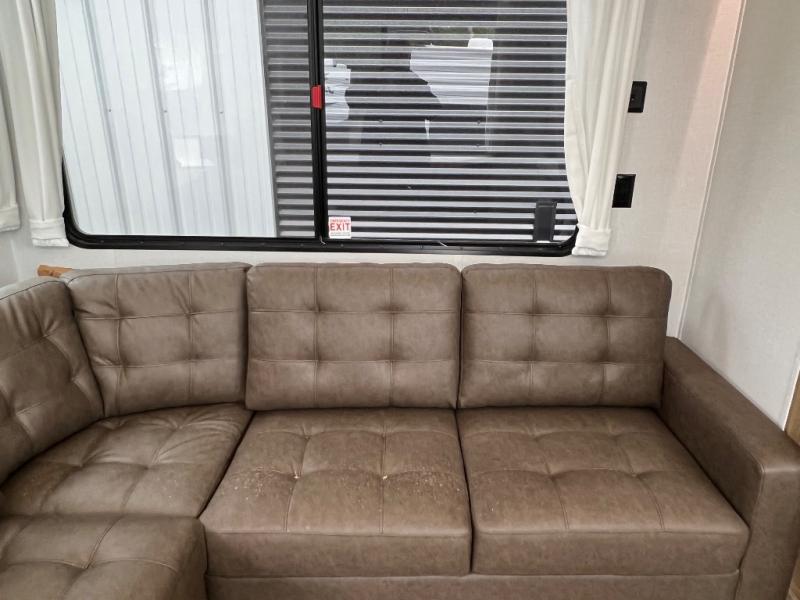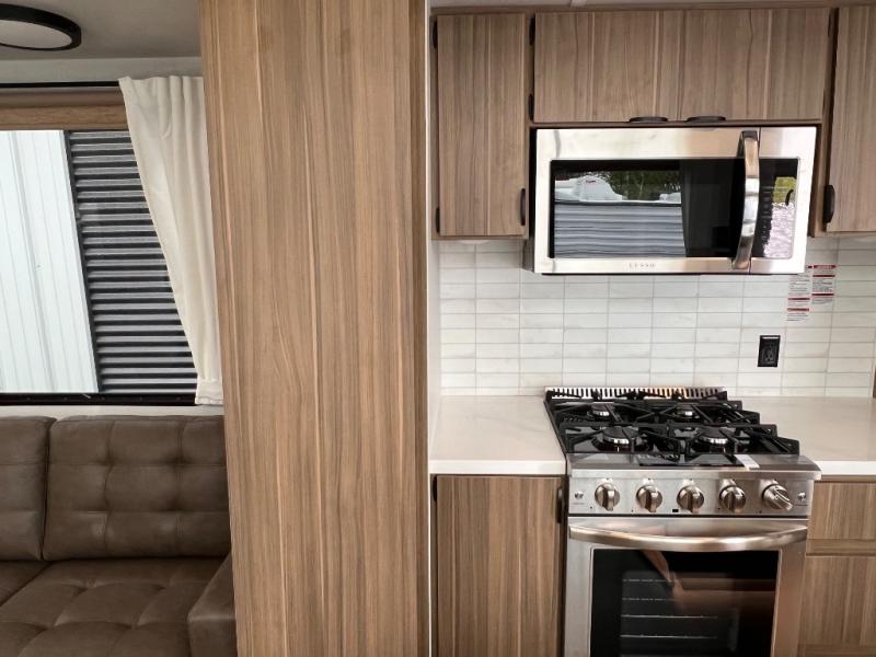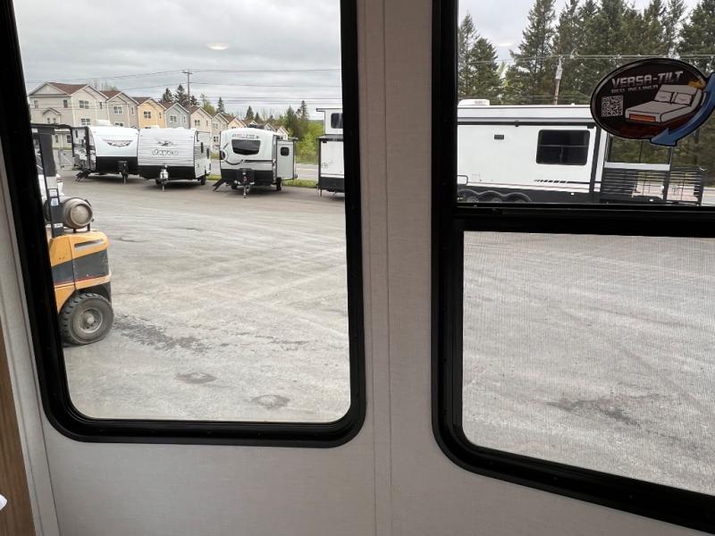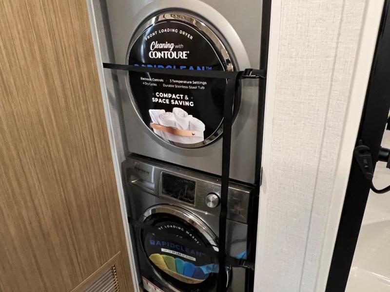 You will feel like you are home when you step inside! Not only will you be impressed with the super large slide in the main combined kitchen and living area, but check out the island with four counter height seats! The main entry closest to the front features a private bedroom with a custom king bed with Versa-Tilt within a slide, plus a fireplace and a dresser for your belongings. Just outside this door is a spiral staircase to the front loft with two 42" x 74" bunk mats above. The kitchen is fully equipped for you to provide the best home cooked meals with a pull-out pantry, range and microwave, plus side-by-side refrigerator. There is also a half bath off of the kitchen for added convenience! An L-shaped sectional sofa with an ottoman provides a cozy space to relax, and there is an entertainment center with a fireplace for a relaxing evenings indoors. A full rear bath features a spacious walk-in shower, a linen closet plus washer and dryer prep for the option to make laundry day easier. And the second loft with stairs is above the bath for even more sleeping space!