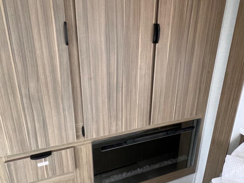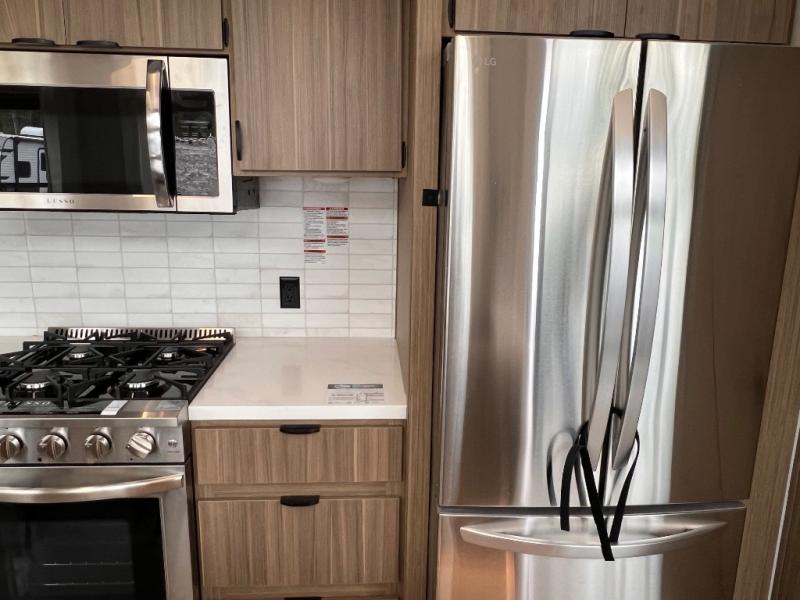 With any Wildwood Grand Lodge destination trailer by Forest River, you can enjoy extended stays wherever you go! There is 4K awning blade lighting outside, along with slide out awning toppers, plus a heated and enclosed Accessibelly for added protection. Inside, you'll love the stylish backsplash update, elegant curtain rods and curtains, TFL black walnut entertainment shelves, and stainless steel kitchen appliances. A Serta mattress in the bedroom(s) will provide comfort to each journey, and there is a tankless water heater for hot water when you need it.