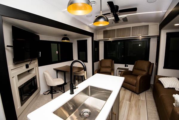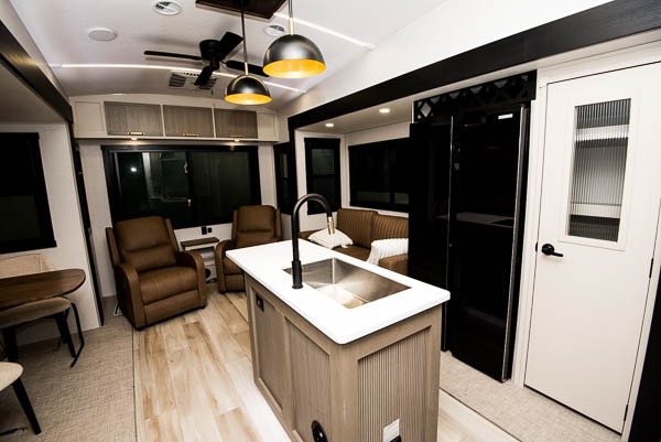 With any Wildwood Heritage Glen fifth wheel by Forest River, the quality construction, attention to detail and design along with a bright and welcoming interior allows you to relax in comfort with conveniences while exploring outdoors. The Summer Wind colored horizontal plank linoleum flooring is unique, beautiful and durable, and there are gold-accented faucets with stainless steel sinks in the bathrooms for added luxury. The Accessibelly underbelly with 12V tank heaters will help protect your unit from the elements, and the power stabilizer jacks and landing gear will make set-up a breeze. More features that provide convenience include the high-end solid surface countertops, an RV Airflow System that provides at least 25% better airflow, and solar prep for off-grid capabilities.