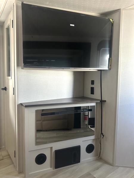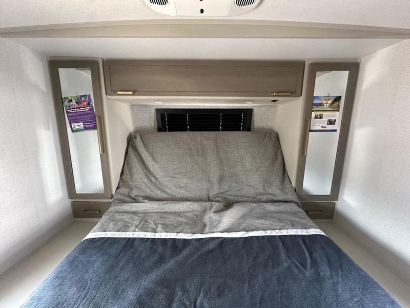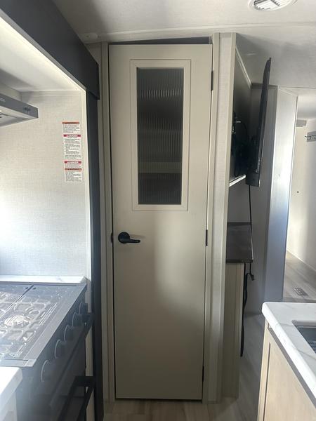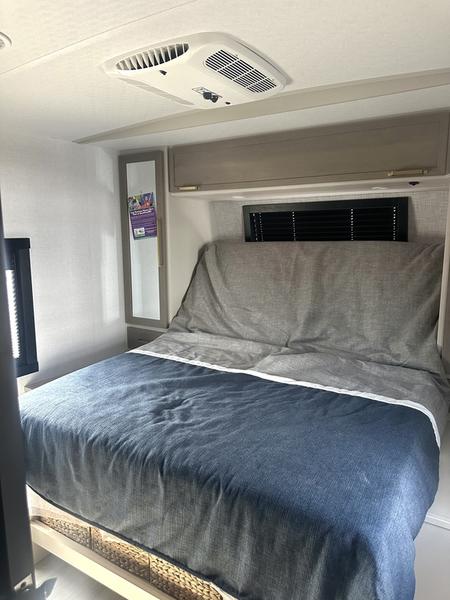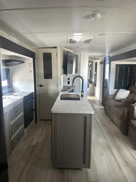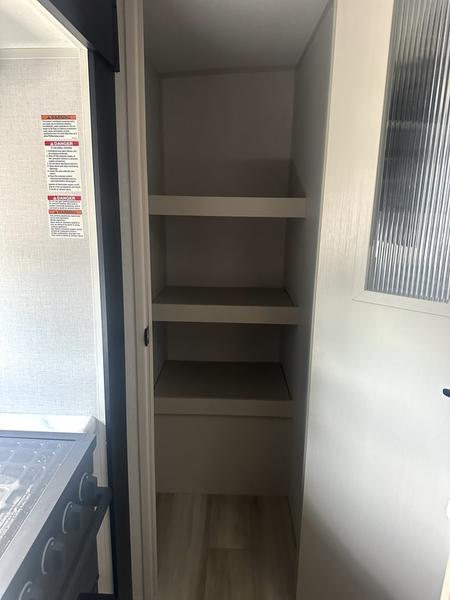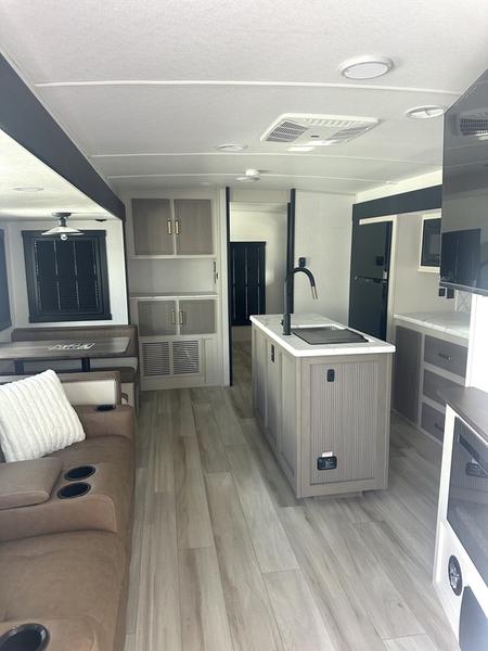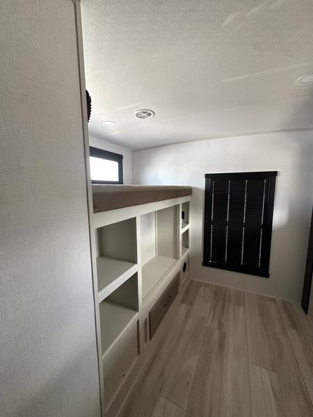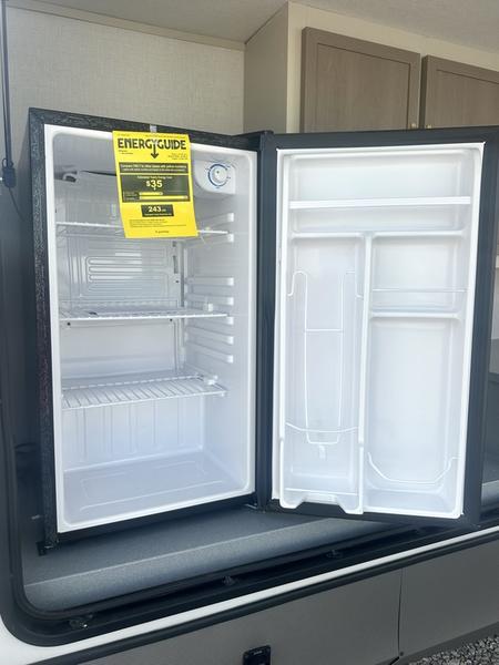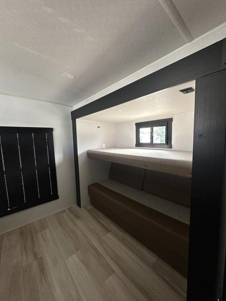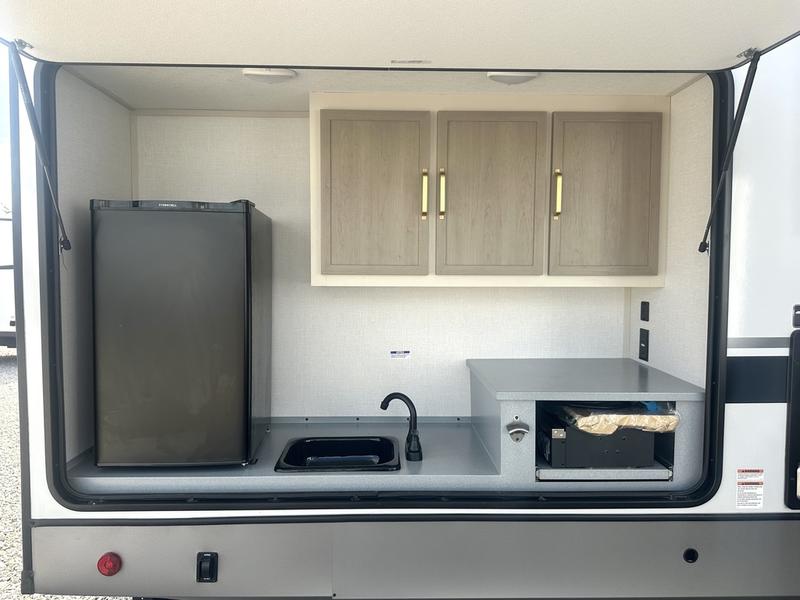 Your kids or friends are ready for a trip in this Wildwood Heritage Glen travel trailer, but are you? As the kiddos or your buddies claim the private bunkhouse for themselves, which includes two bunk beds and a convertible sofa bed, you can escape to your own privacy in the front bedroom with a queen bed with Versa Tilt and lots of storage. There is even washer/dryer prep for added convenience. The main living area and kitchen might be the next indoor hangout spot thanks to the chef-size walk-in pantry and 12V refrigerator. The cook even has a choice of making meals on the outside kitchen/bar which also includes an LP quick connect nearby. On rainy days, the theatre seats and booth dinette will offer a place to watch TV and play games, and the panoramic windows will always offer beautiful scenery no matter the weather conditions.