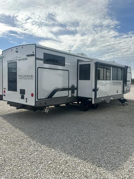 With any Wildwood Heritage Glen travel trailer by Forest River, the quality construction, attention to detail and design along with a bright and welcoming interior allows you to relax in comfort with conveniences while exploring outdoors. Each model includes a WeatherShield one piece fiberglass roof, Maxxis radial tires, and an enclosed underbelly with 12V tank heaters on all holding tanks for added protection. You will appreciate the on-demand tankless water heater, along with the 15K BTU Quite Cool A/C and 50 Amp service with a brace for a second A/C. There is an outside shower with hot and cold water, solar prep, a power tongue jack, plus many more exterior conveniences. Head inside to enjoy matte gold hardware, wood door casings in place of plastic door casings, and full length barreled ceilings for additional head room.