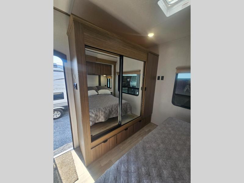 This park model weighs 9289lbs and features a very modern look, 2 slides, front living area with 2 recliners, sofa and fireplace, kitchen with free standing table and chairs bathroom with walk in shower, rear king bedroom with versa tilt bed, closet, and door to outside, central vac and so much more to see!