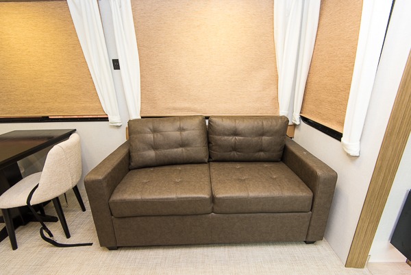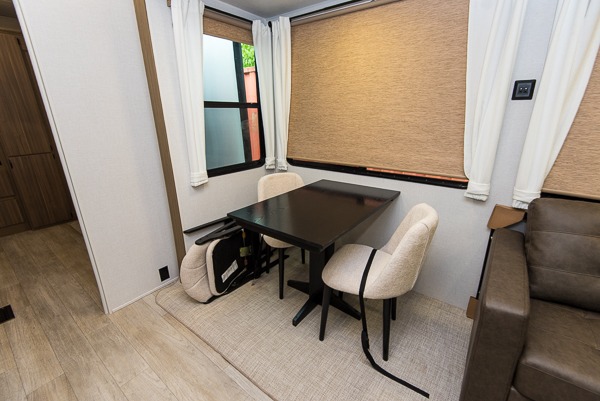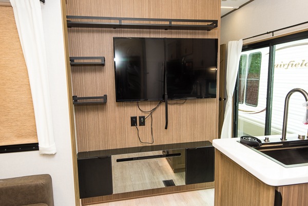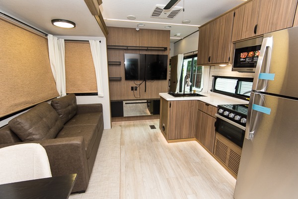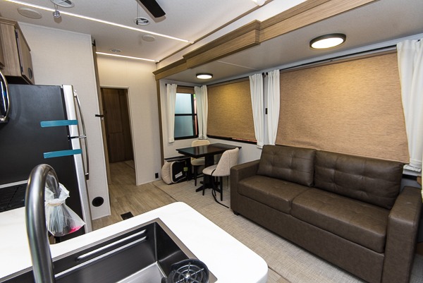 The spacious bunkhouse suite on this Wildwood Lodge destination trailer is going to be the ultimate attraction! Because of the opposing slides, there is plenty of room for your kids or guests to truly enjoy themselves, and the dual bunkhouse closets will provide lots of space for their belongings. There are three bunk beds and a Versa Queen bunk in this space, and the half bathroom is also attached to this bunkhouse. The main living area has a tri-fold sofa and free-standing table with chairs, plus a ceiling fan to help keep air moving. The entertainment center has a fireplace, and the kitchen has a residential refrigerator for storing lots of perishables.