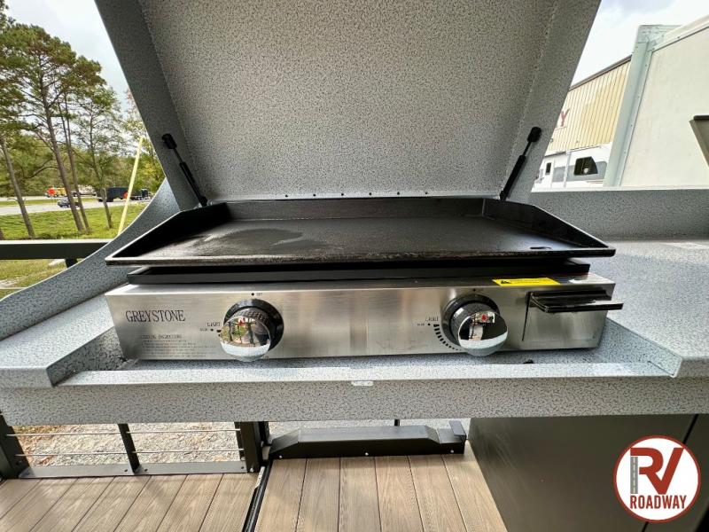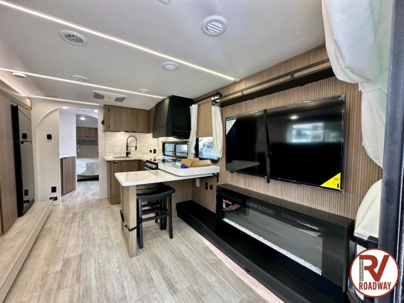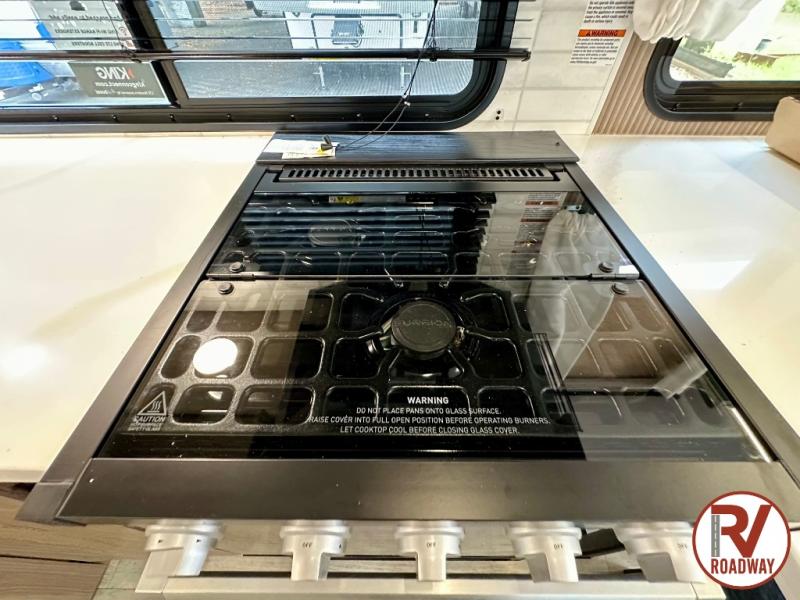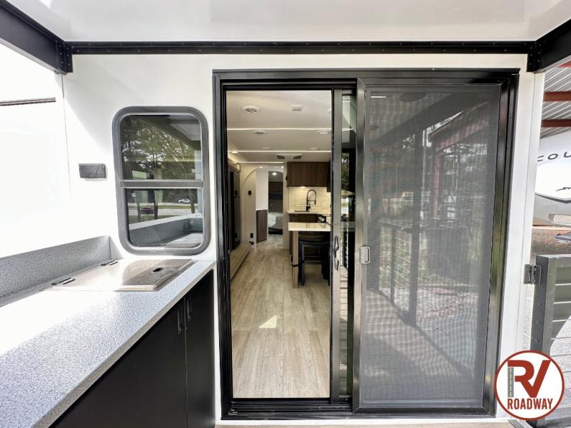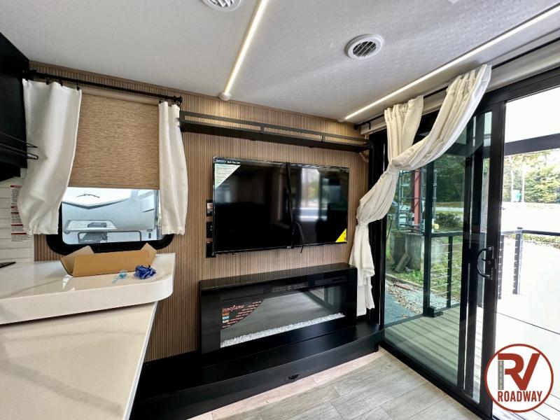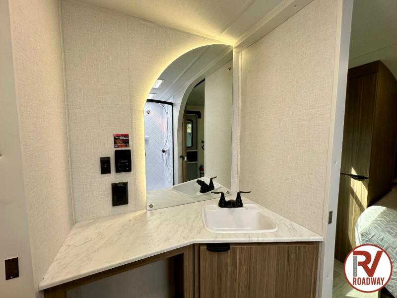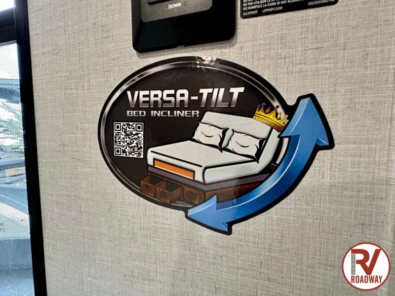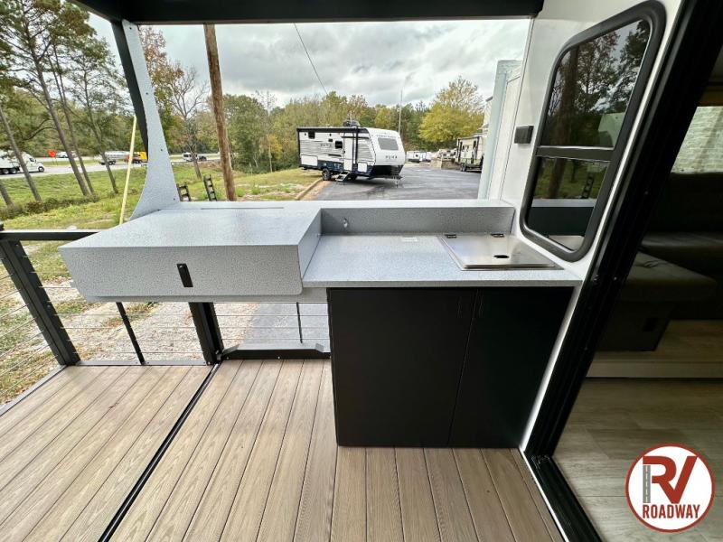 This travel trailer will feel more like home with its rear veranda/porch, dual entry doors, and front master bedroom! There is an outdoor kitchen on the back porch so you can make lunch in the fresh air, and the patio doors lead right into the main living area. Your crew can relax on the L-shaped sofa across from the fireplace, which will make your space more cozy. The U-shaped kitchen counter includes a pull-out table for even more counter space, and the walk-thru bath is easily accessible for everyone to use. You will love having your own space in the master bedroom, and the Versa-Tilt custom king bed will let you sit up in bed to read your book at night. One of the dual entry doors is also found here for added convenience!