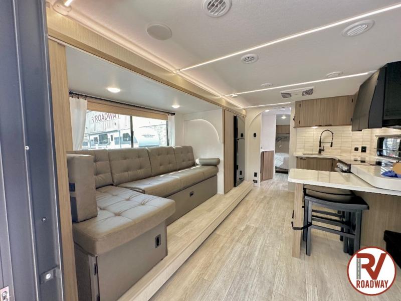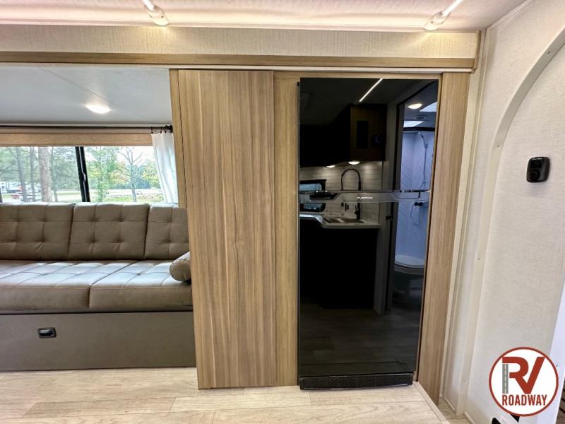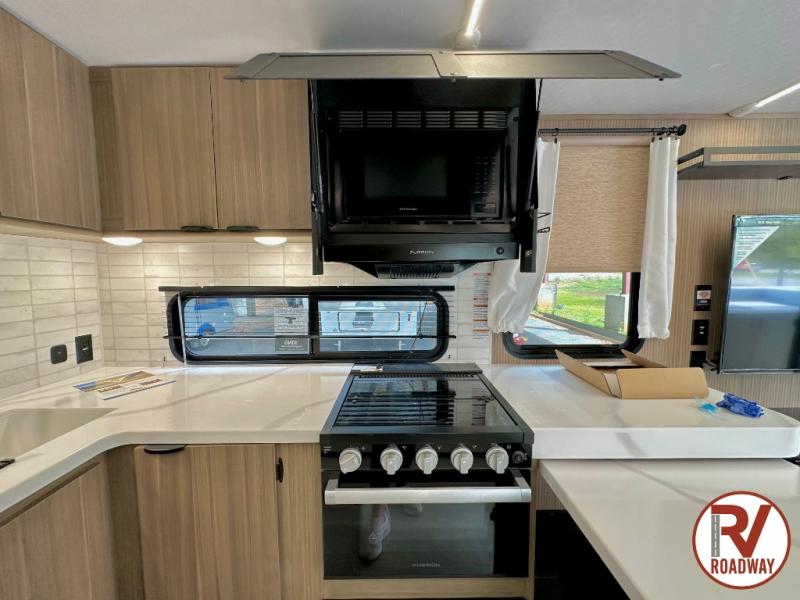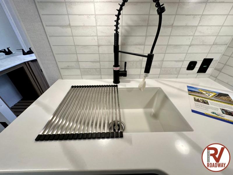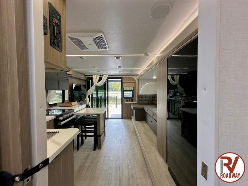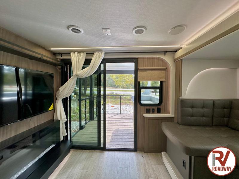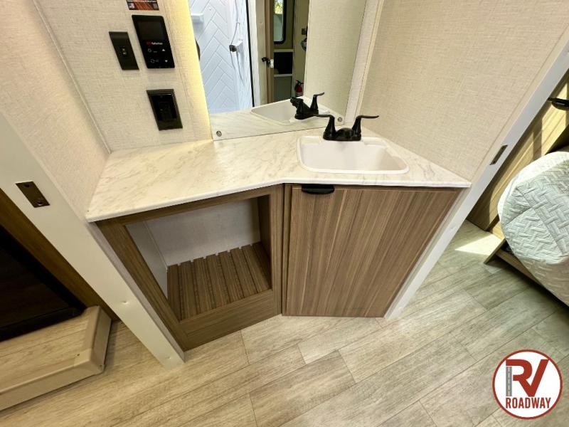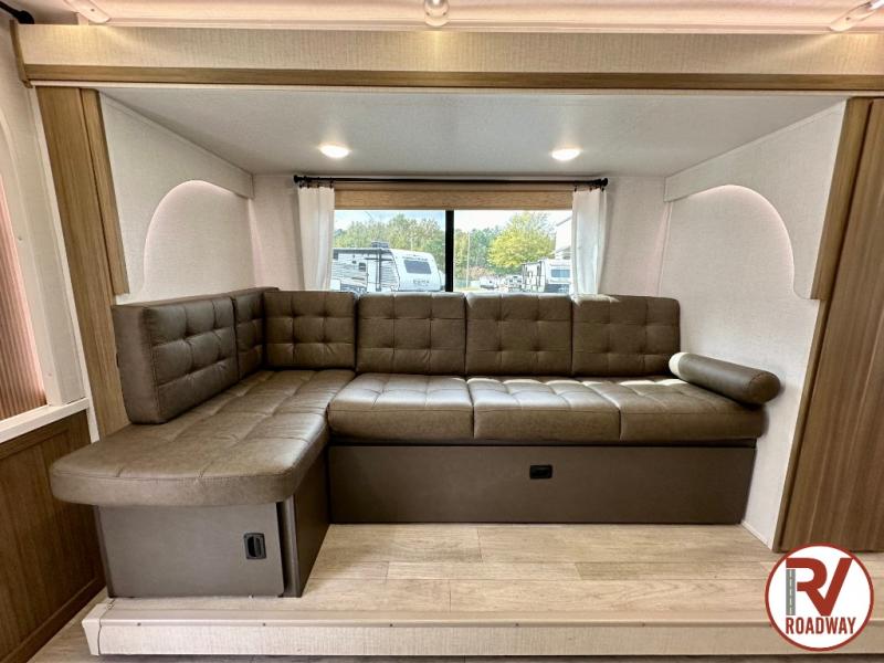 This travel trailer will feel more like home with its rear veranda/porch, dual entry doors, and front master bedroom! There is an outdoor kitchen on the back porch so you can make lunch in the fresh air, and the patio doors lead right into the main living area. Your crew can relax on the L-shaped sofa across from the fireplace, which will make your space more cozy. The U-shaped kitchen counter includes a pull-out table for even more counter space, and the walk-thru bath is easily accessible for everyone to use. You will love having your own space in the master bedroom, and the Versa-Tilt custom king bed will let you sit up in bed to read your book at night. One of the dual entry doors is also found here for added convenience!