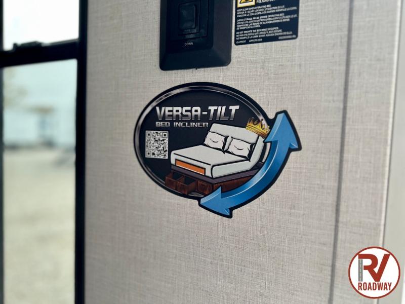 This travel trailer will feel more like home with its rear veranda/porch, dual entry doors, and front master bedroom! There is an outdoor kitchen on the back porch so you can make lunch in the fresh air, and the patio doors lead right into the main living area. Your crew can relax on the L-shaped sofa across from the fireplace, which will make your space more cozy. The U-shaped kitchen counter includes a pull-out table for even more counter space, and the walk-thru bath is easily accessible for everyone to use. You will love having your own space in the master bedroom, and the Versa-Tilt custom king bed will let you sit up in bed to read your book at night. One of the dual entry doors is also found here for added convenience!