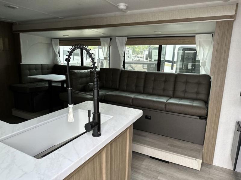 You can do so much with this Wildwood X-Lite travel trailer because it has a Versa Lounge in the main living area, and Versa-bunks plus a Versa-queen sofa in the private bunkhouse! These pieces of furniture provide you with versatility while you travel so that your trailer can best fit your lifestyle. The kitchen is completely outfitted with excellent tools to make all of your meals delicious, and the full bathroom offers you a walk-in shower for the most convenience. The exterior portion of this trailer is complete with a 16' awning and exterior speakers, and it is even more accommodating with the outdoor kitchen with a griddle.