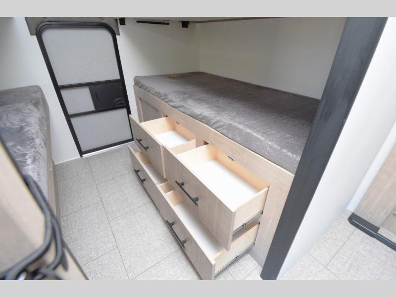 - Quad Bunks: The rear bunkroom has four bunks, perfect for kids and guests. Each bunk offers a cozy, private space, and built-in drawers provide convenient storage for clothing, games, and personal items.