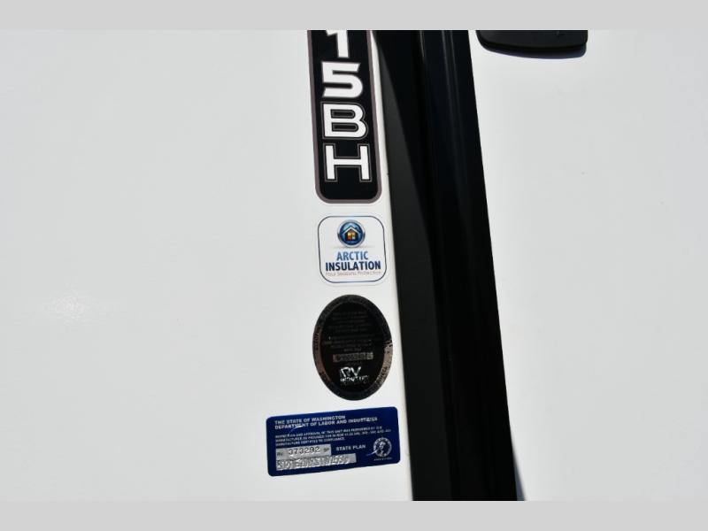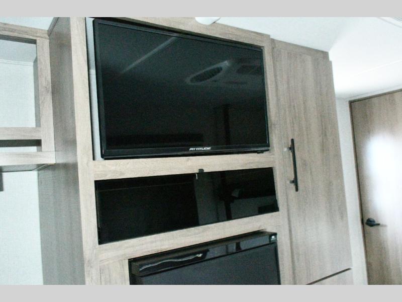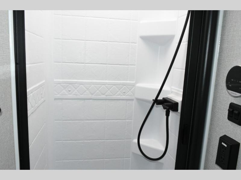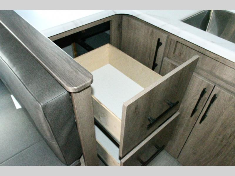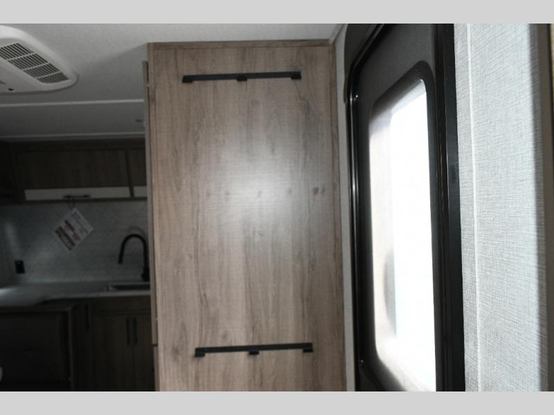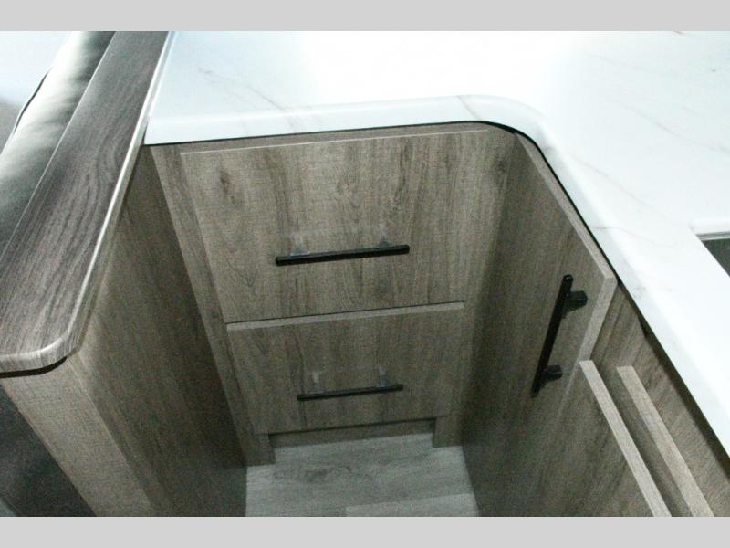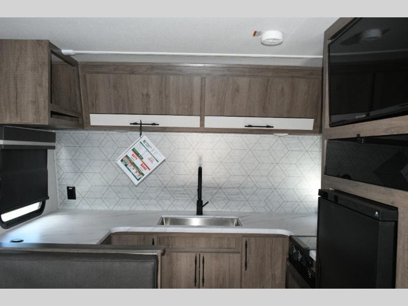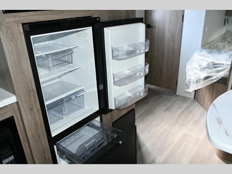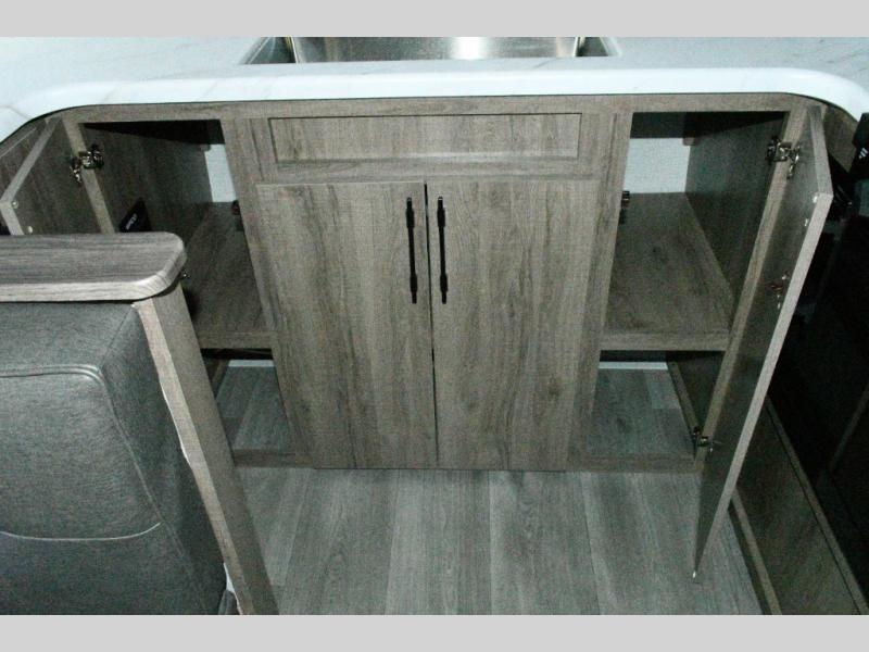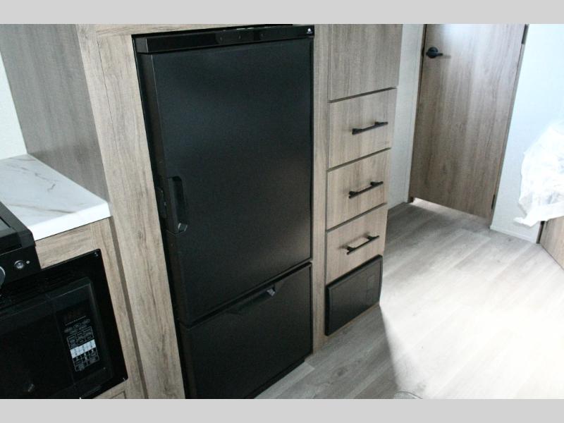 Outdoor living is easy with the outside griddle and baggage doors for organized storage. Built for all seasons, this travel trailer includes the 4-Seasons Protection Package, ensuring you can camp comfortably year-round. Inside, residential cabinetry, premium window treatments, and countertops create a home-like atmosphere, while the on-demand tankless water heater and HD LED TV add modern convenience and entertainment.