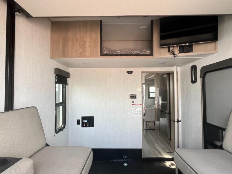 Spend your days at the campground kicking up mud with this toy hauler in tow! once you've unloaded your toys from the ramp door, you can use the 60 gallon fuel station to fill up and head out on a trail! The overhead bed provides a place for guests to sleep, and the optional Happi-Jac rollover sofas and a table with a top bed will give you the option to add even more seating and sleeping space. There is even an optional half bath here if you choose to make this space more accommodating. Head to the middle kitchen and living area where you'll enjoy generous counter space to prep meals, a spacious 20 cu. ft. refrigerator, an L-shaped sofa, plus a hybrid desk/dinette that will serve as a dining or working space. The dual entry bath creates a front master bedroom you are sure to love. There is a queen bed with an optional king bed, plenty of overhead storage, and a wardrobe slide to keep your things organized.