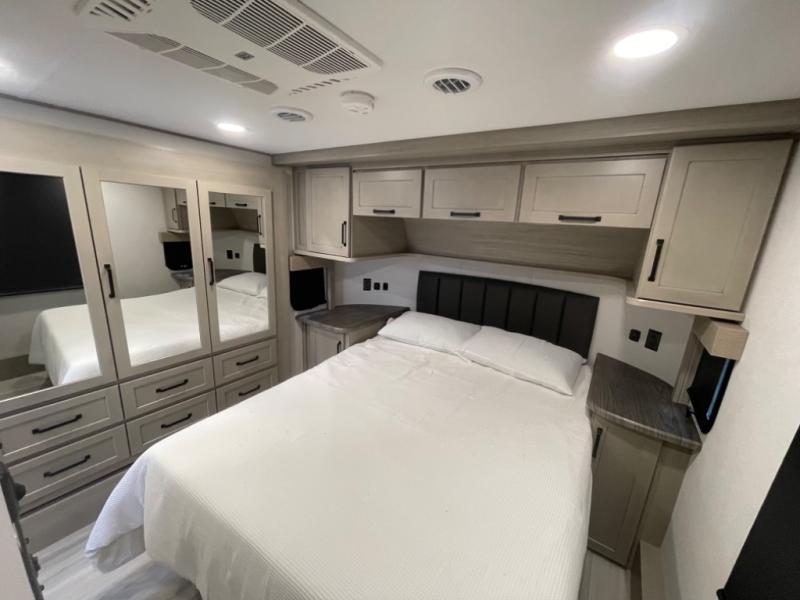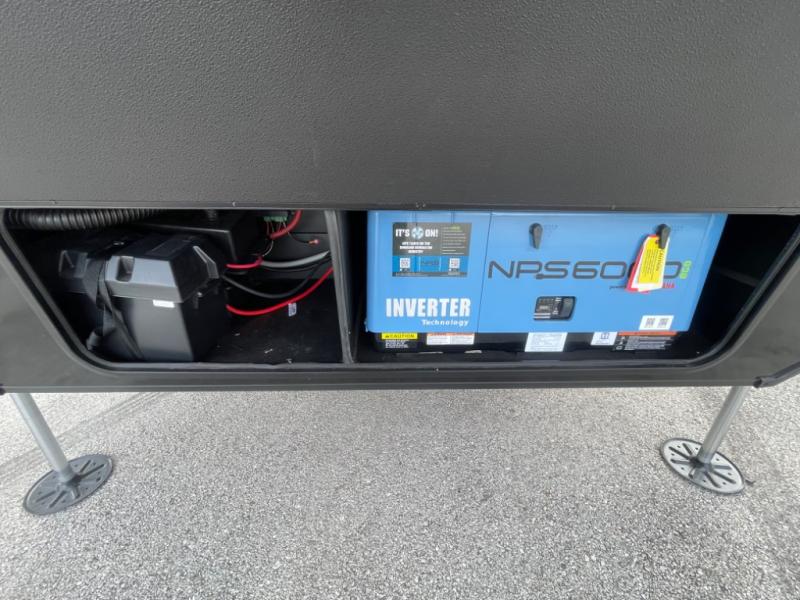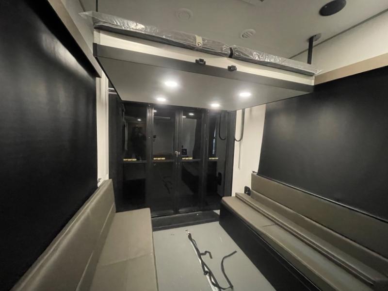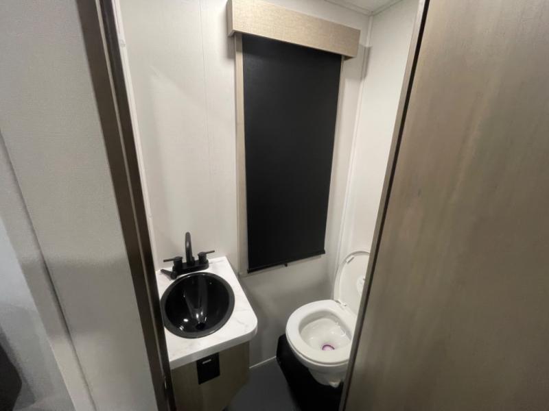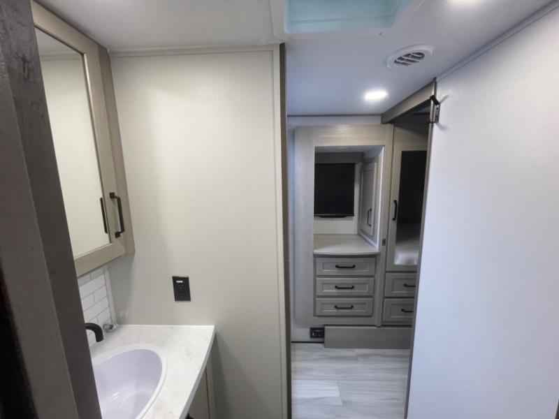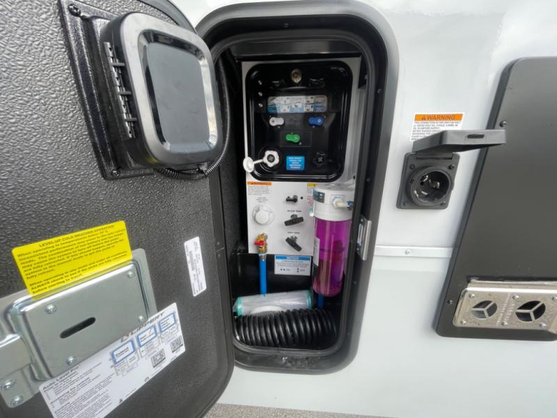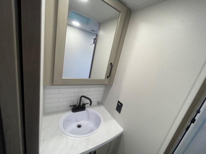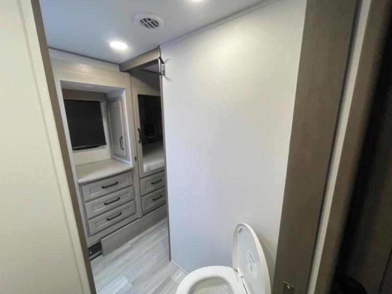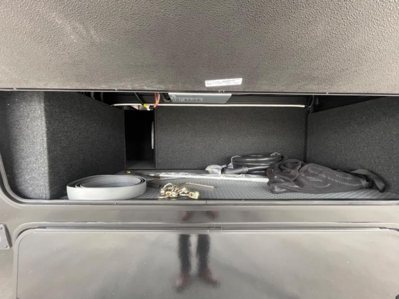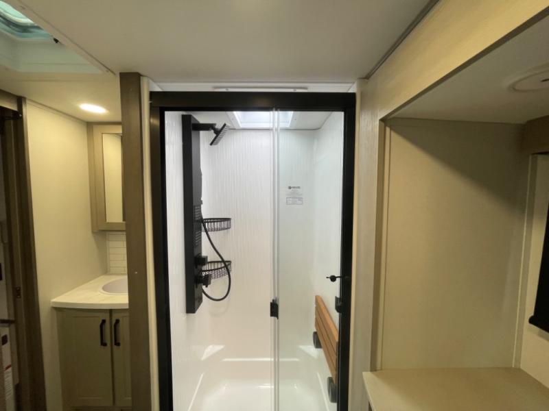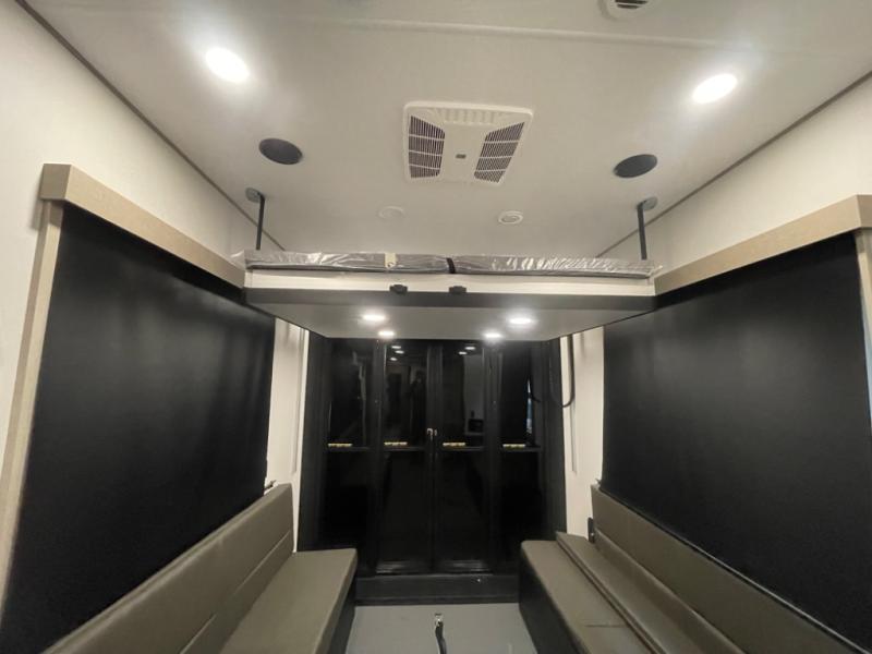 You want a toy hauler to carry your toys to the trails, and include many at-home comforts, and that's just what this unit delivers. A 14' separate garage includes an adjustable tie-down system, an optional Lifesuite System for more sleeping space, an optional half bath, plus washer and dryer prep. There is an overhead loft bed and an L-shaped sofa with recline in the main living area that offers sleeping space as well. Everyone can watch a movie on the LED TV with a fireplace below while sitting on the sofa, in the theatre seats, or while at the free standing dinette with four chairs. The chef will have upgraded appliances to make meals for everyone, an L-shaped countertop with a kitchen sink, and a USB charging outlet. You will love the shower with seat in the full bathroom with two space savings sliding doors that lead into the hallway, and into the front bedroom where you will have a walk-around queen bed, a slide out wardrobe and more USB charging outlets.