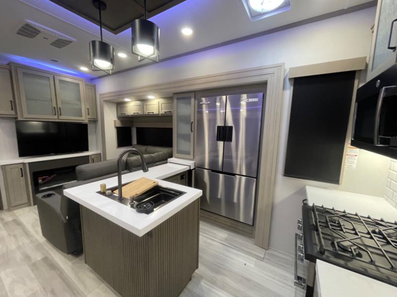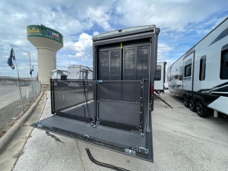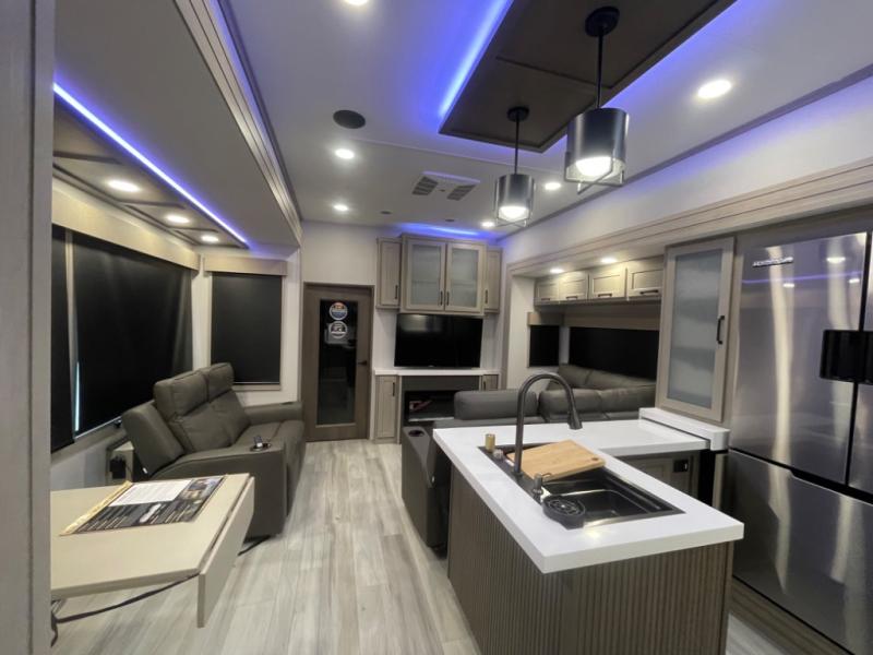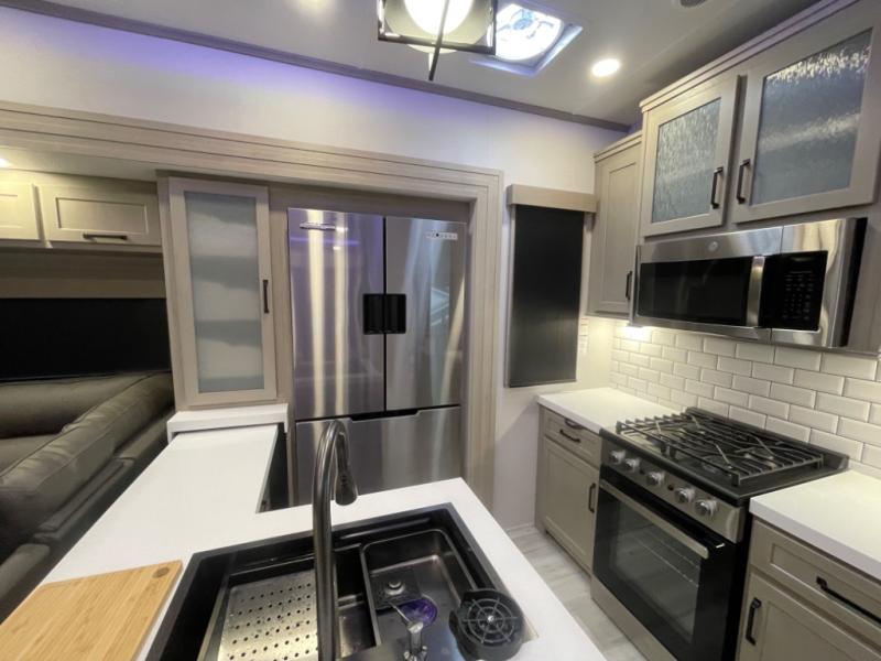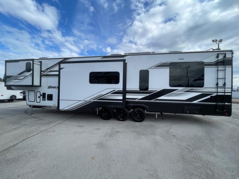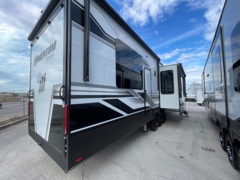 With any Momentum M-Class toy hauler by Grand Design, you will enjoy luxury at every turn! They have been constructed to a superior standard with a thermal roof design, triple insulated main floor and garage floor, and a Rail-Tite underbelly seal that will allow you to camp in all elements. Each model also features an 8' 5" wide body chassis with a wide rail design, no wheel wheels, and a dovetail entry for easier loading. The Stealth A/C system provides maximum cooling power, and the CRE3000 suspension system means you can enjoy a smooth tow each time. You will love the luxurious interior with a professional grade stainless steel cooktop, interior color changing LED accent lighting, a fiberglass shower with a glass door, and solid surface countertops.