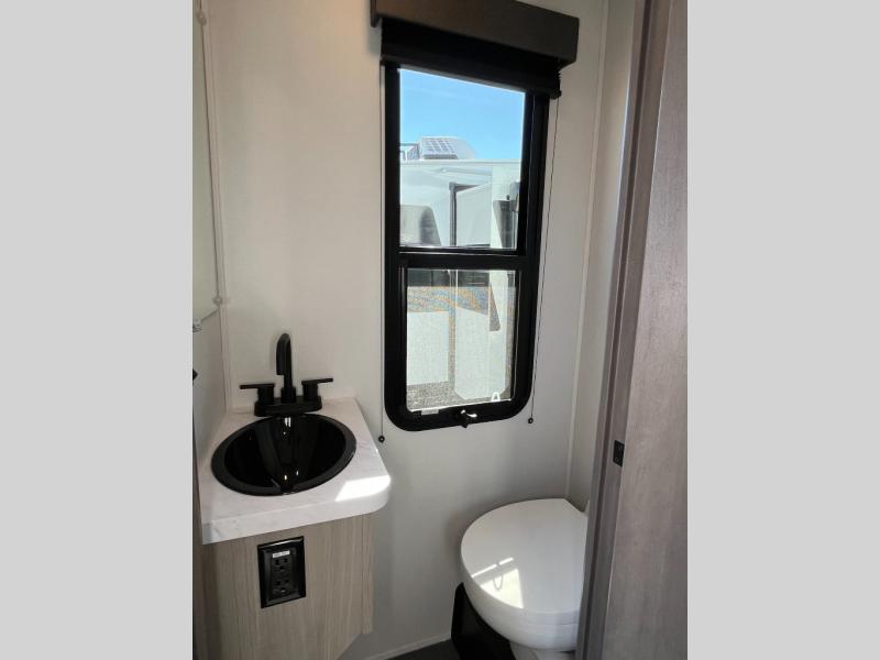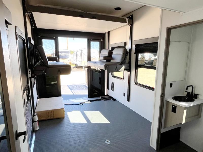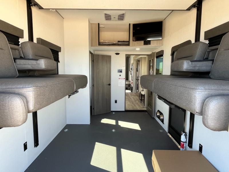 Any time spent in this spacious toy hauler will be time well spent! The 14' garage includes an overhead loft bed and a flip-up pet dish for your furry friends. If you're needing more sleeping space, you might want to choose the optional Happi-Jac rollover sofas and table with a drop down bed and optional half bath! Once you enter in the main living area, you can relax on the tri-fold sofa or theater seating across from the fireplace, and there is a free-standing dinette if you want to play a game or two. The chef of your group will love the generous counter space in the kitchen, and the dual entry bath will let everyone stay clean throughout your trip! Head to the front master bedroom to enjoy the queen bed slide out with an optional king bed, a slide top dresser with TV prep, plus a large front closet, complete with washer and dryer prep!