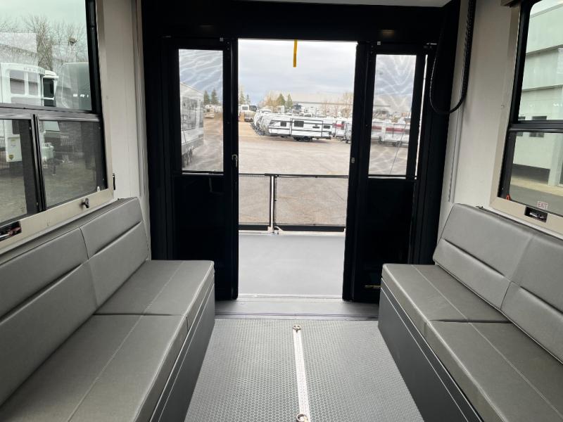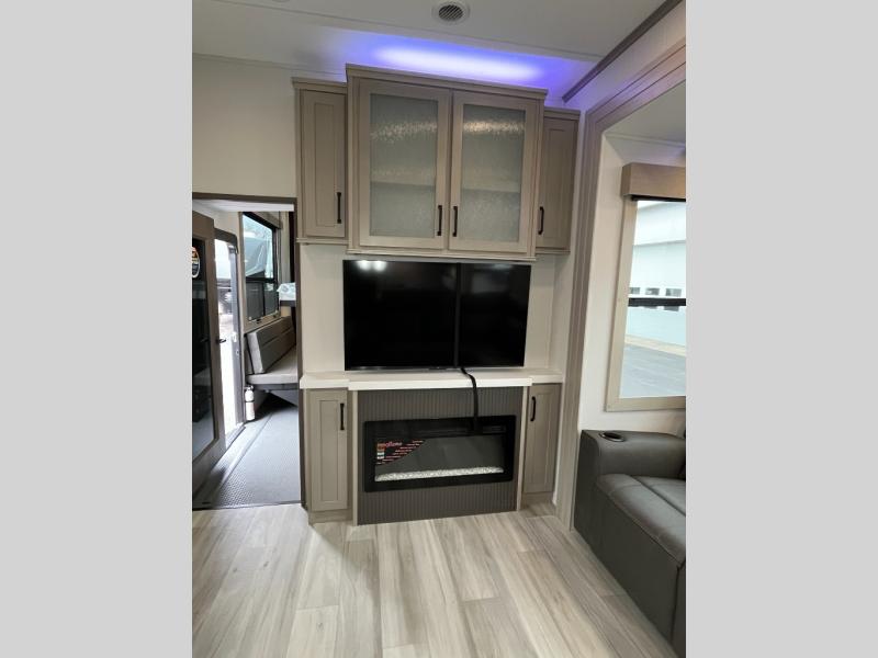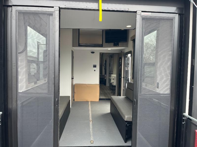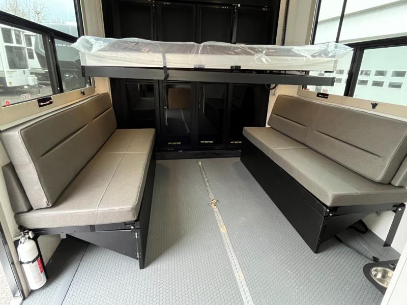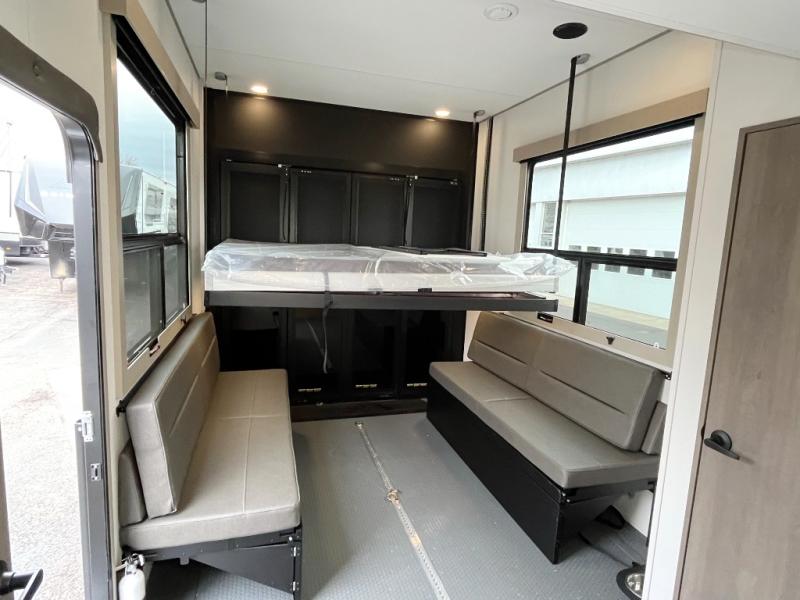Any time spent in this spacious toy hauler will be time well spent! The 14' garage includes an overhead loft bed and a flip-up pet dish for your furry friends. If you're needing more sleeping space, you might want to choose the optional Liftsuite System and optional half bath. Once you enter in the main living area, you can relax on the L-shaped sofa with recline across from the fireplace, and there is a free-standing dinette if you want to play a game or two. The chef of your group will love the generous counter space in the kitchen, and the dual entry bath will let everyone stay clean throughout your trip! Head to the front master bedroom to enjoy the queen bed slide out with an optional king bed, a slide top dresser with TV prep, plus a large front closet, complete with washer and dryer prep!