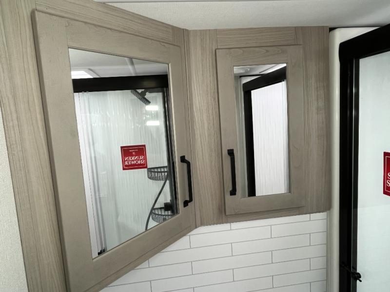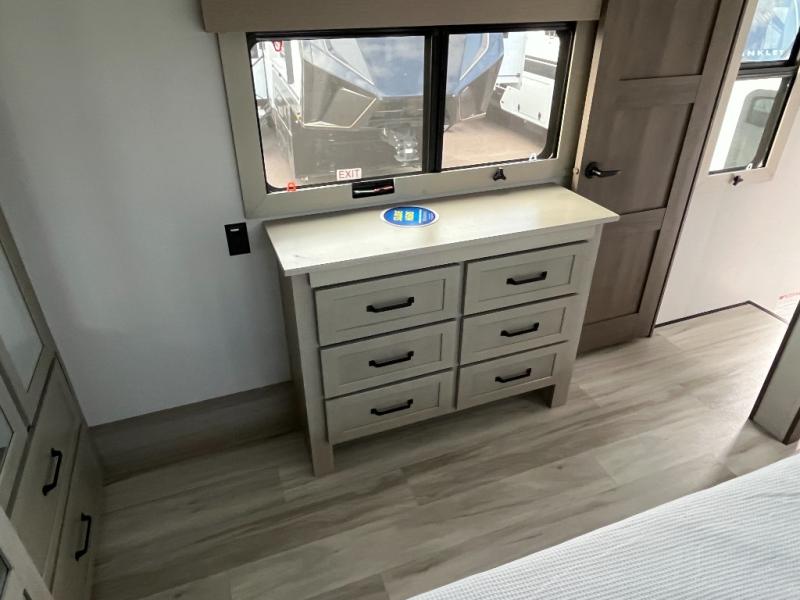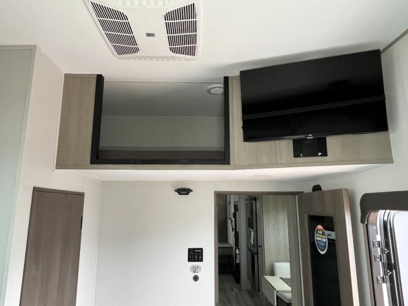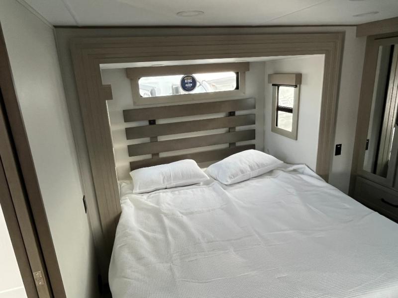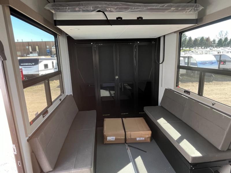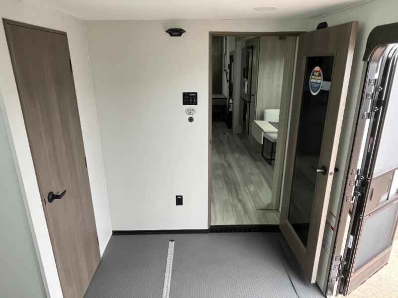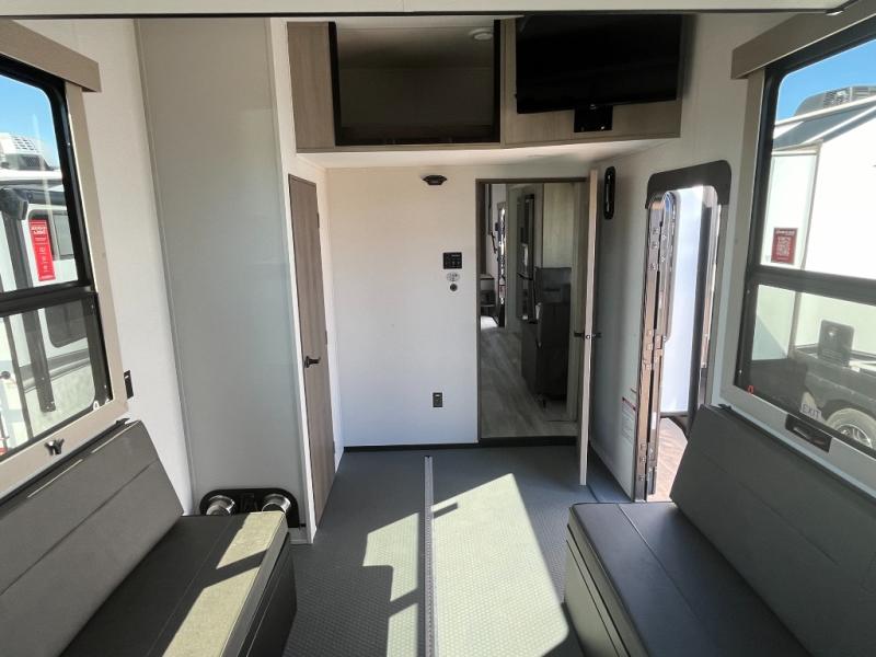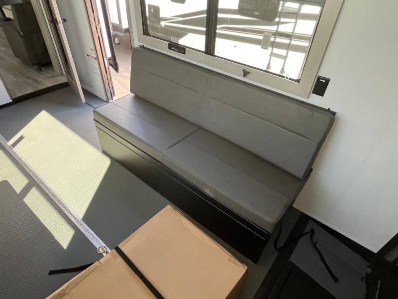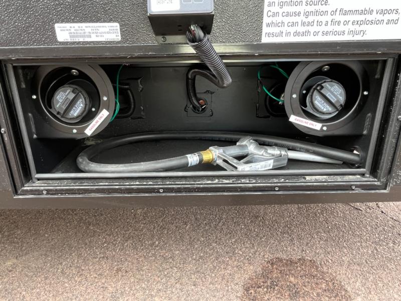 Any time spent in this spacious toy hauler will be time well spent! The 14' garage includes an overhead loft bed and a flip-up pet dish for your furry friends. If you're needing more sleeping space, you might want to choose the optional Liftsuite System and optional half bath. Once you enter in the main living area, you can relax on the L-shaped sofa with recline across from the fireplace, and there is a free-standing dinette if you want to play a game or two. The chef of your group will love the generous counter space in the kitchen, and the dual entry bath will let everyone stay clean throughout your trip! Head to the front master bedroom to enjoy the queen bed slide out with an optional king bed, a slide top dresser with TV prep, plus a large front closet, complete with washer and dryer prep!