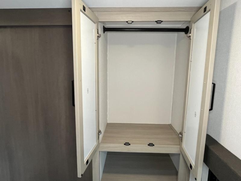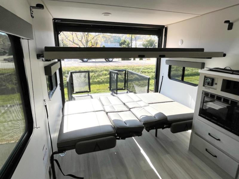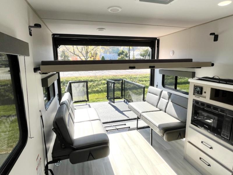 You will love this Momentum MAV toy hauler travel trailer! The front bedroom features a queen bed, and there is plenty of room to walk around. The sliding solid bedroom door helps with space. Overhead storage and a pair of nightstands are convenient storage, plus there is a wardrobe with both drawers and space to hang items. The kitchen offers a microwave, stainless steel sink, and an 8 cu. ft. 12V refrigerator. In the garage, you'll find rollover sofas with a table and a top bed for guests to sleep on. The ramp door/patio will provide additional living space once your toys are unloaded, and the pull down screen will keep bugs out!