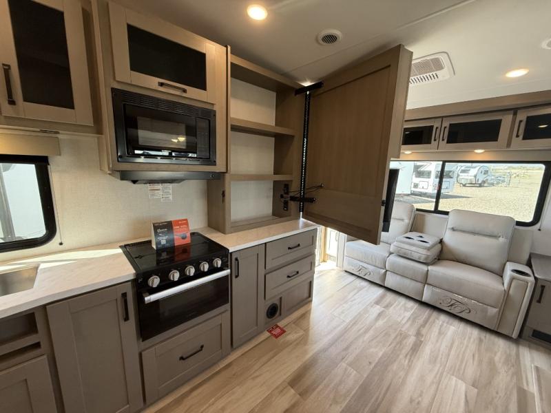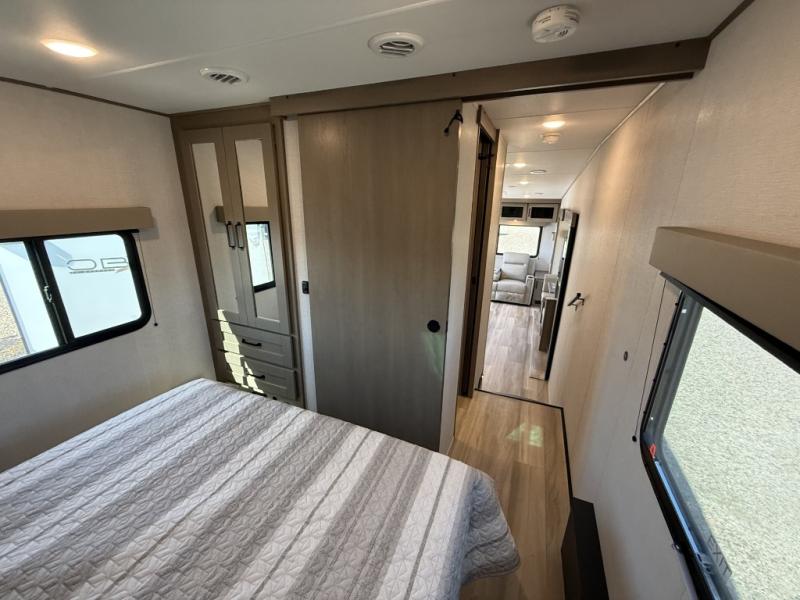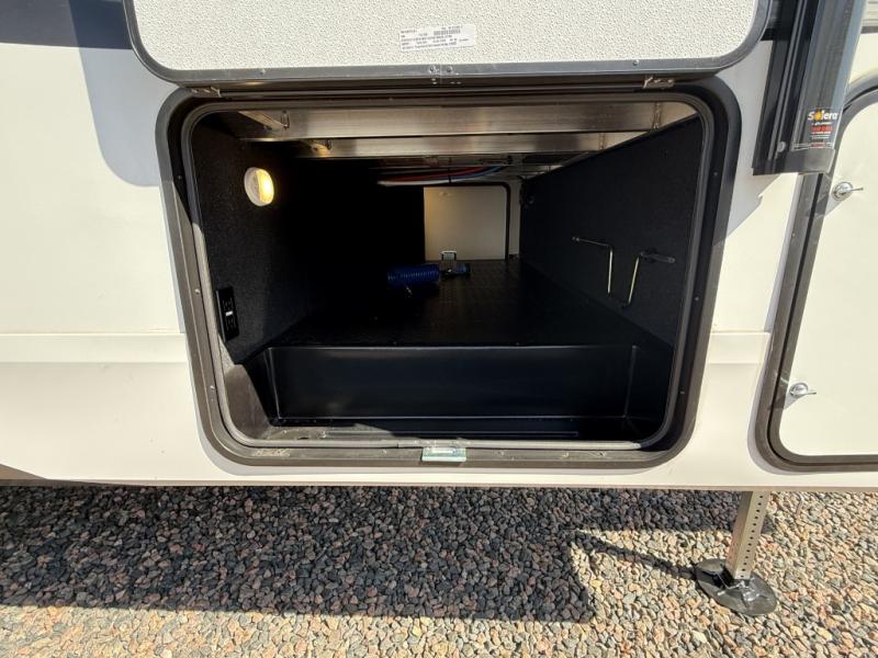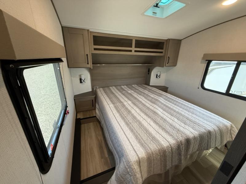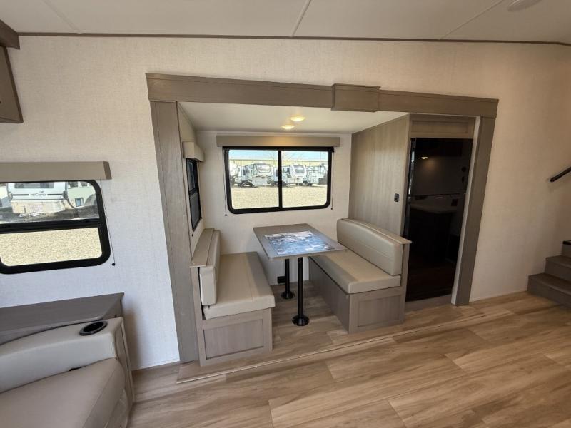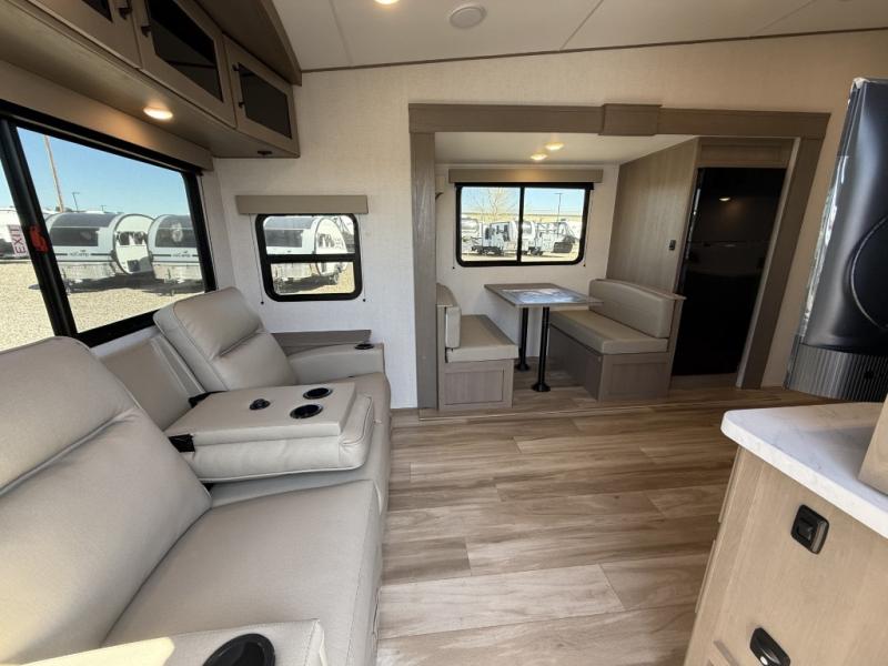 This is the perfect couple's trailer with a space for an overnight guest or two little ones on the booth dinette. You can switch out this dinette for an optional swivel dinette as well, and the standard theater seating can be replaced by an optional trundle bed if you need more sleeping space. A 40" HDTV will keep you entertained when the weather isn't cooperating, and you can whip up your best meals in the full kitchen. And a 19' power awning will provide shade if you choose to take your plate outdoors! The spacious full bath will let you clean up each day, and you'll feel right at home in the front private bedroom with a queen bed!