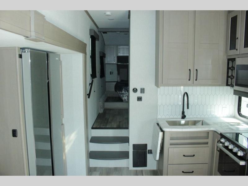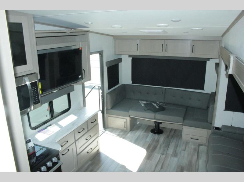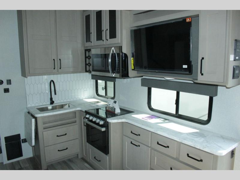 With any Reflection 150 Series fifth wheel by Grand Design, there is more available payload capacity and a broader range of half-ton trucks capable of towing this fifth wheel, and no slider hitch is needed thanks to the 90-degree turning radius which makes them short bed friendly and easier to tow. The mandatory Ultimate Power package provides a "One-Touch" automatic leveling system and a detachable power cord with LED light for easy setup, plus motion sensor pass-through lighting and entry lighting, and the Tire Linc TPMS will help you stay safe on the road. The interior offers residential luxury from the cabinetry and premium Congoleum flooring, to the booth dinette and residential-style window treatment. Make your refined decision today!
