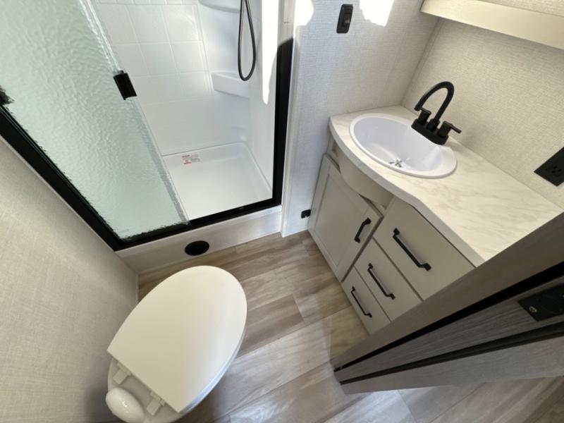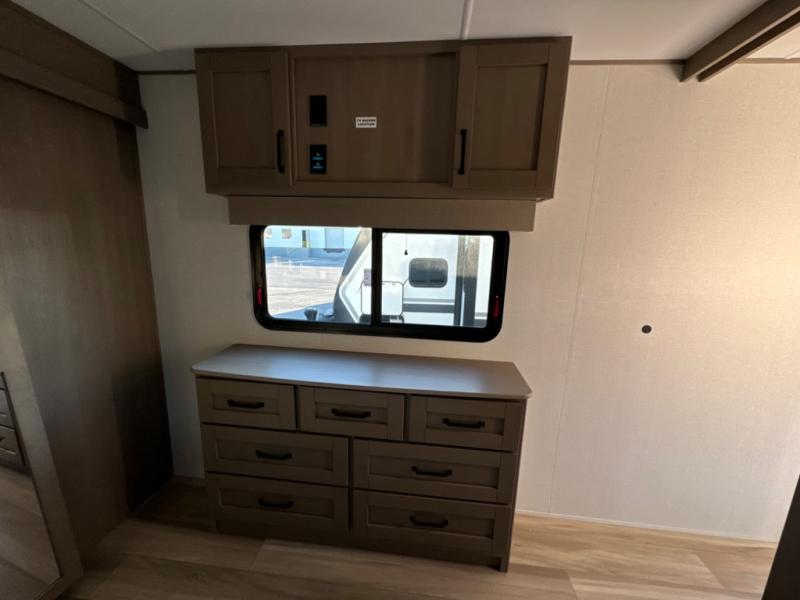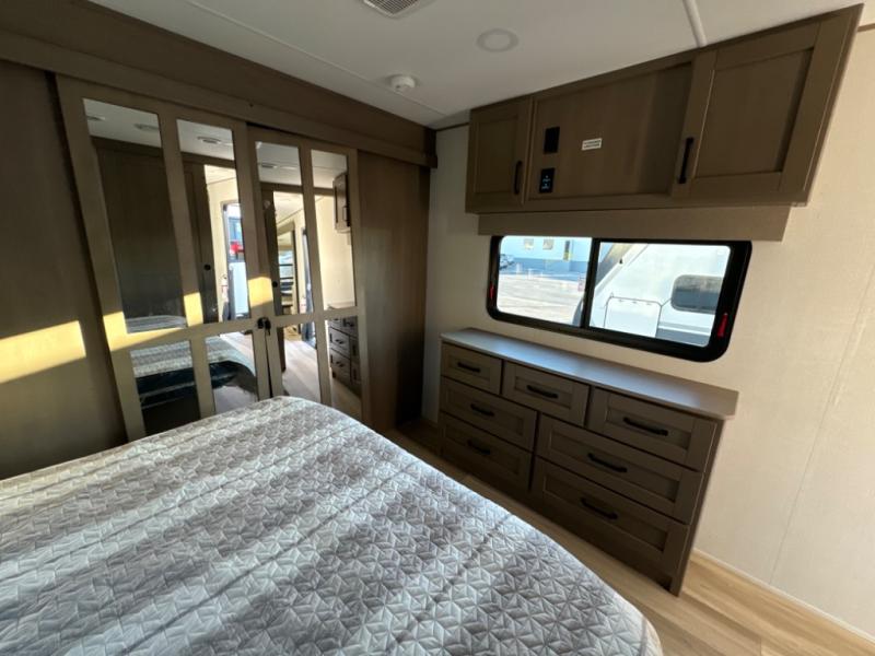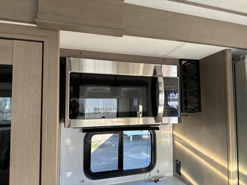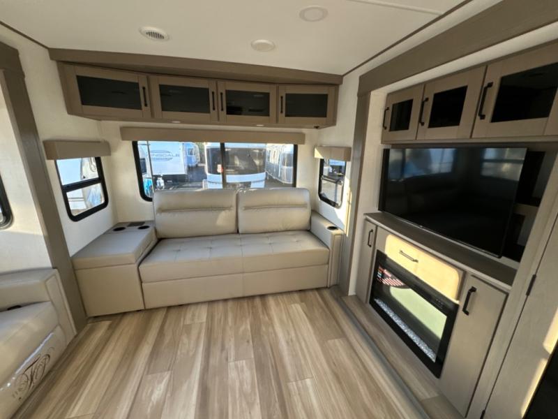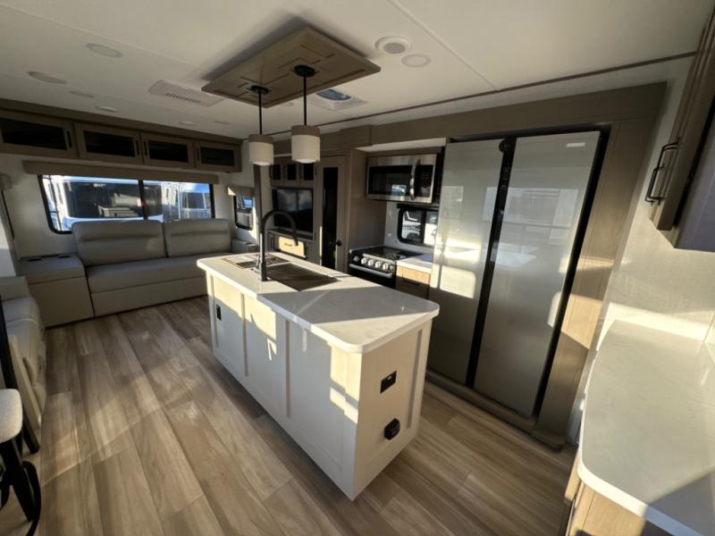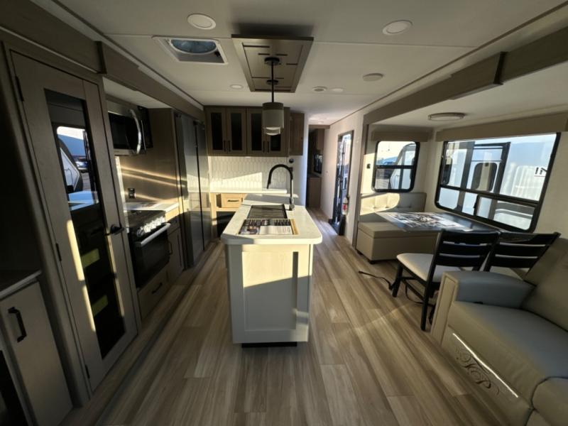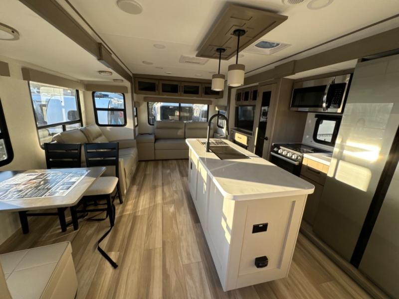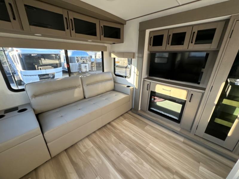 The chef of the group will love the gourmet kitchen including the 16 cu. ft. refrigerator that will hold lots of cold ingredients, beverages and leftovers, the center island when preparing and serving meals, and the hutch with overhead cabinets to display and store dishes and such. This area also includes two slide outs for more floor space and furniture to relax on including theater seating with cupholders for your drinks, a booth dinette to dine at and work from or choose a free standing dinette option, and a rear tri-fold sofa that offers sleeping space for two at night. There is a 40" LED HDTV with fireplace below to enjoy while inside, plus there are two awnings outdoors to relax under. When you are ready to call it a night, get cleaned up in the full bathroom, and retire to your front bedroom with a slide out queen bed or choose a king option, a front full-wall wardrobe with washer/dryer prep, a dresser and an additional wardrobe with drawers.