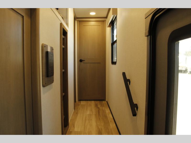 Travel to see new state parks, RV resorts or your family in other states as you tow this fifth wheel to each destination! You will enjoy comfort and convenience, plus a place to work, and be able to offer extra sleeping space for friends and family when they visit. The middle extra room provides a tri-fold sofa slide, a desk, a wardrobe, plus a 64" x 88" upper bed loft area with access from the hallway. The full bathroom will keep everyone refreshed, and the front bedroom allows you to sleep on a queen bed slide or choose the king option. And you will love the front wardrobe, the dresser, and the option to add a washer/dryer. The main living and kitchen area provides plenty of seating from the rear tri-fold sofa, the booth dinette or swivel dinette option, and the theater seats with cupholders. And the kitchen island, appliances, and large pantry allow you to take everything you need with you.