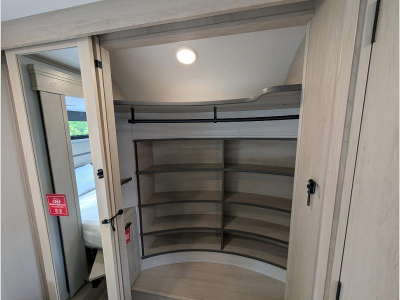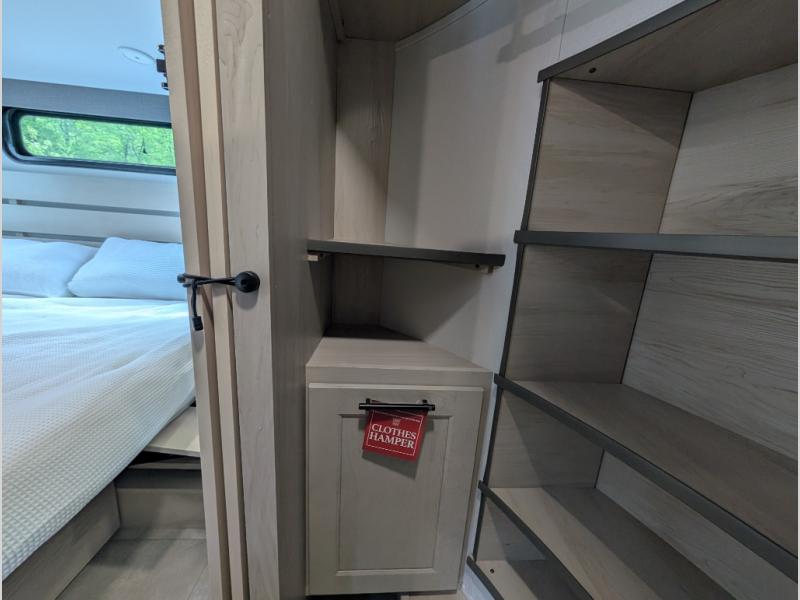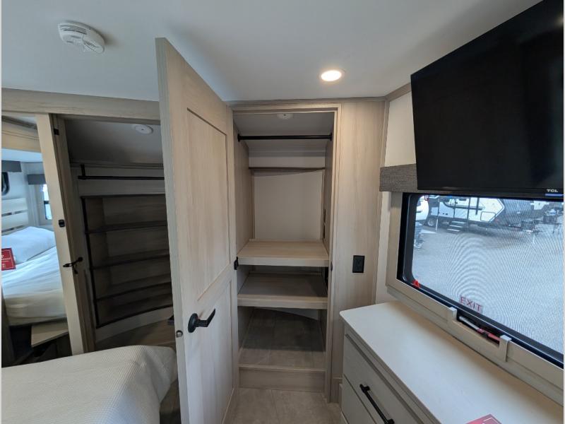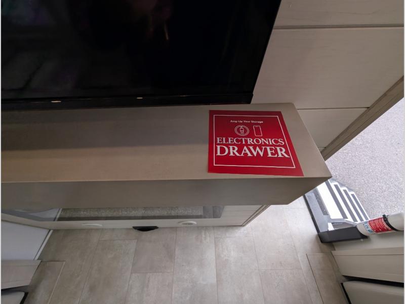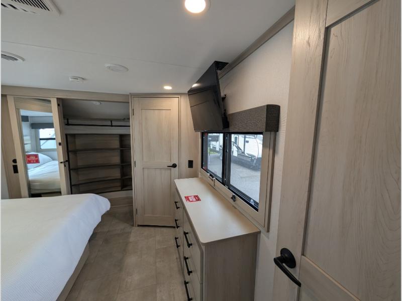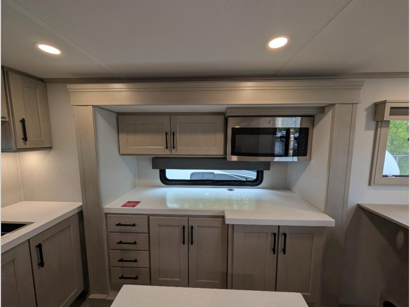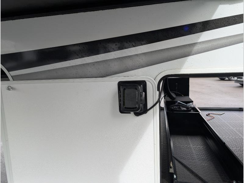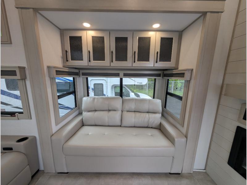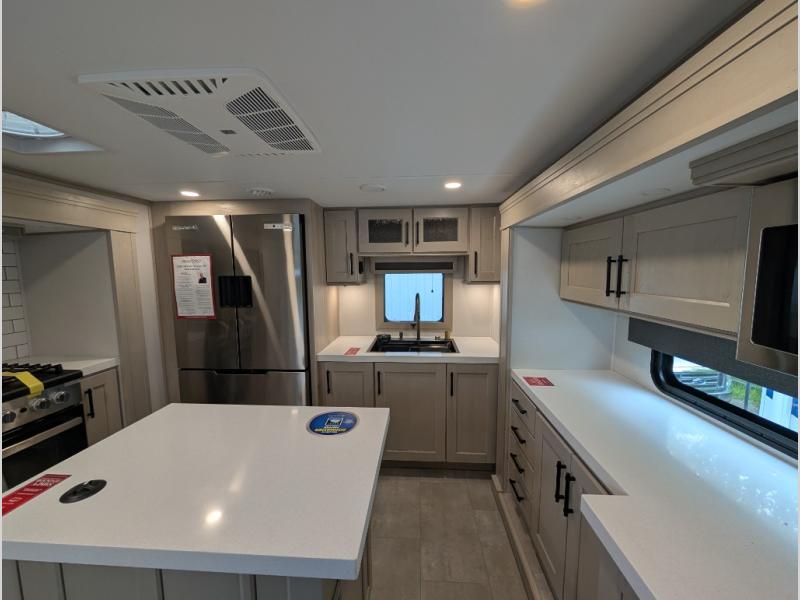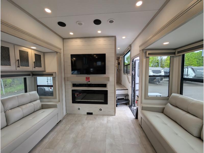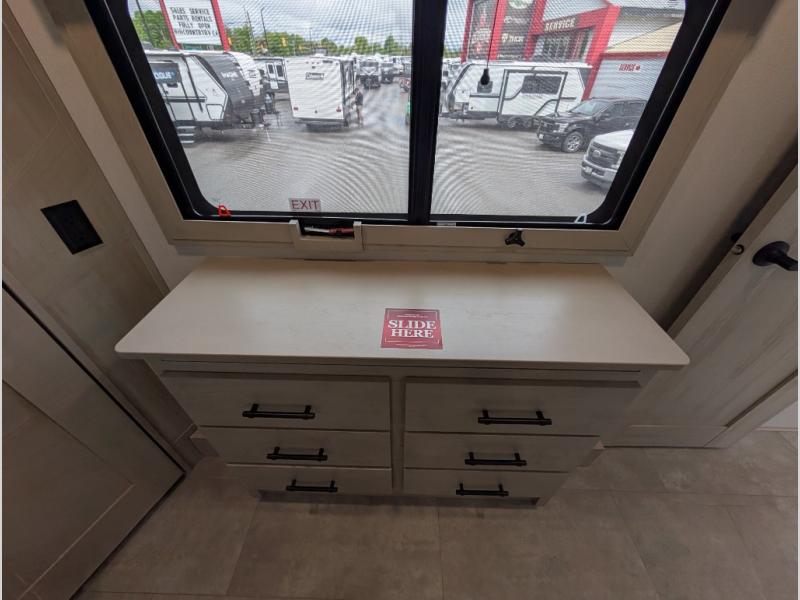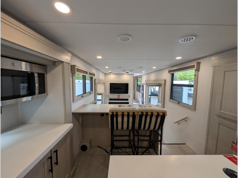 Enjoy each and every vacation, month-long trips, or even extended stays at an RV park in this spacious fifth wheel! The raised rear kitchen gives the cook plenty of room to whip up any type of meal using the stainless steel appliances including a built-in oven, an oversized pantry, and the raised bar top will provide you even more counter space on top of dining with two chairs that overlook the middle living area. Relaxing is made easy thanks to two tri-fold sofas and theatre seating while watching the big game on the LED Smart TV and enjoying the fireplace below. At night, retire to your own queen bed which slides out to provide more floor space, and you can store your clothes in the slide top dresser and front closet with washer and dryer prep.