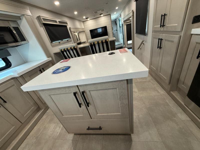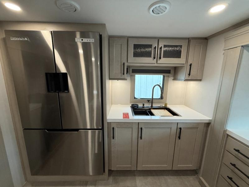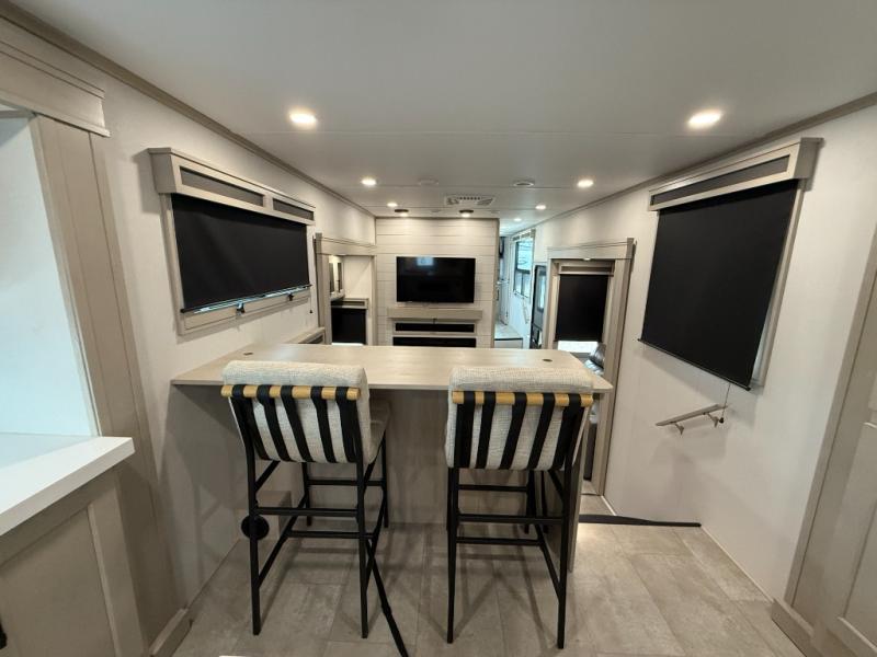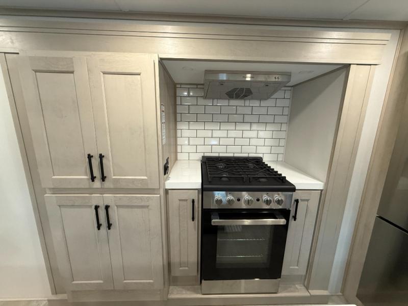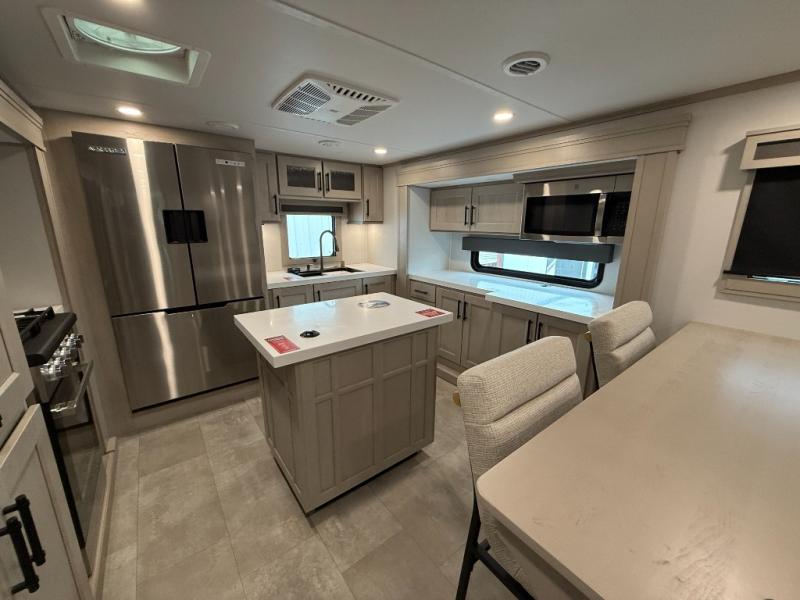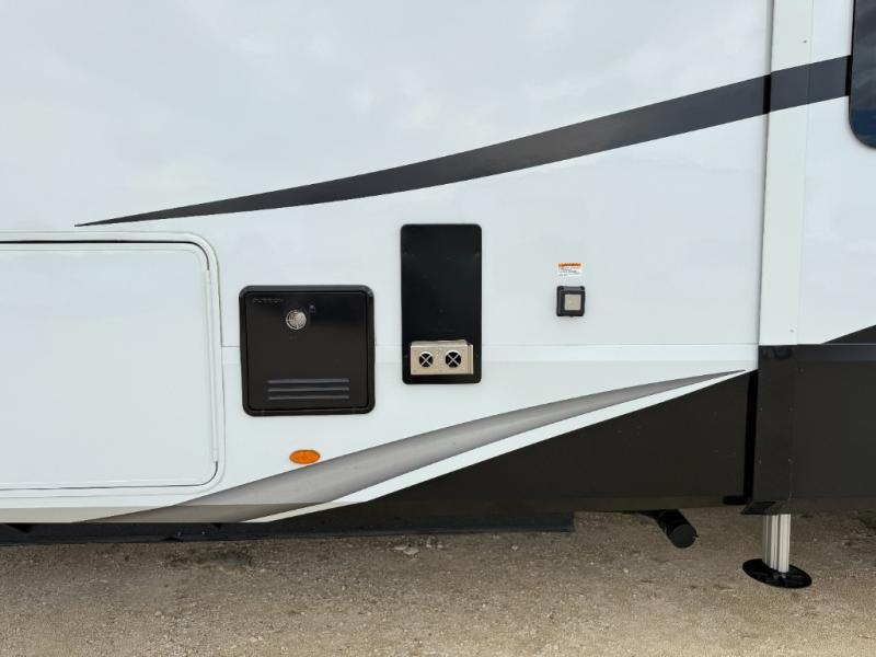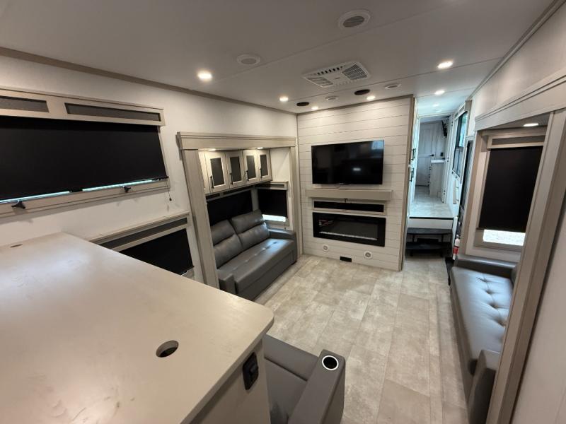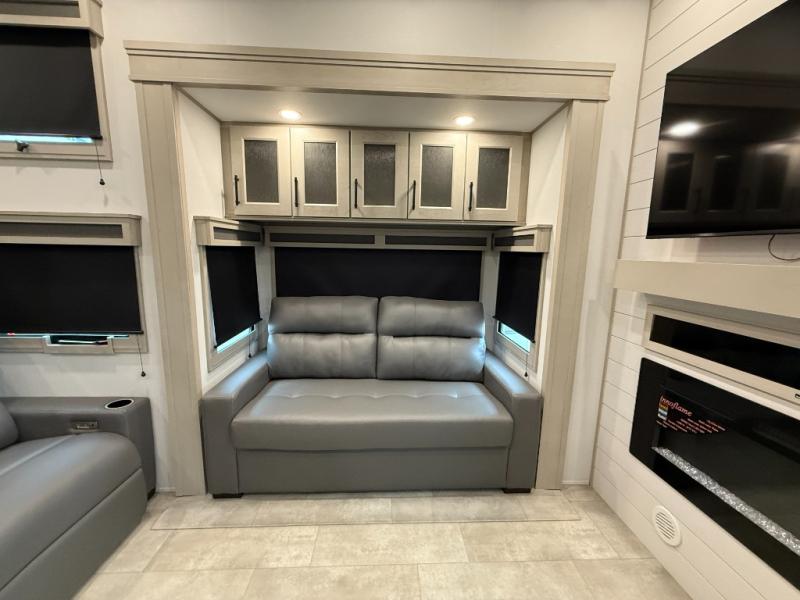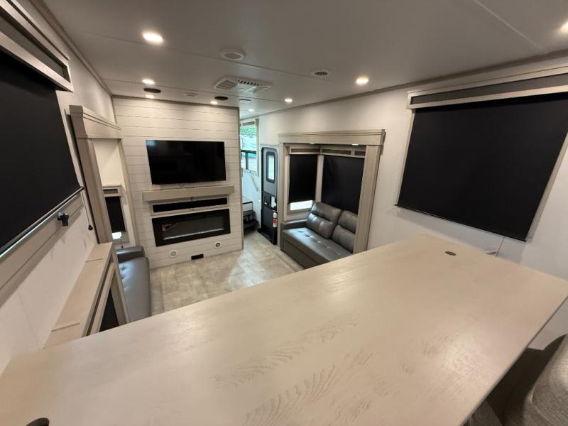 Enjoy each and every vacation, month-long trips, or even extended stays at an RV park in this spacious fifth wheel! The raised rear kitchen gives the cook plenty of room to whip up any type of meal using the stainless steel appliances including a built-in oven, an oversized pantry, and the raised bar top will provide you even more counter space on top of dining with two chairs that overlook the middle living area. Relaxing is made easy thanks to two tri-fold sofas and theatre seating while watching the big game on the LED Smart TV and enjoying the fireplace below. At night, retire to your own queen bed which slides out to provide more floor space, and you can store your clothes in the slide top dresser and front closet with washer and dryer prep.