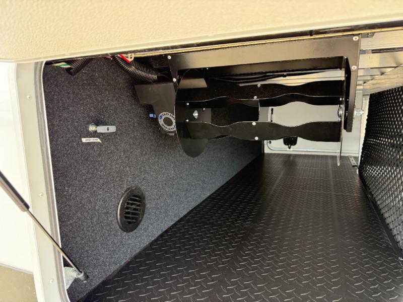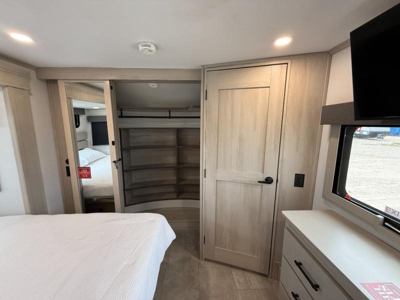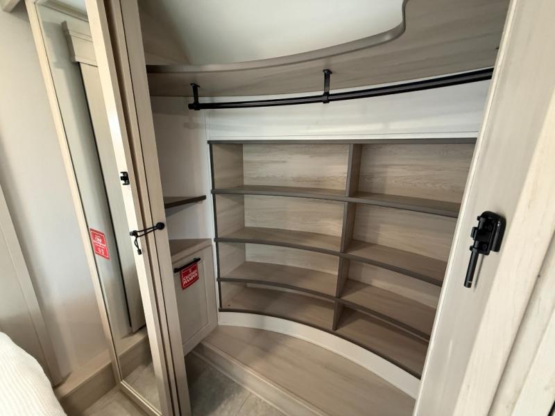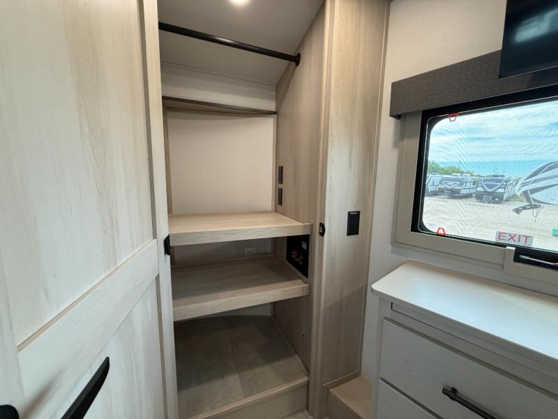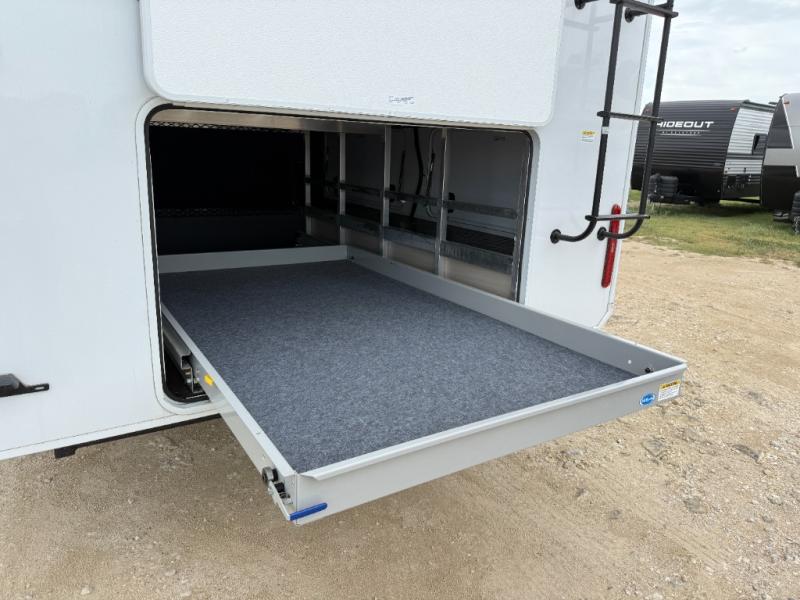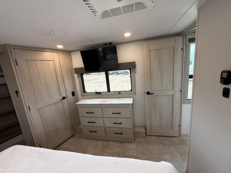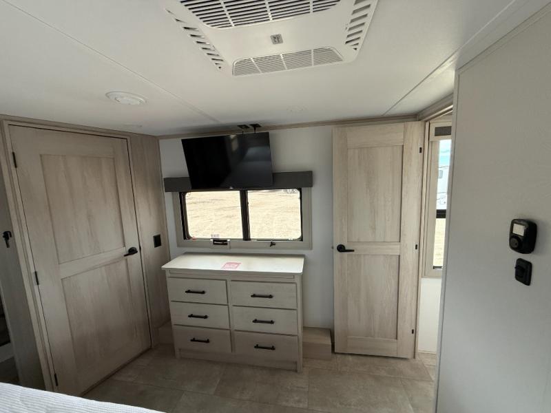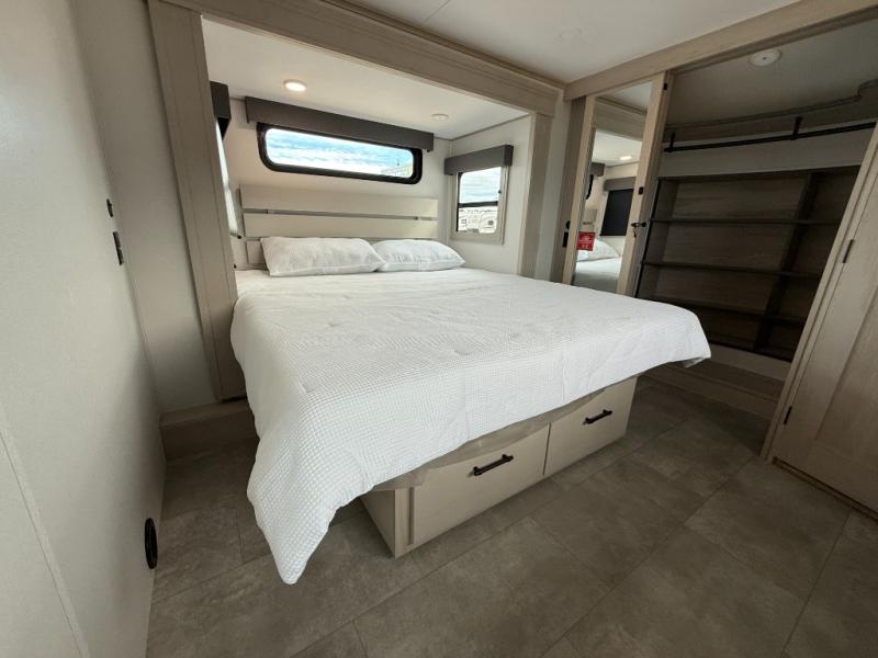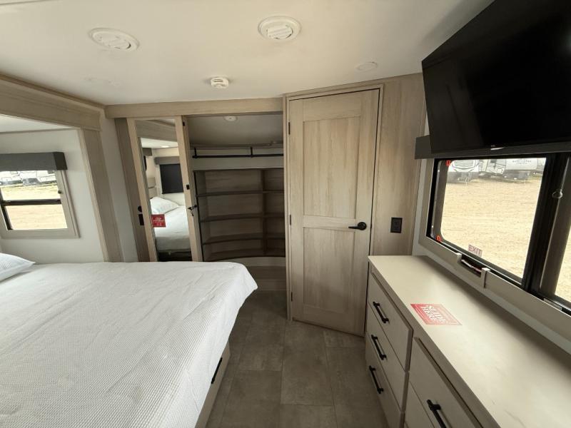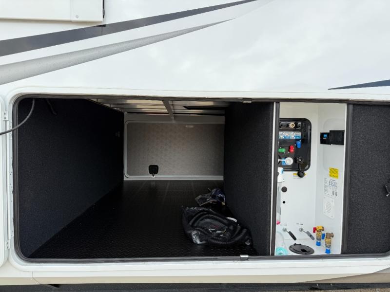 Enjoy each and every vacation, month-long trips, or even extended stays at an RV park in this spacious fifth wheel! The raised rear kitchen gives the cook plenty of room to whip up any type of meal using the stainless steel appliances including a built-in oven, an oversized pantry, and the raised bar top will provide you even more counter space on top of dining with two chairs that overlook the middle living area. Relaxing is made easy thanks to two tri-fold sofas and theatre seating while watching the big game on the LED Smart TV and enjoying the fireplace below. At night, retire to your own queen bed which slides out to provide more floor space, and you can store your clothes in the slide top dresser and front closet with washer and dryer prep.