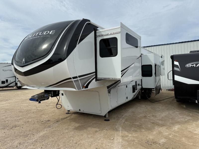 Each Solitude fifth wheel by Grand Design features a 101" wide-body construction, heavy duty 8,000 lb. axles, frameless tinted windows, and high-gloss gel coat sidewalls. You can camp year around thanks to the Weather-Tek Package that includes a 35K BTU high-capacity furnace, an all-in-one enclosed and heated utility center, and a fully enclosed underbelly with heated tanks and storage. Inside, you'll love the premium roller shades, hardwood cabinet doors, solid surface countertops, plus residential finishes throughout to make you truly feel at home. Each model also includes a MORryde CRE3000 suspension system, self adjusting brakes, and a MORryde pin box that will provide smooth towing from home to campground. Affordable luxury is possible with the Solitude fifth wheels; choose yours today!